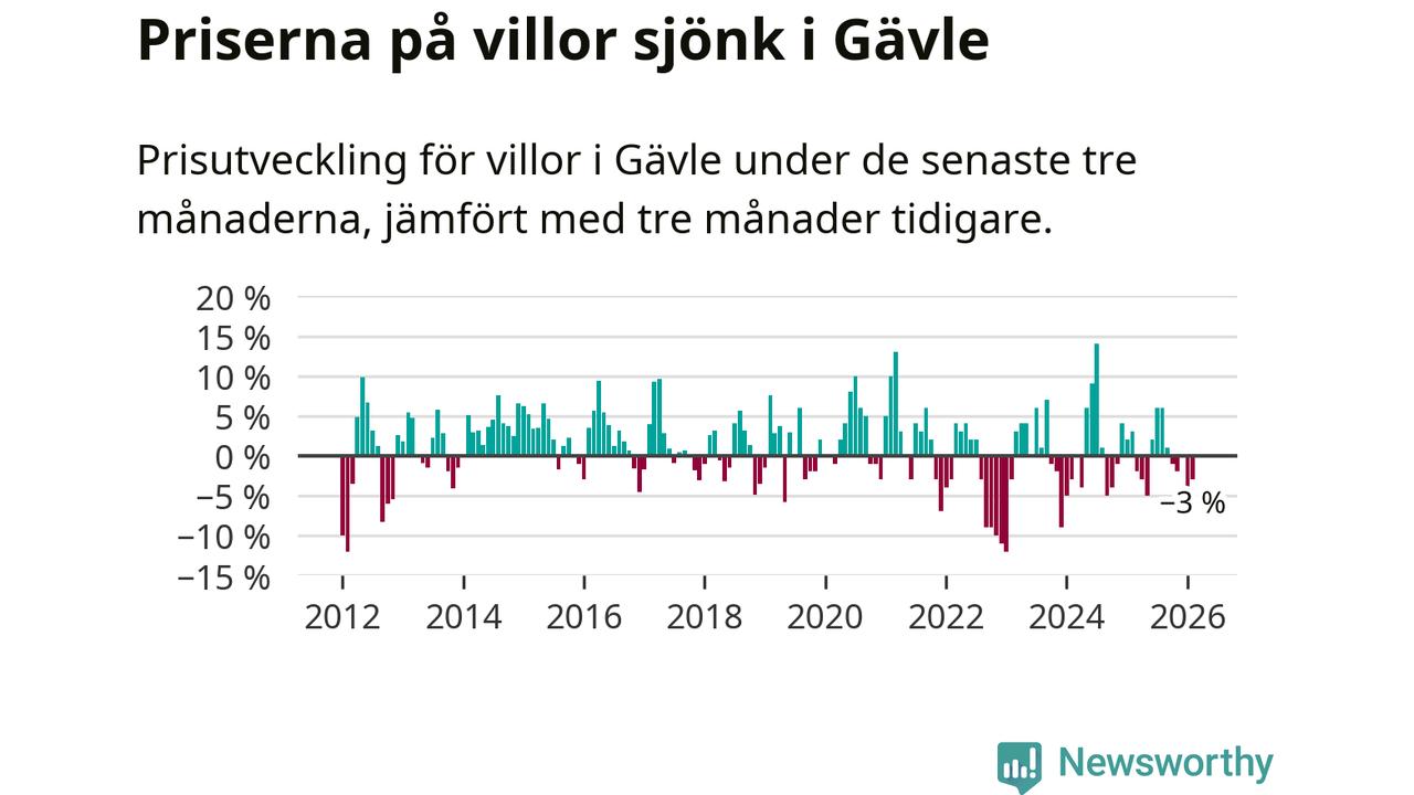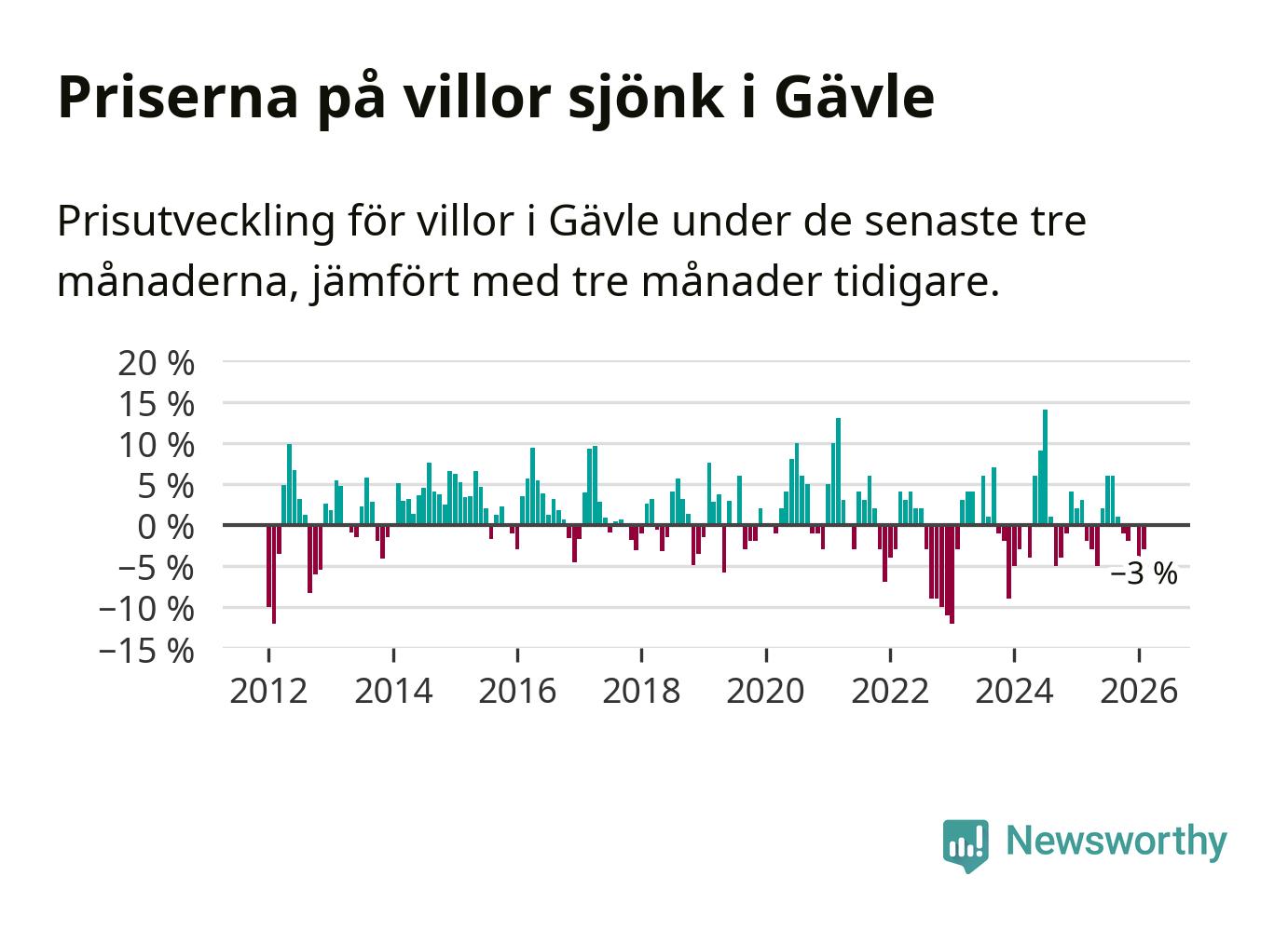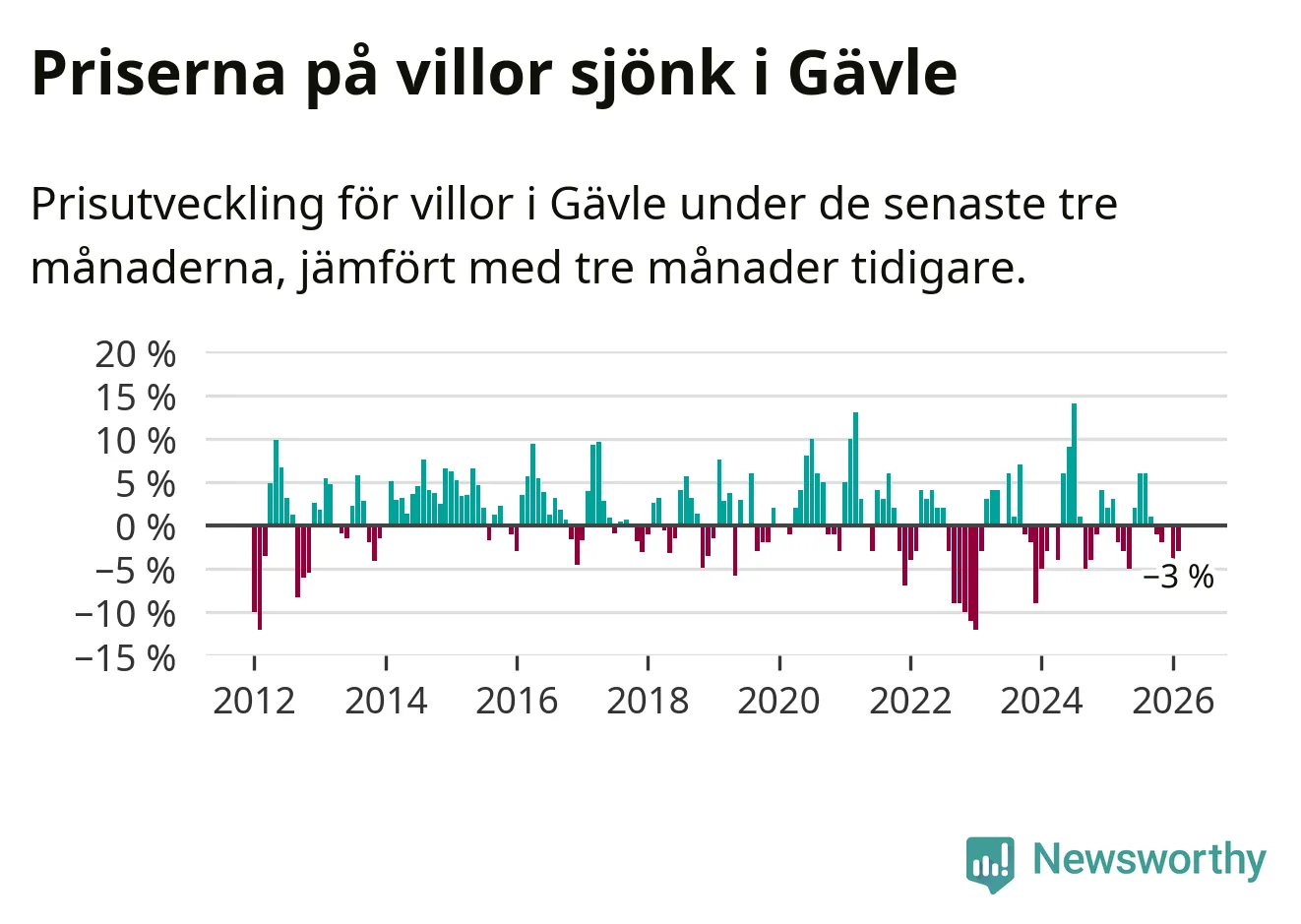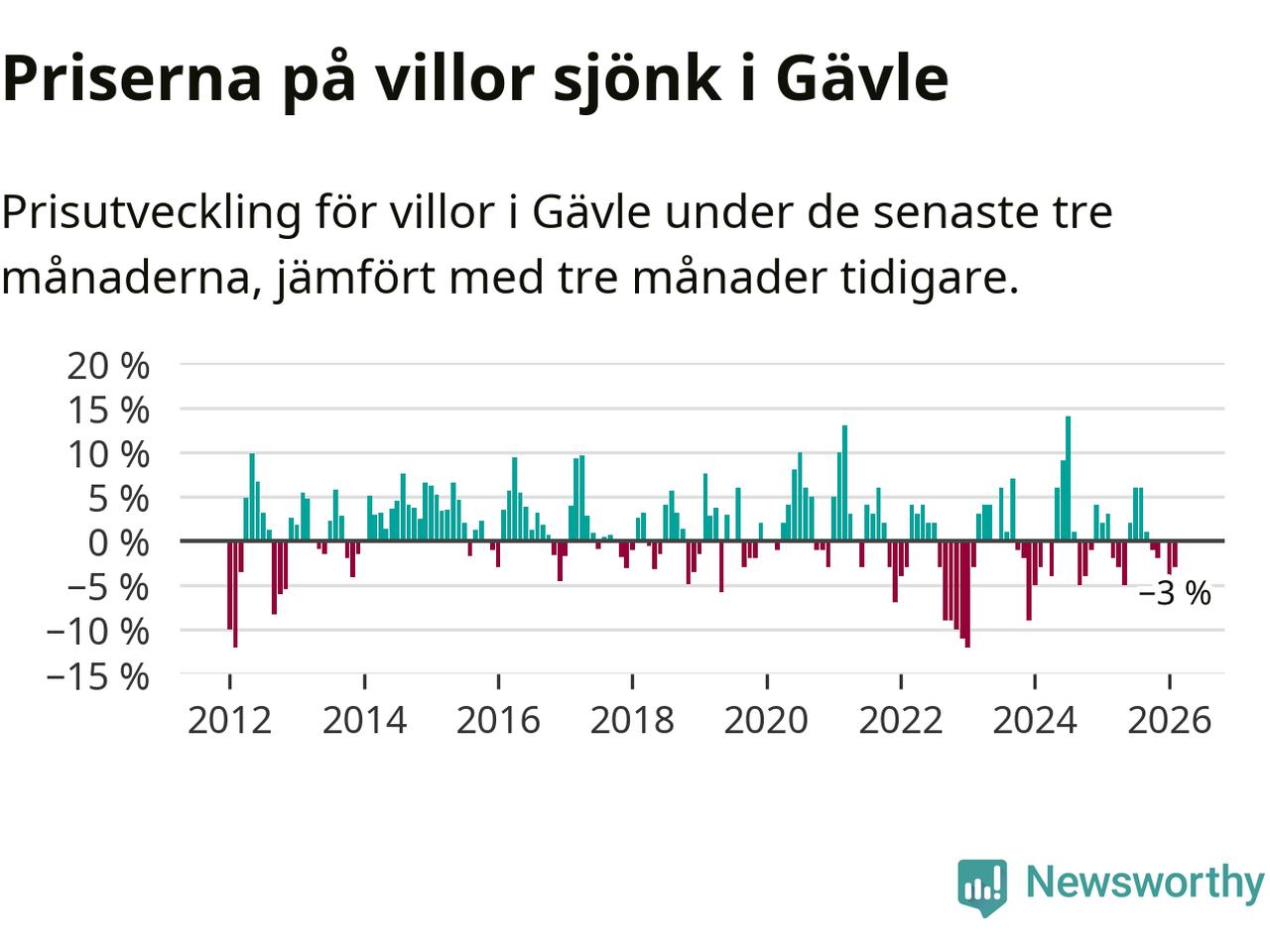 Villapriserna har gått ner i Gävle kommun. Medelpriset på försäljningarna under de senaste tre månaderna visar på en nedgång med 3 procent.