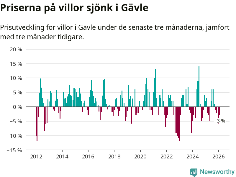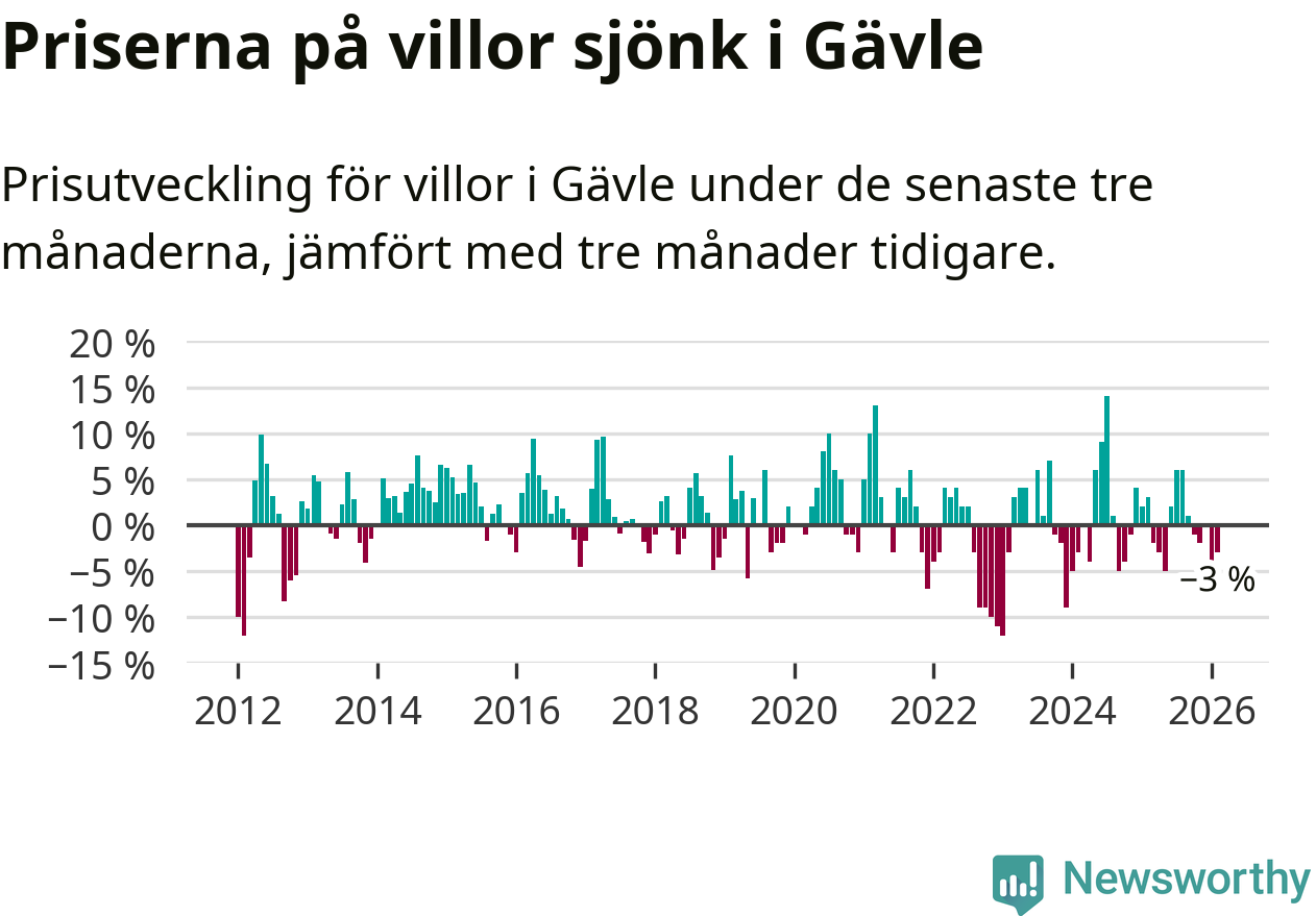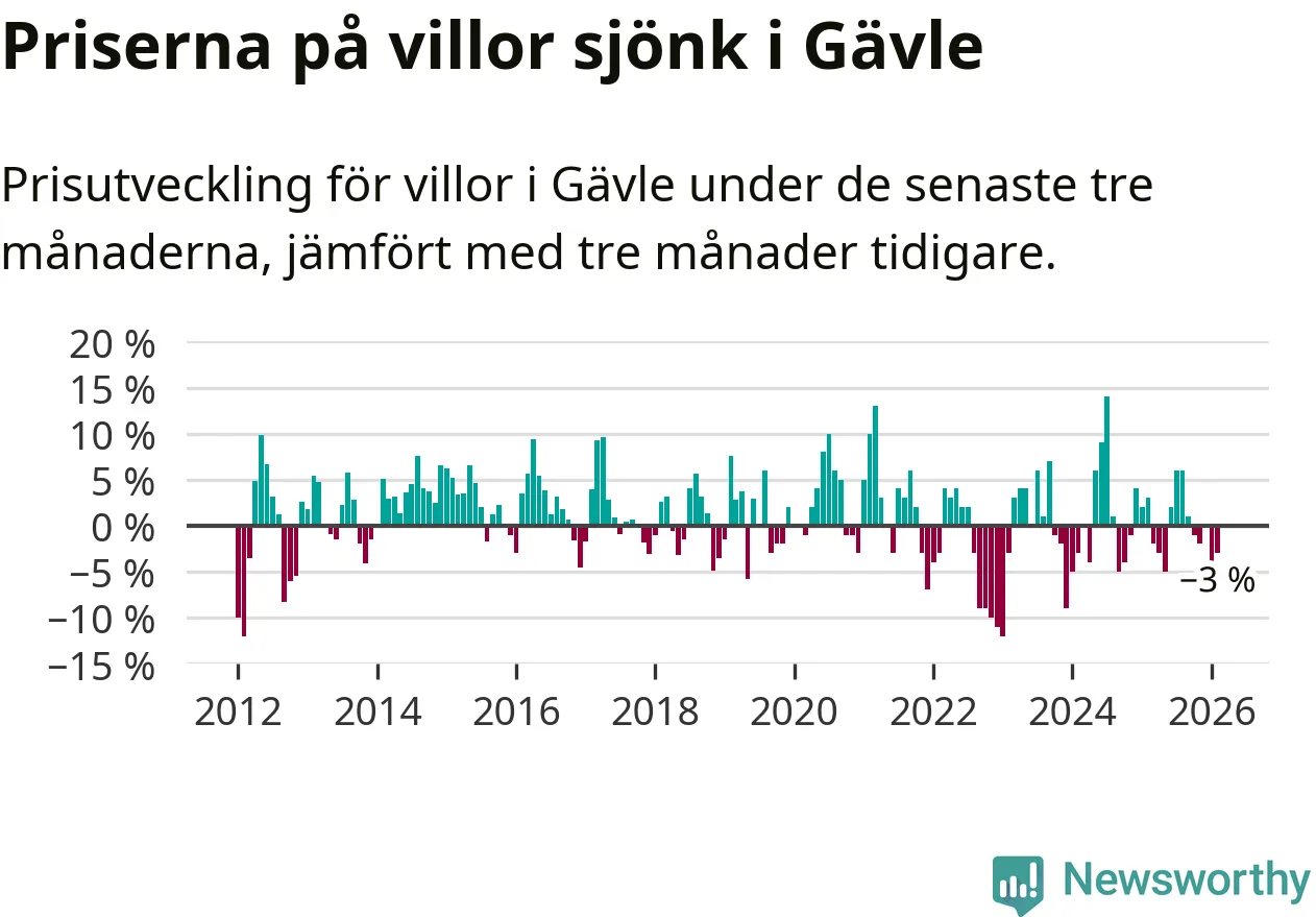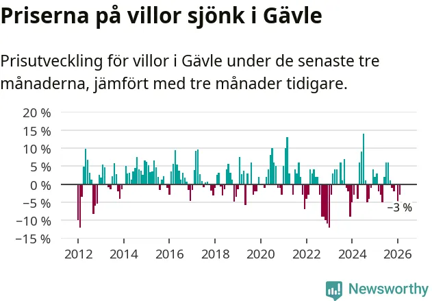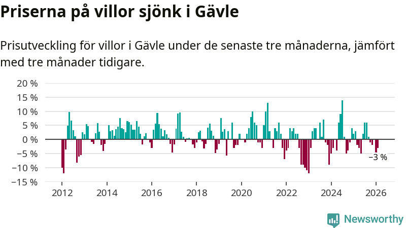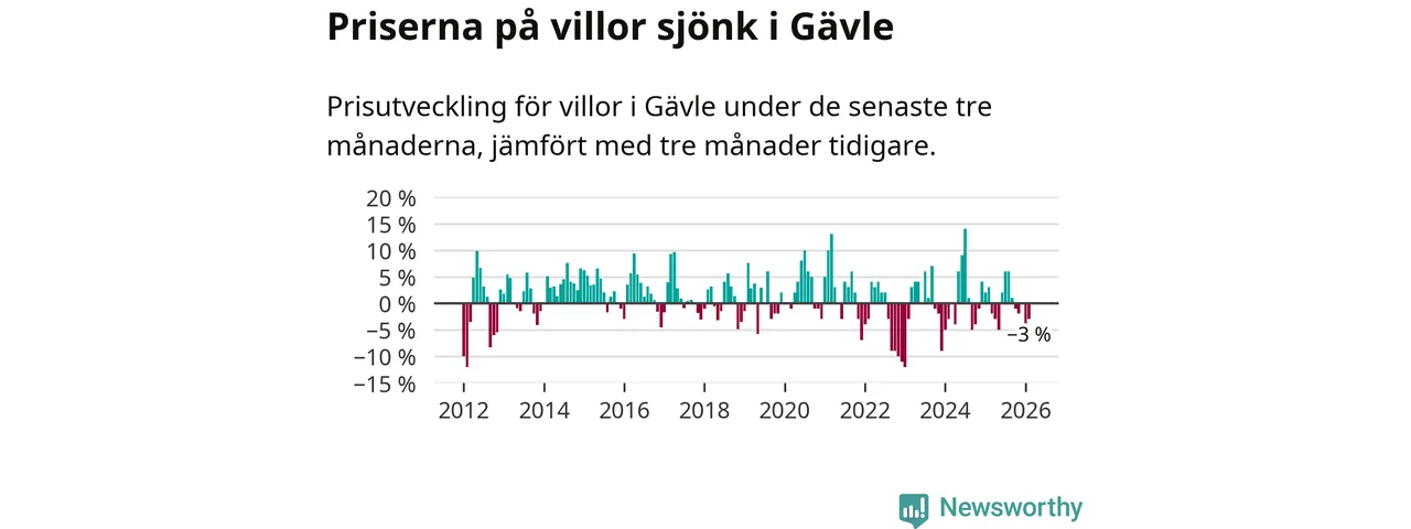 Villapriserna har gått ner i Gävle kommun. Medelpriset på försäljningarna under de senaste tre månaderna visar på en nedgång med 3 procent.