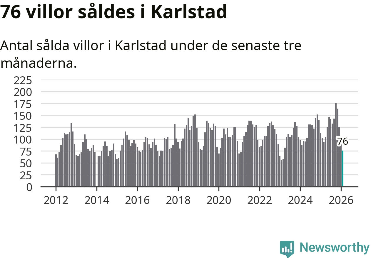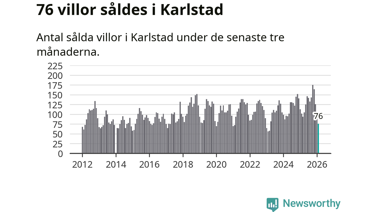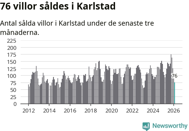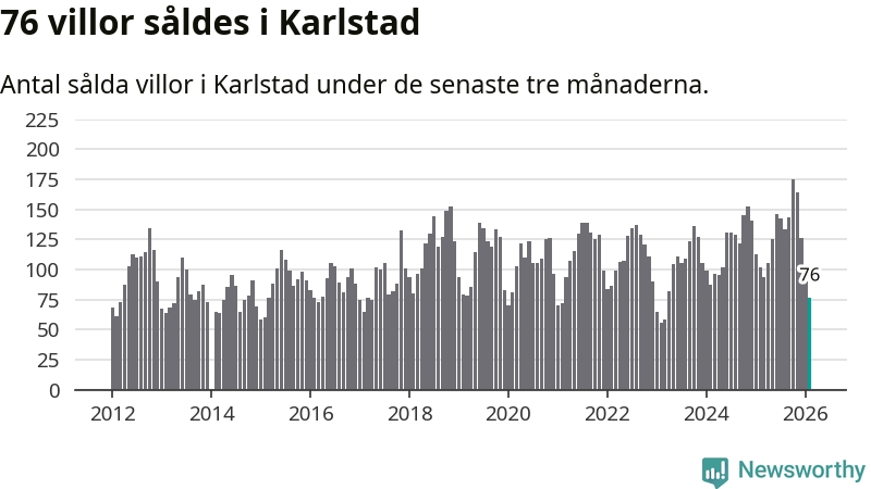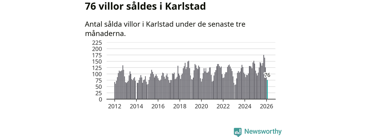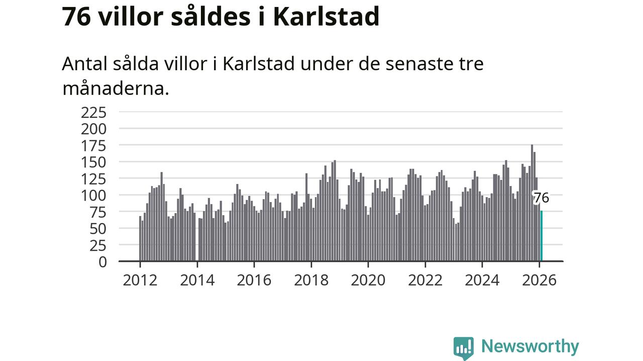 Sammanlagt såldes 76 villor i Karlstads kommun mellan december och februari till ett genomsnittligt pris på 3,4 miljoner kronor. I fjol gjordes 102 affärer vid den här tiden på året.