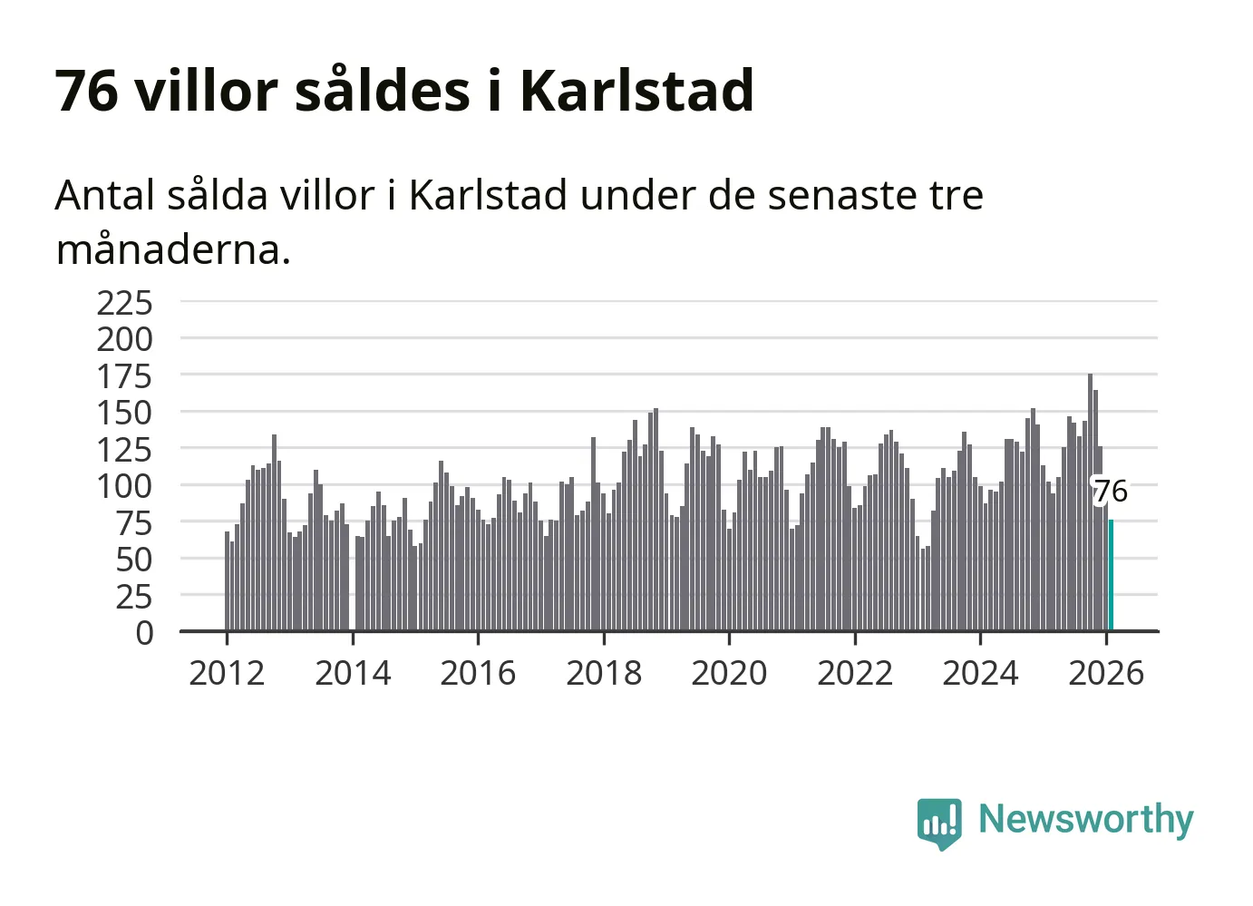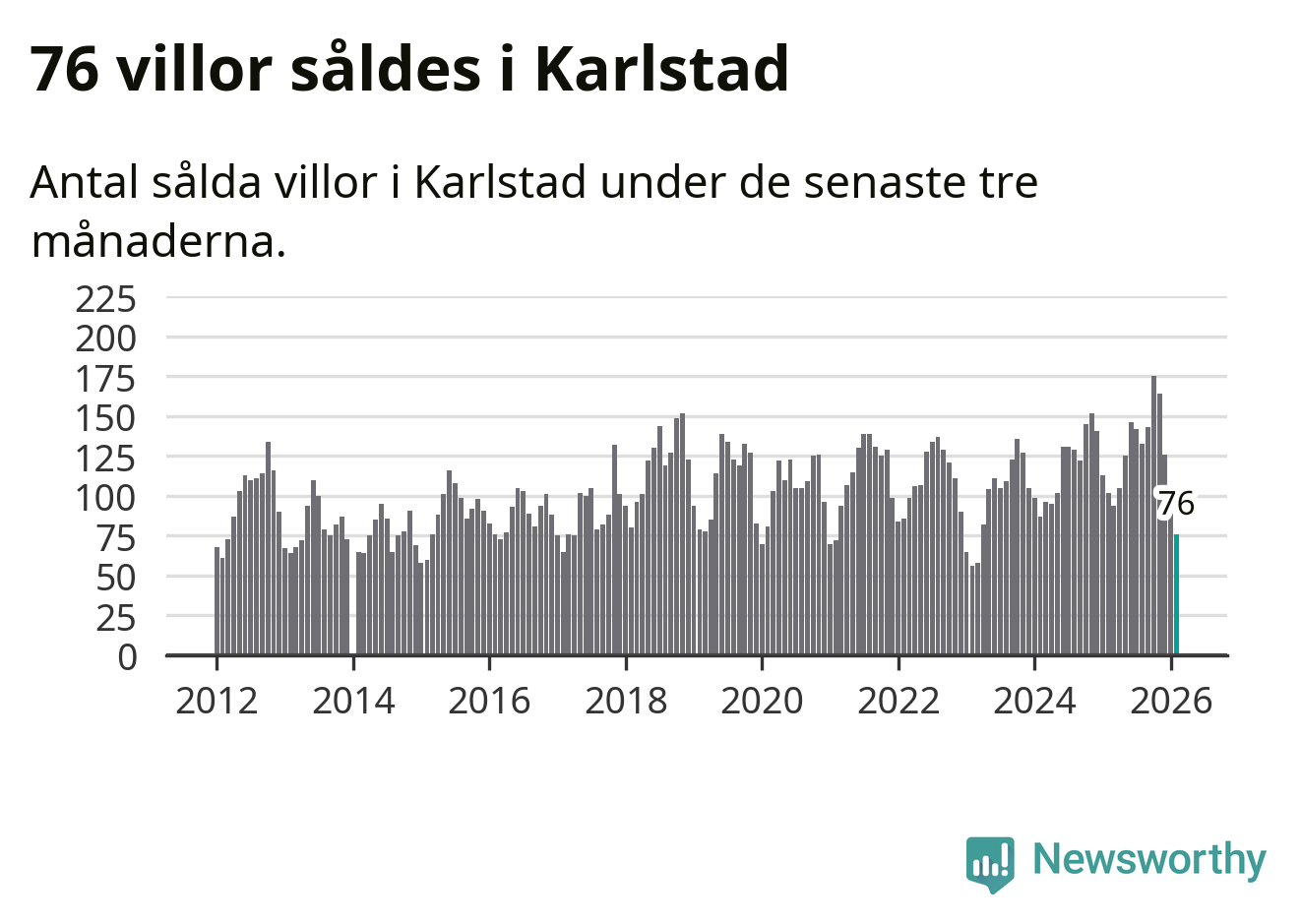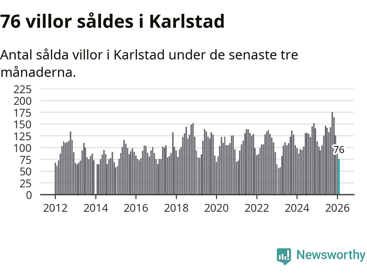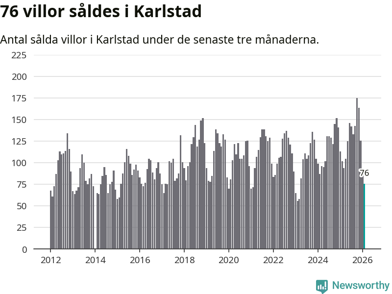 Sammanlagt såldes 76 villor i Karlstads kommun mellan december och februari till ett genomsnittligt pris på 3,4 miljoner kronor. I fjol gjordes 102 affärer vid den här tiden på året.