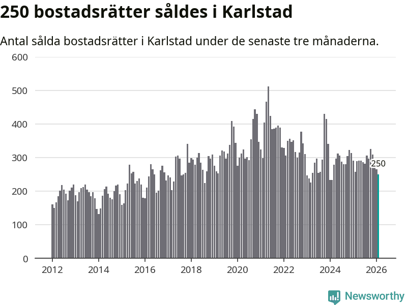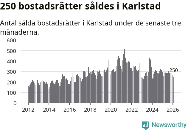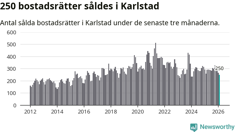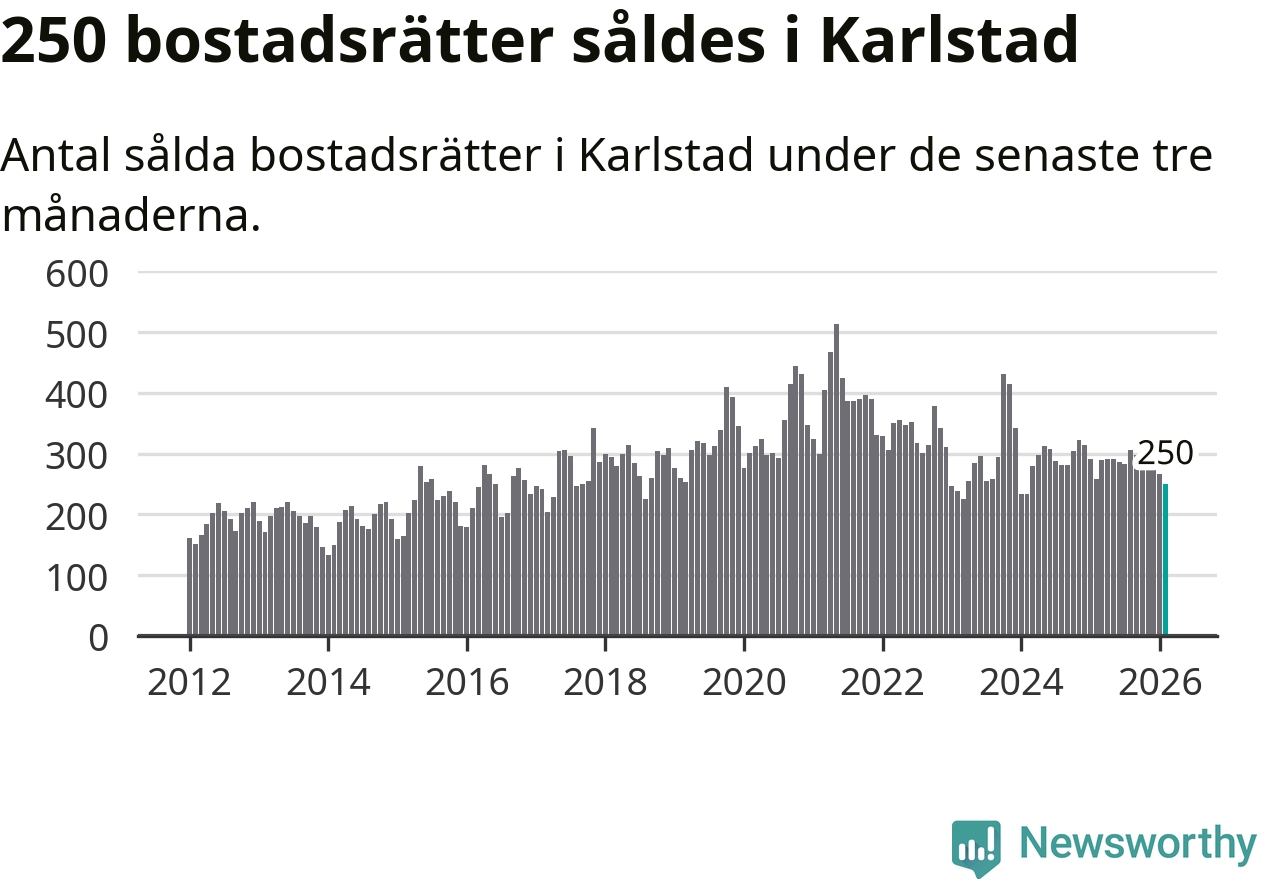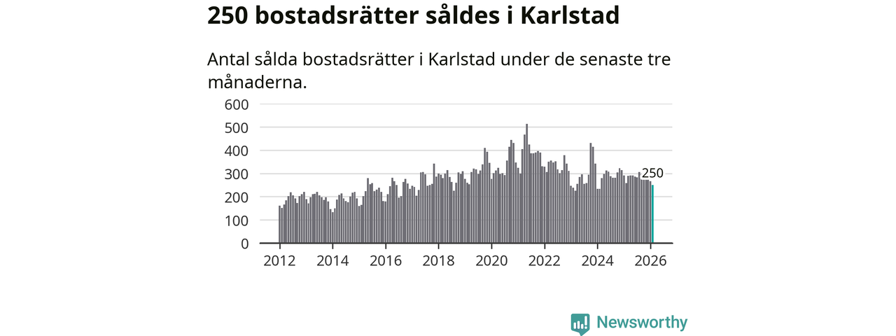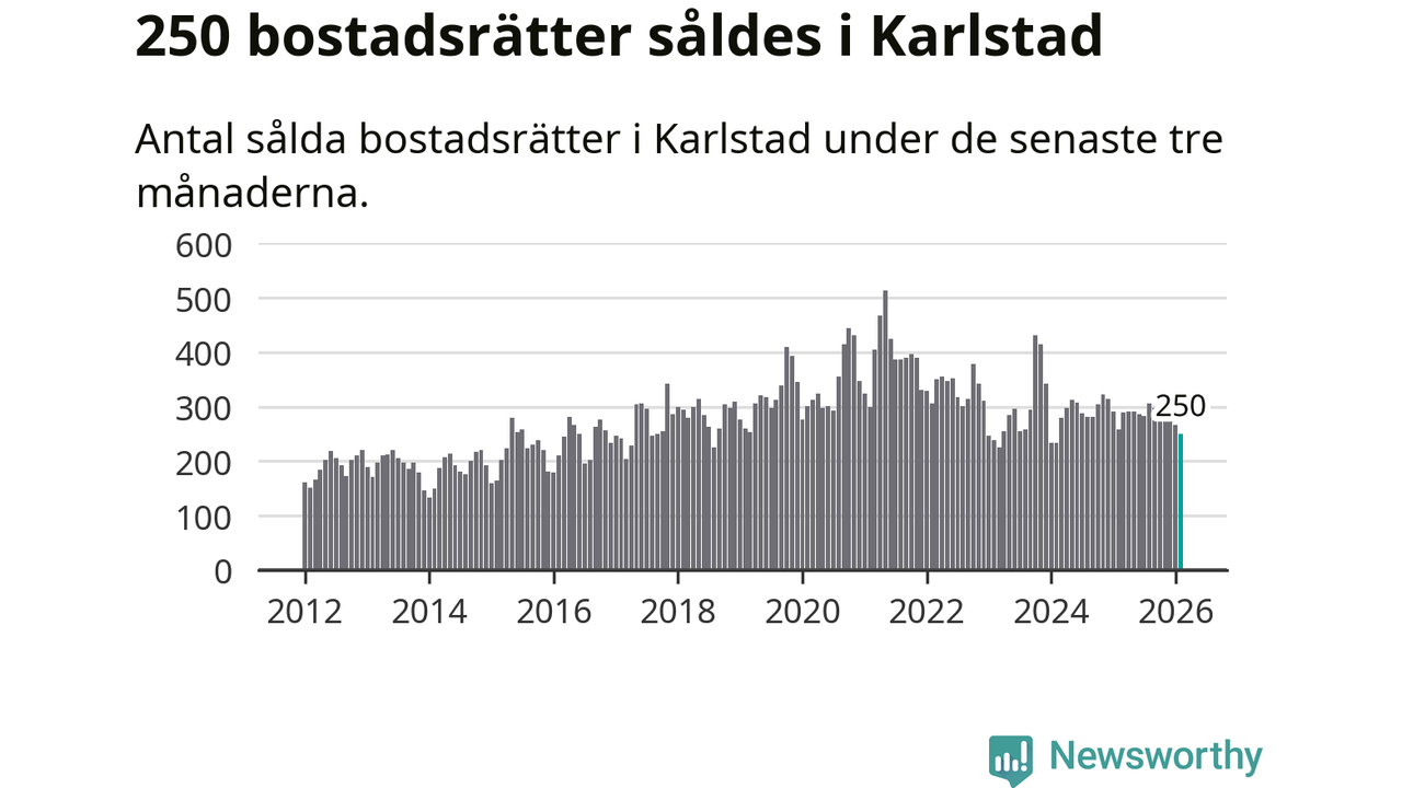 Sammanlagt såldes 250 bostadsrätter i Karlstads kommun mellan december och februari till ett genomsnittligt pris på 1,9 miljoner kronor. I fjol gjordes 258 affärer vid den här tiden på året.
