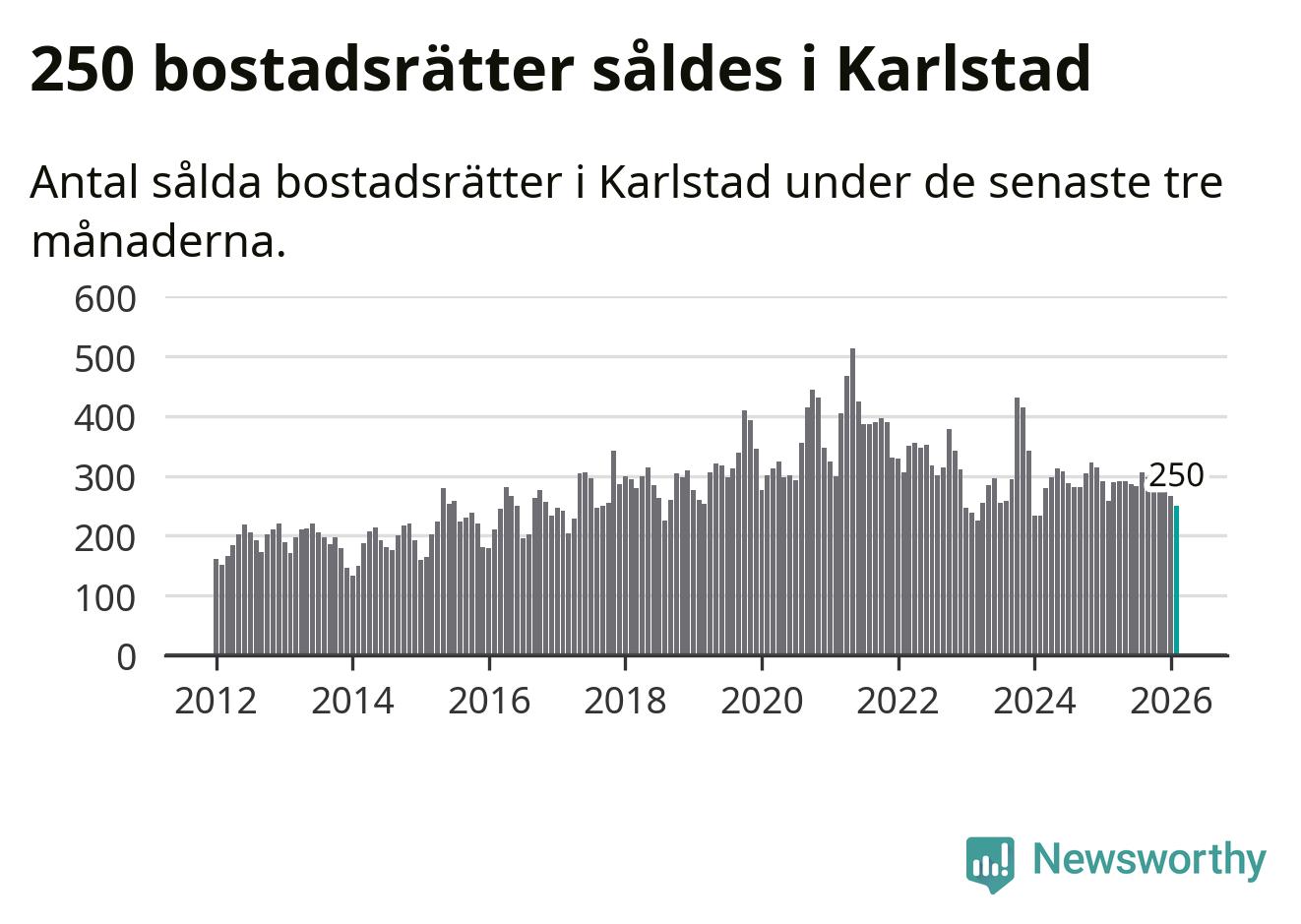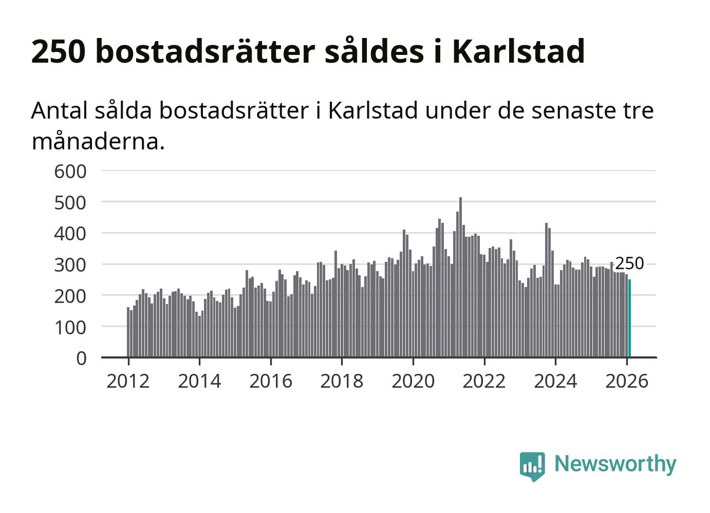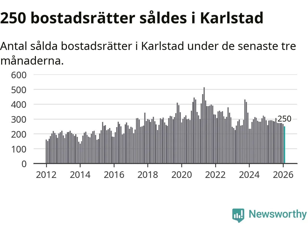 Sammanlagt såldes 250 bostadsrätter i Karlstads kommun mellan december och februari till ett genomsnittligt pris på 1,9 miljoner kronor. I fjol gjordes 258 affärer vid den här tiden på året.