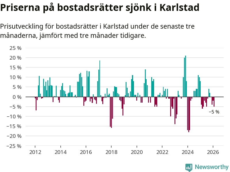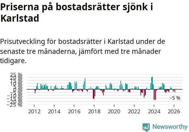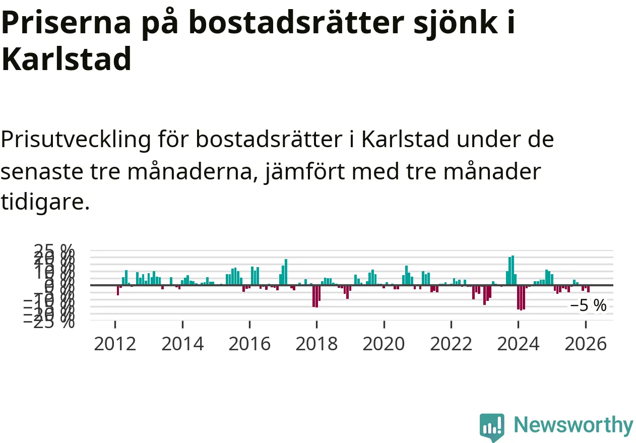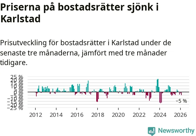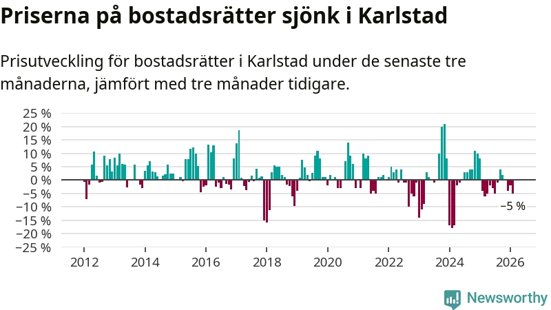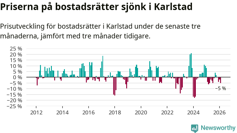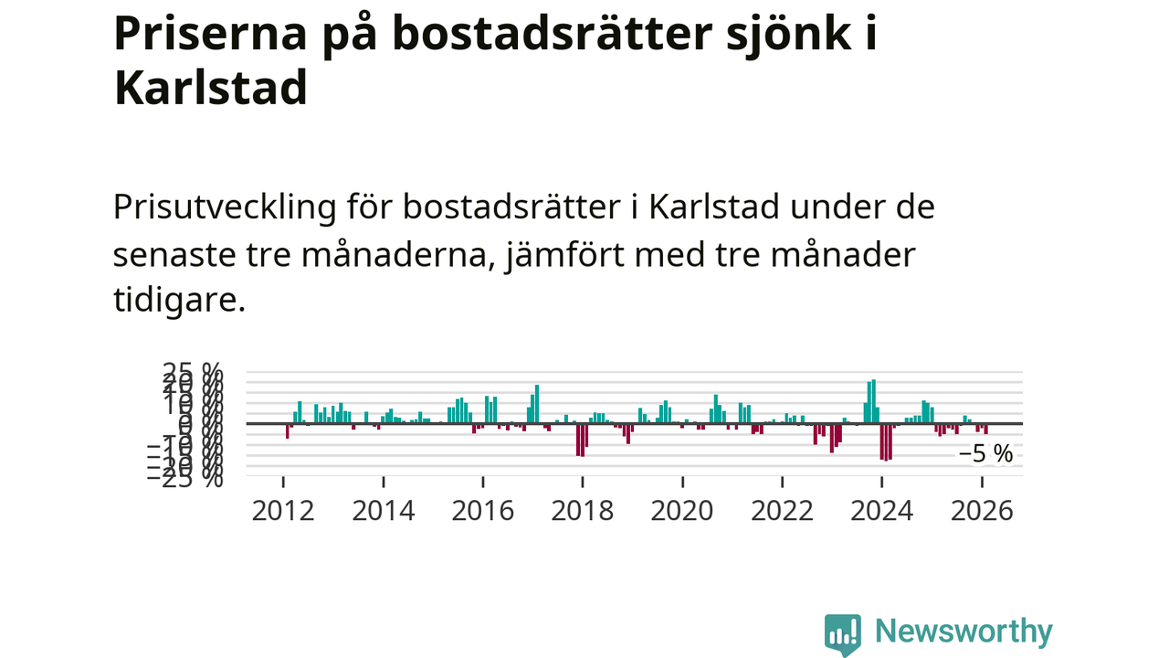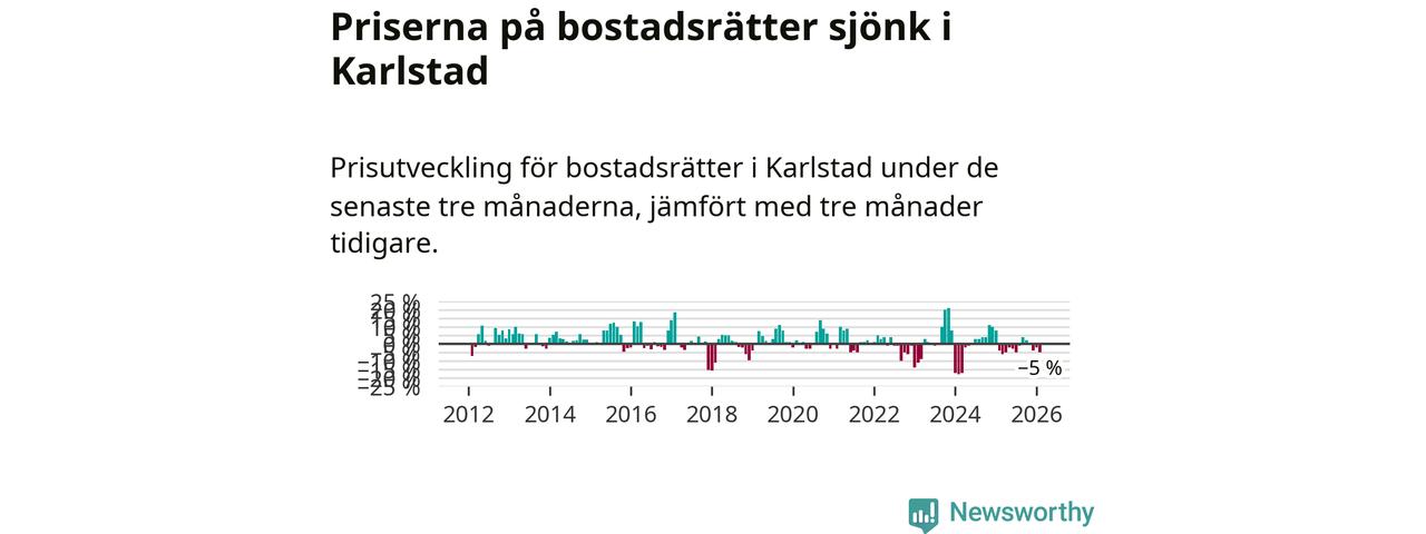 Priserna på bostadsrätter har gått ner i Karlstads kommun. Medelpriset på försäljningarna under de senaste tre månaderna visar på en nedgång med 5 procent.