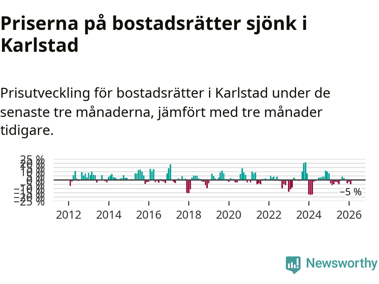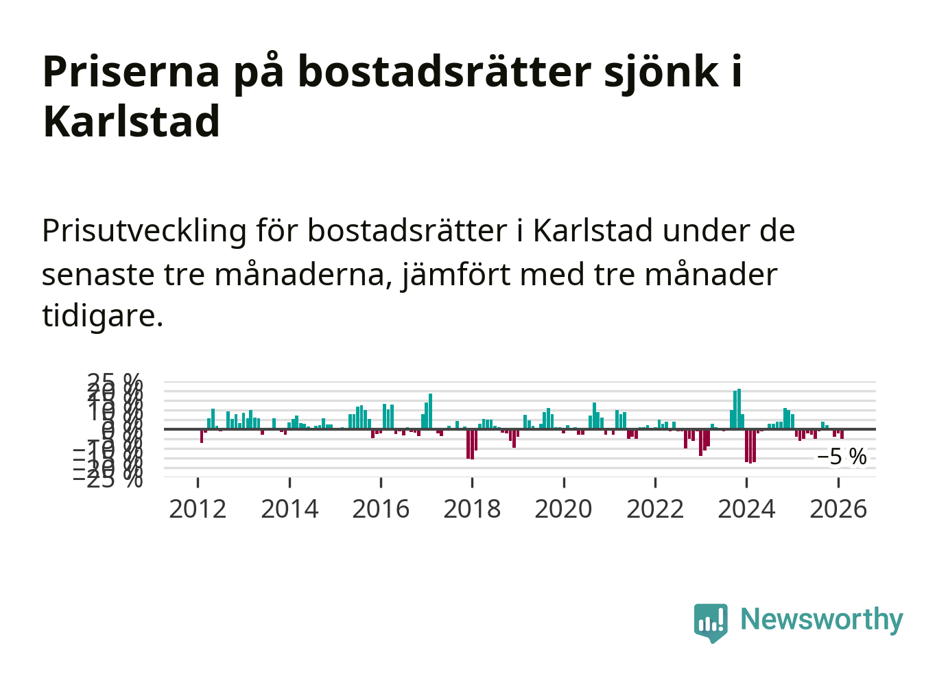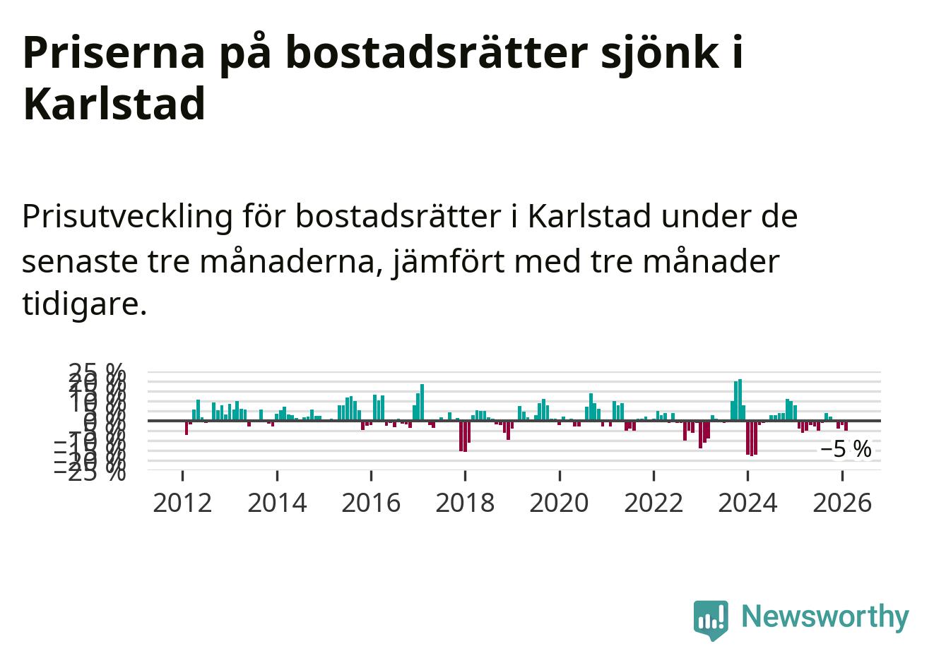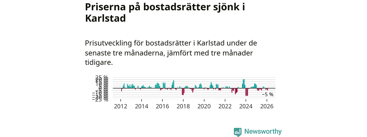 Priserna på bostadsrätter har gått ner i Karlstads kommun. Medelpriset på försäljningarna under de senaste tre månaderna visar på en nedgång med 5 procent.