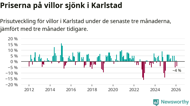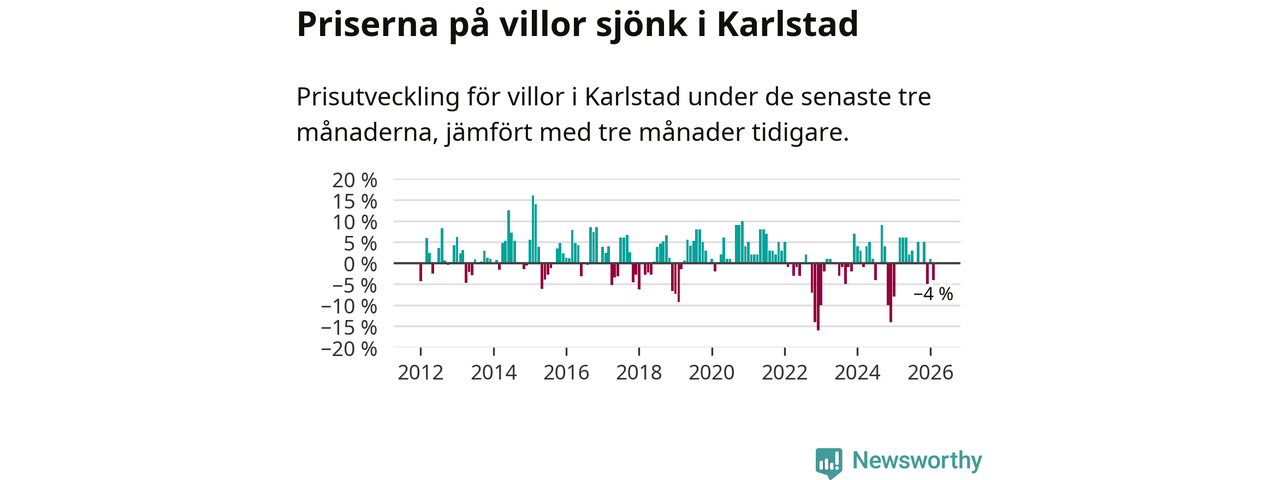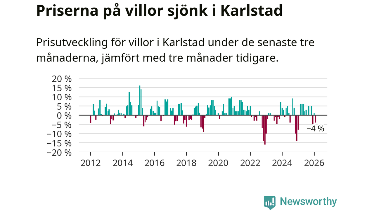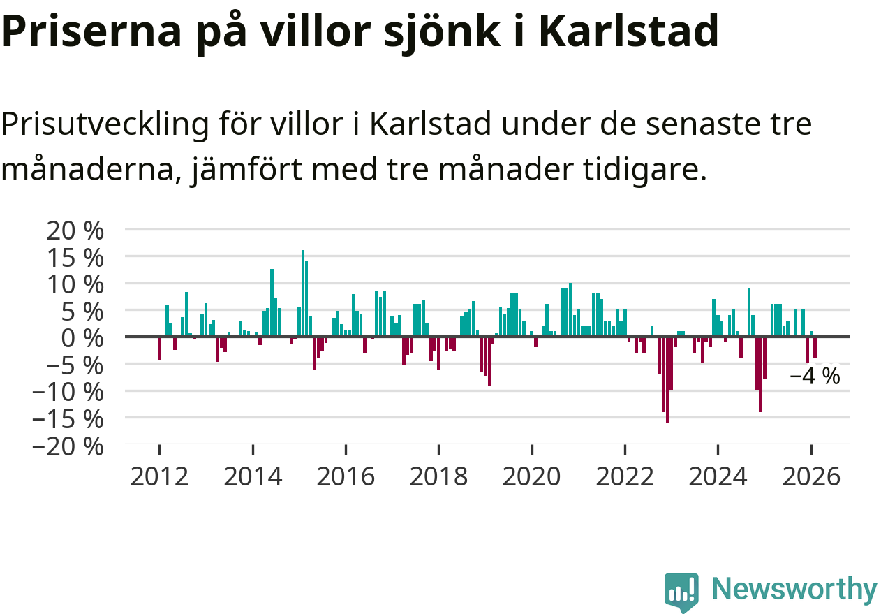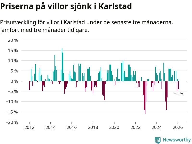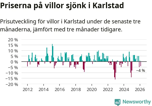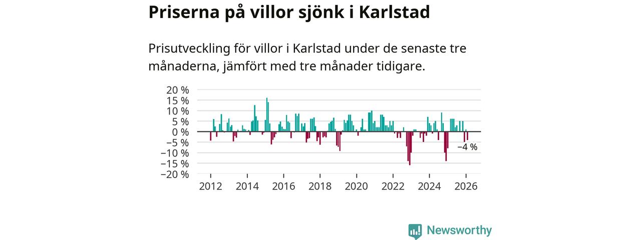 Villapriserna har gått ner i Karlstads kommun. Medelpriset på försäljningarna under de senaste tre månaderna visar på en nedgång med 4 procent.