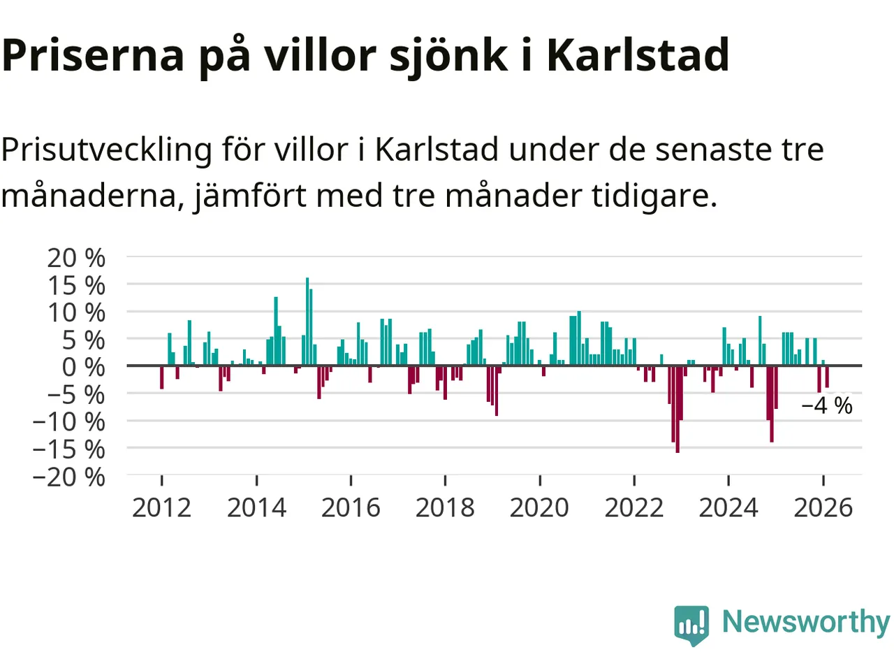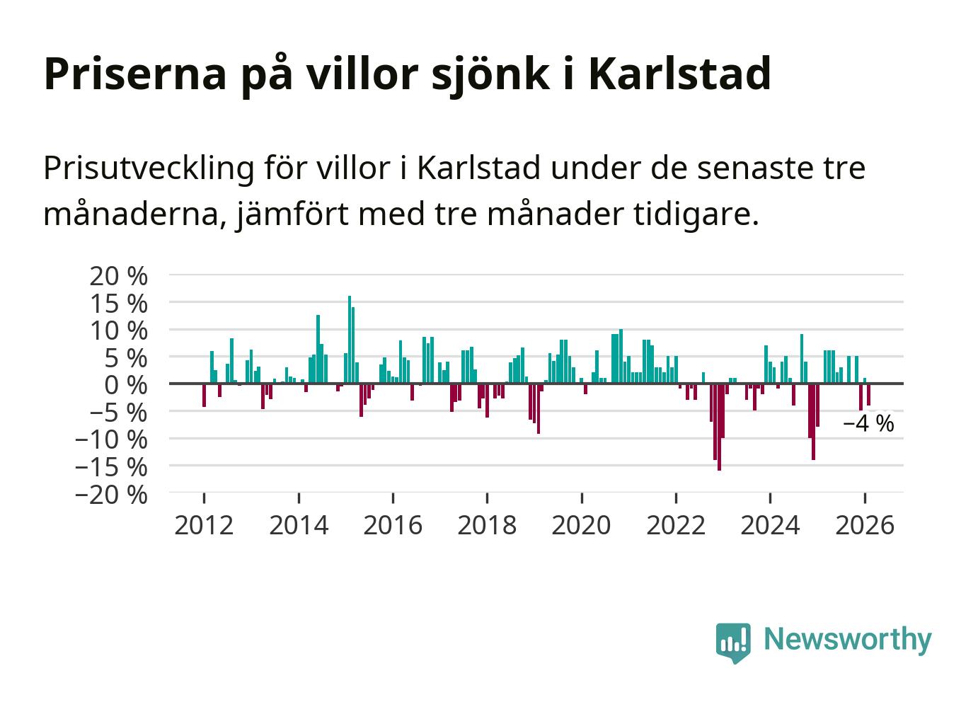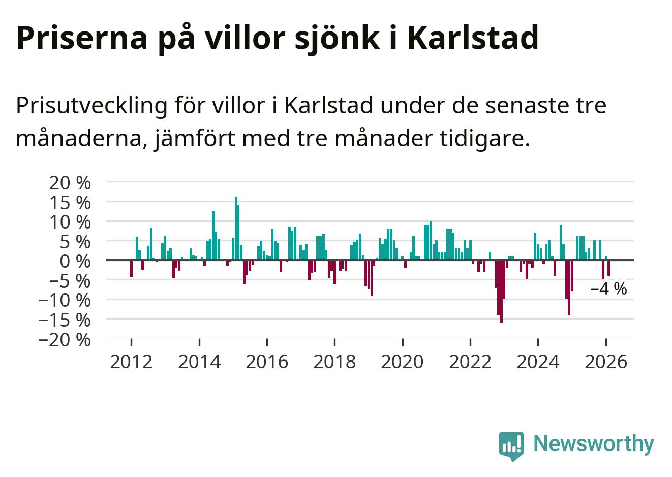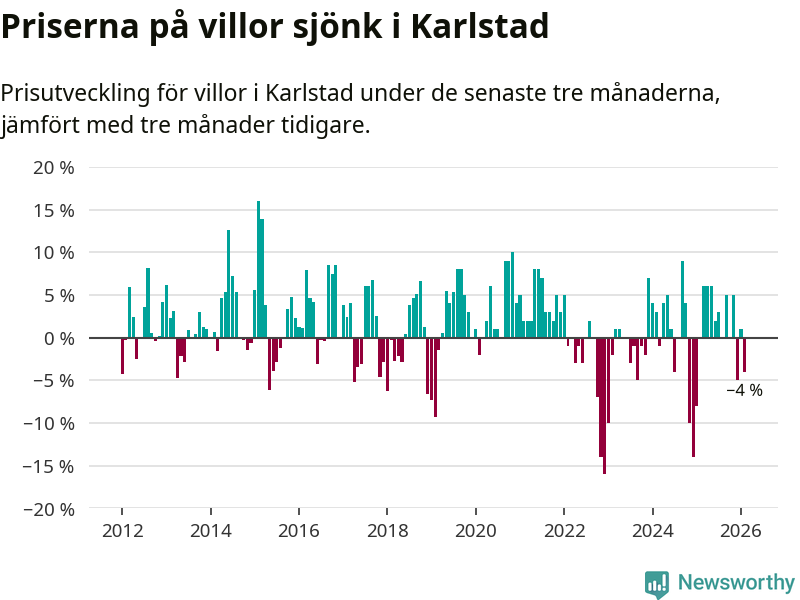Villapriserna har gått ner i Karlstads kommun. Medelpriset på försäljningarna under de senaste tre månaderna visar på en nedgång med 4 procent.