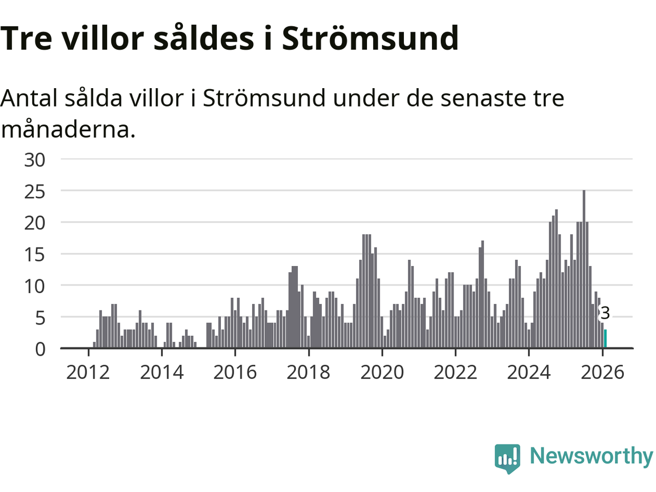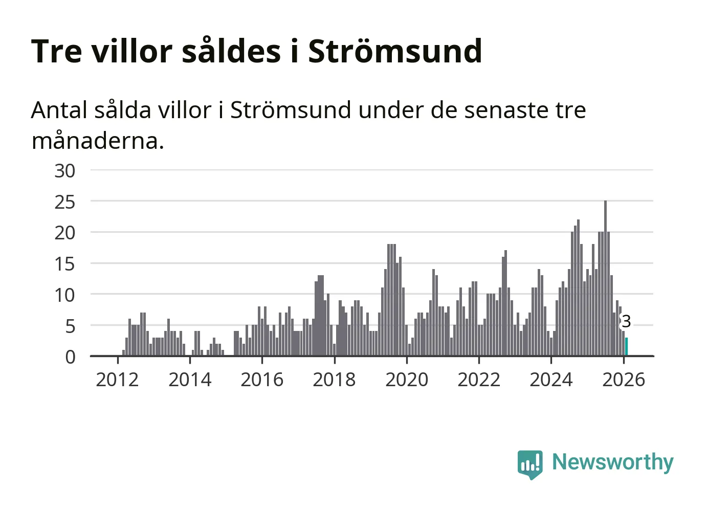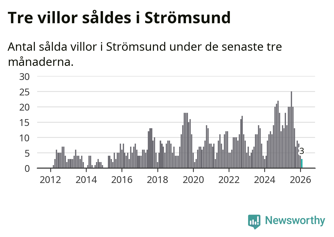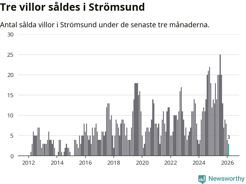Mellan december och februari gjordes sammanlagt tre affärer med villor i Strömsunds kommun. Det kan jämföras med 13 vid motsvarande tid i fjol.