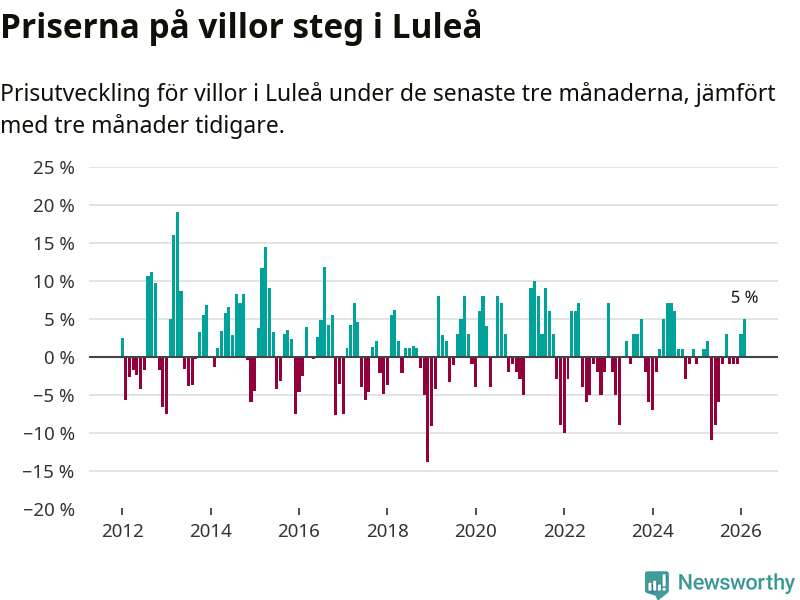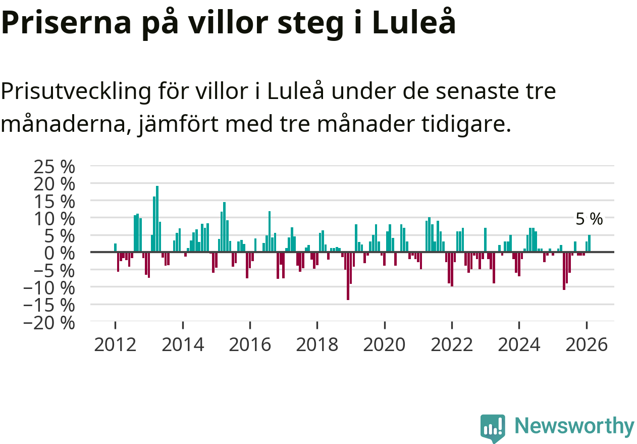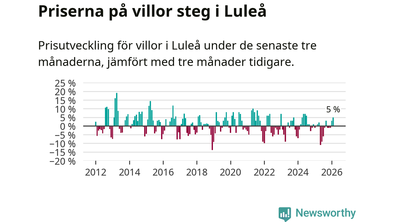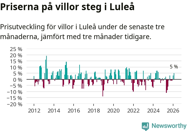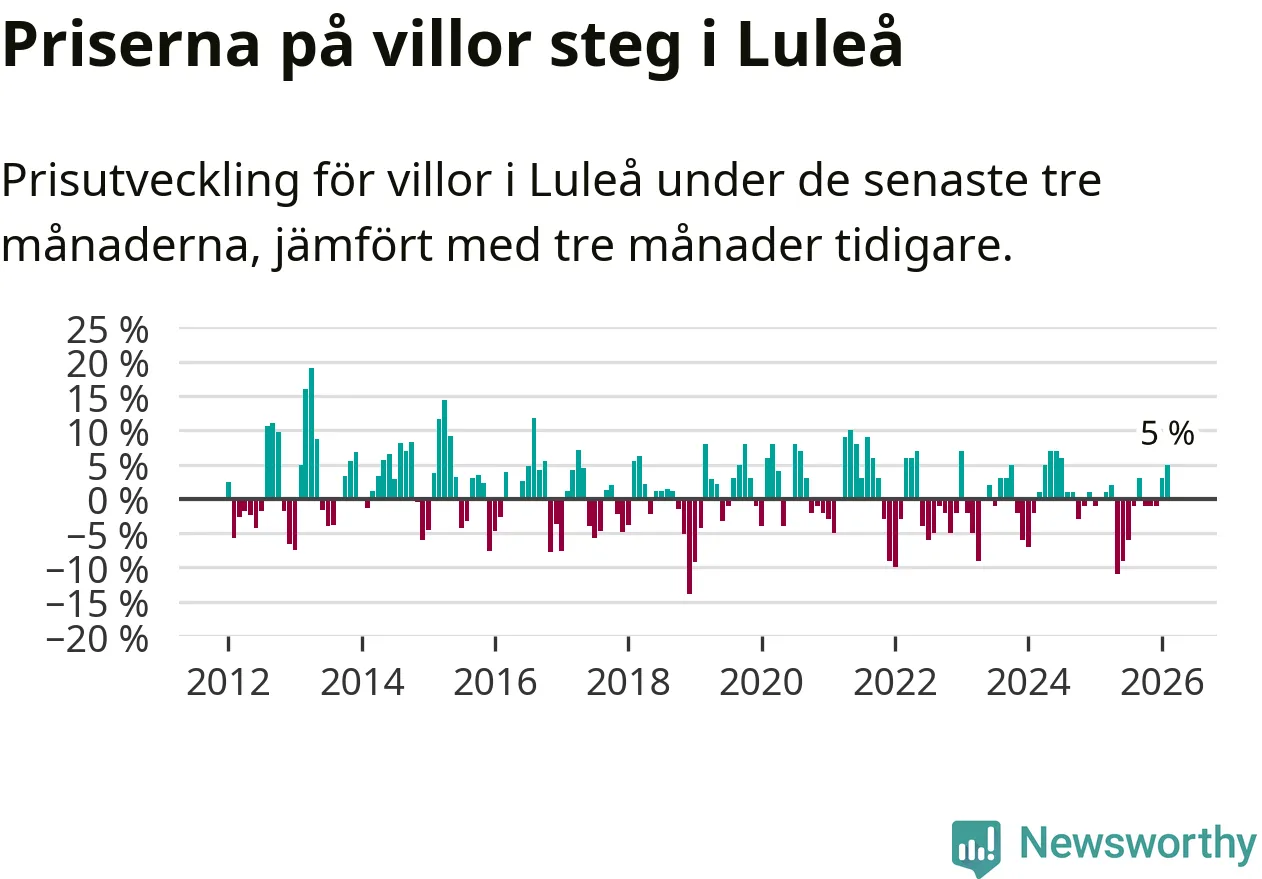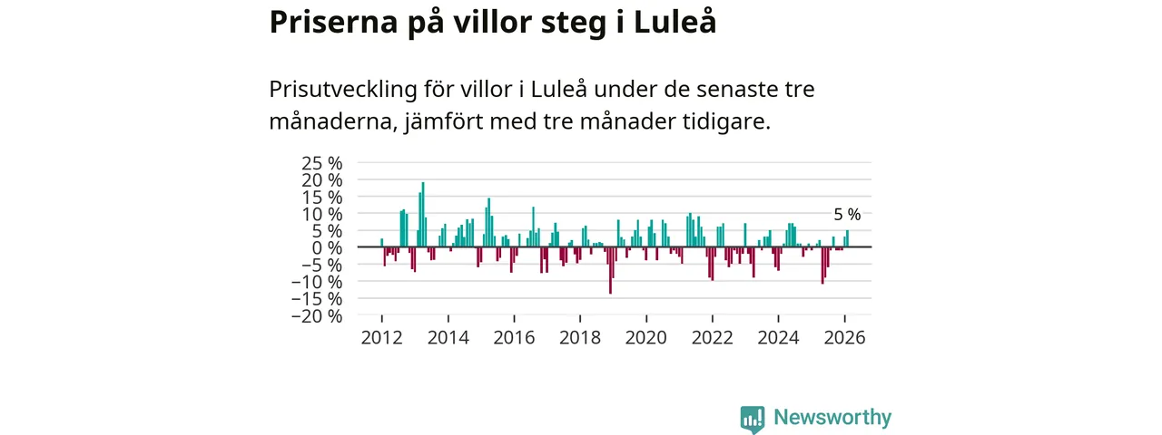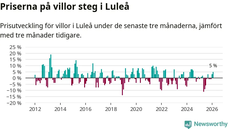 Villapriserna har gått upp i Luleå kommun. Medelpriset på försäljningarna under de senaste tre månaderna visar på en uppgång med 5 procent.