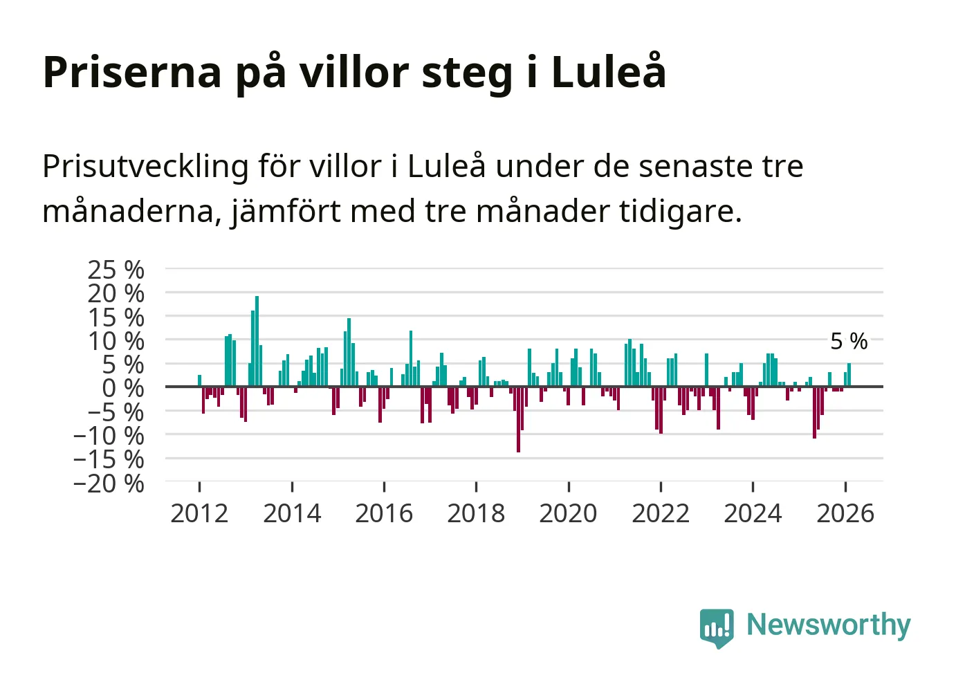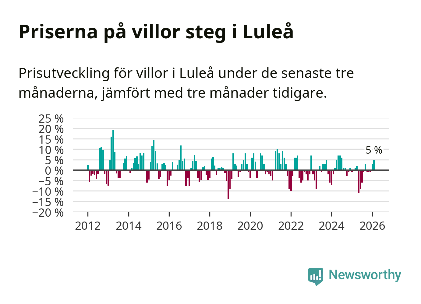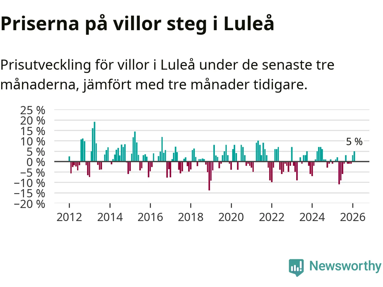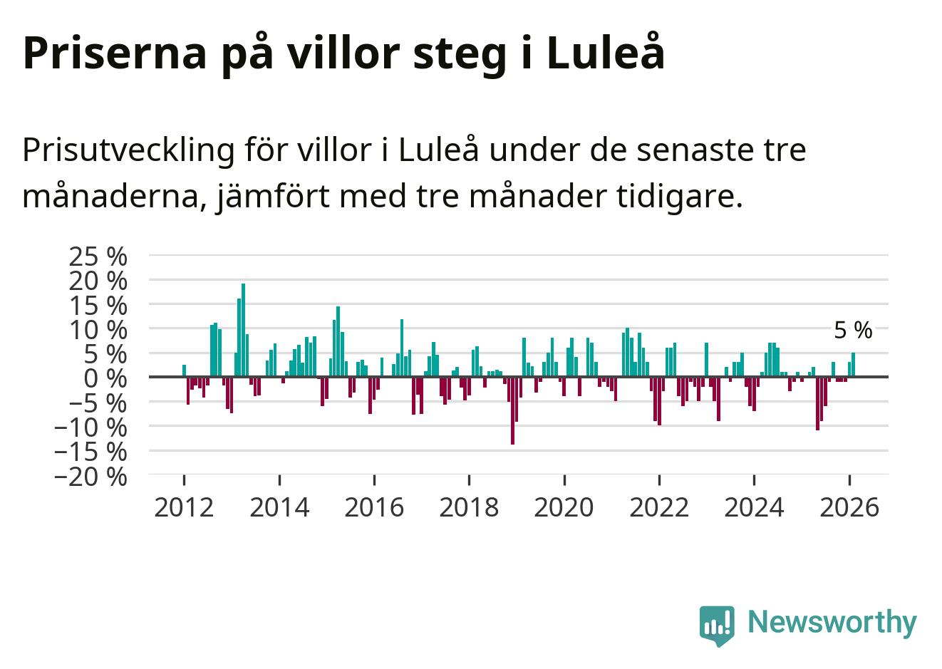 Villapriserna har gått upp i Luleå kommun. Medelpriset på försäljningarna under de senaste tre månaderna visar på en uppgång med 5 procent.