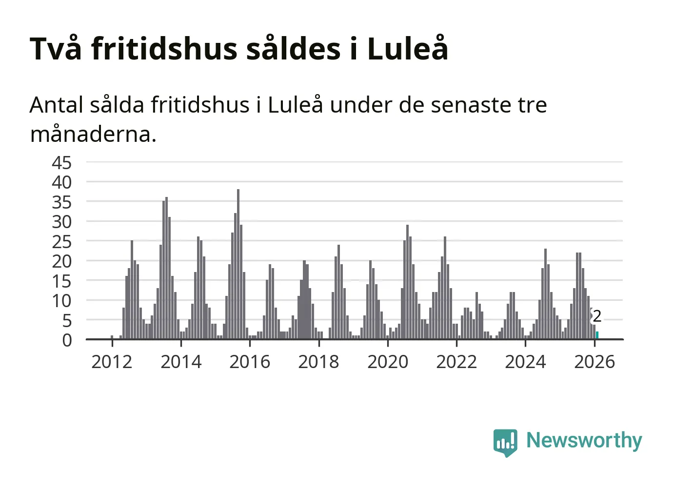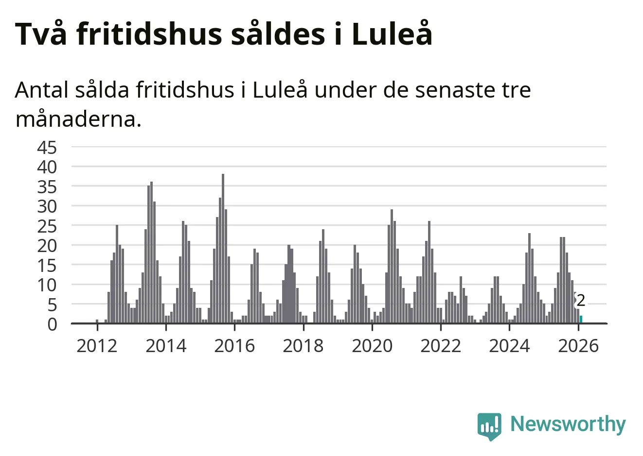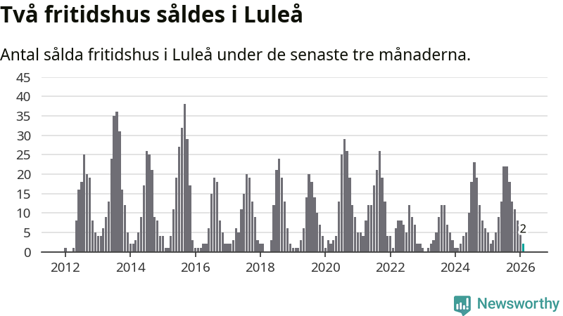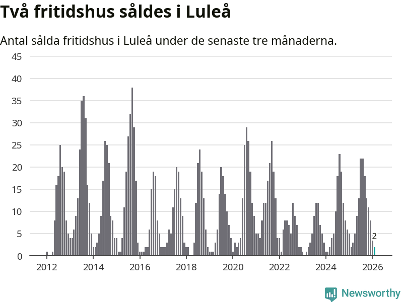 Sammanlagt såldes två fritidshus i Luleå kommun mellan december 2025 och februari till ett genomsnittligt pris på 2,1 miljoner kronor. I fjol gjordes två affärer vid den här tiden på året.