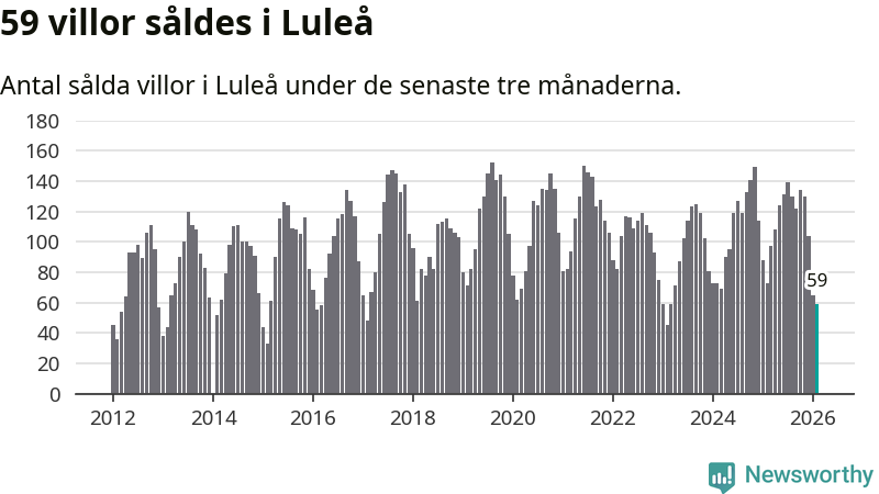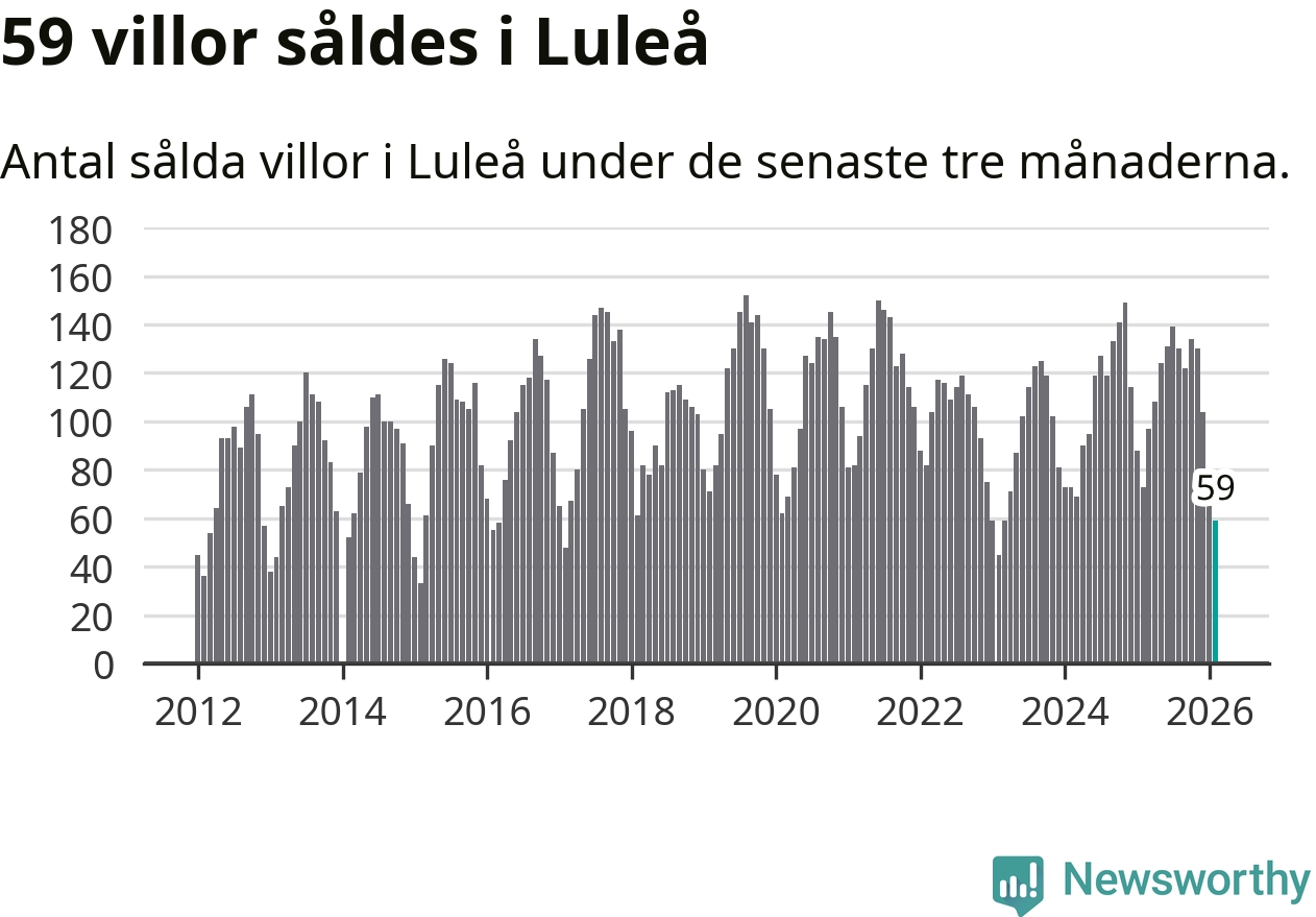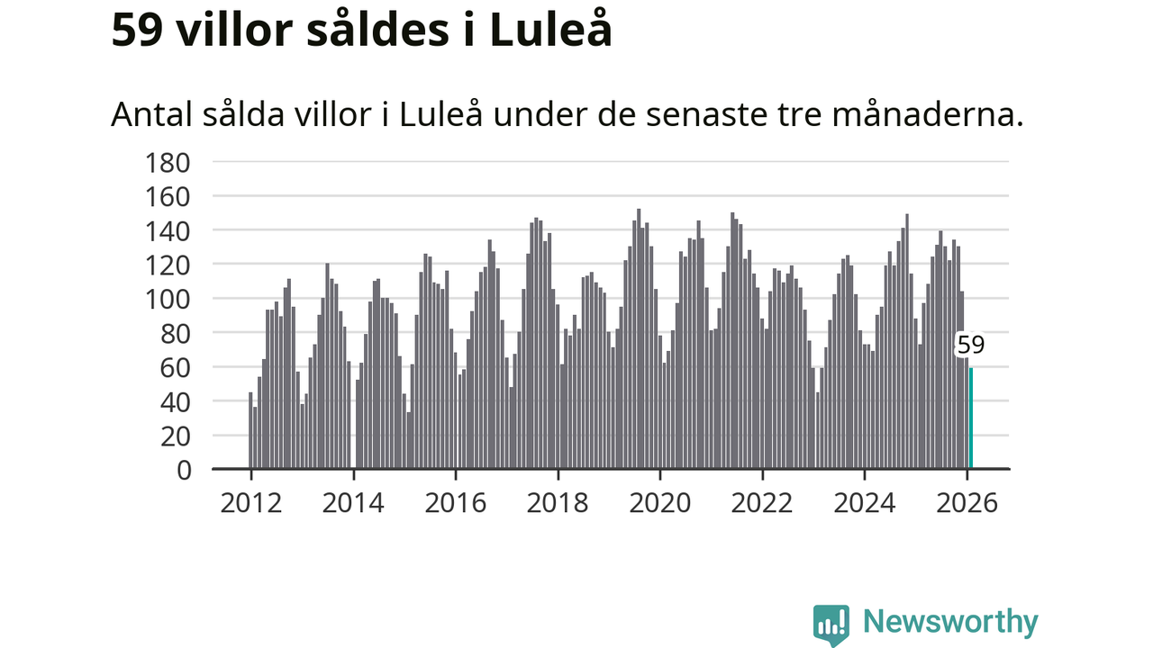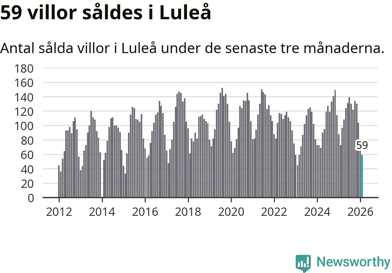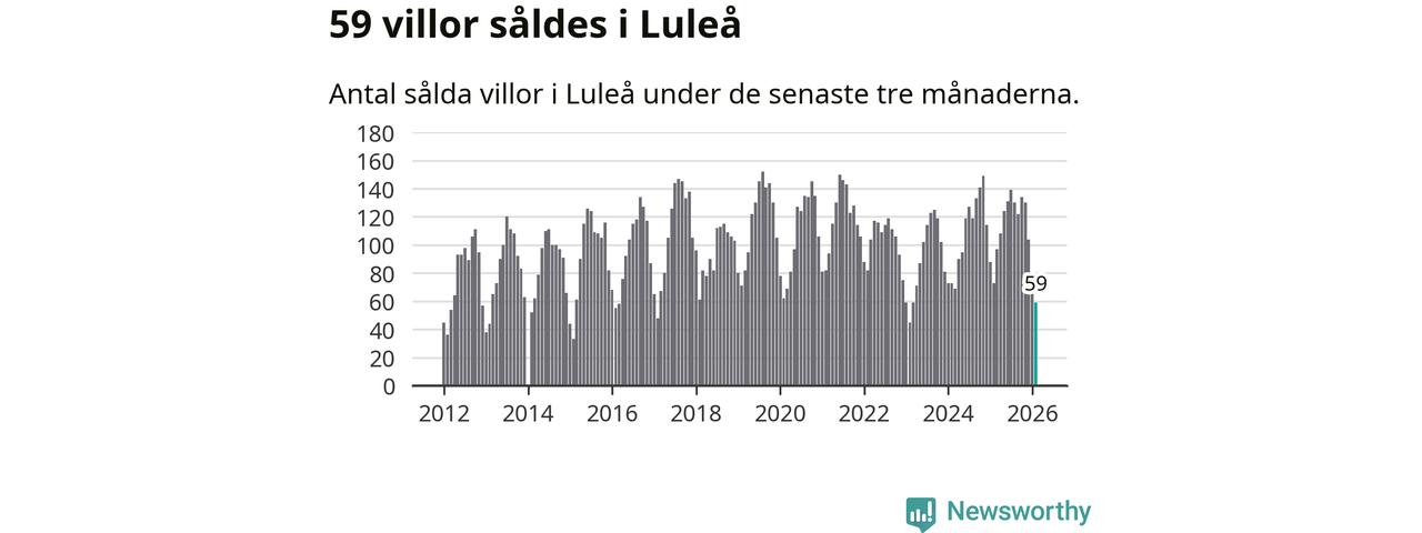 Sammanlagt såldes 59 villor i Luleå kommun mellan december och februari till ett genomsnittligt pris på 3,6 miljoner kronor. I fjol gjordes 73 affärer vid den här tiden på året.