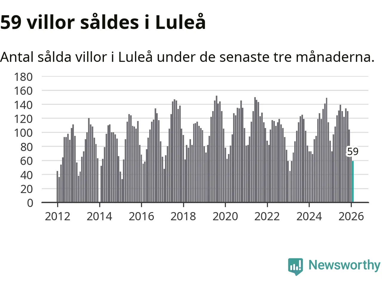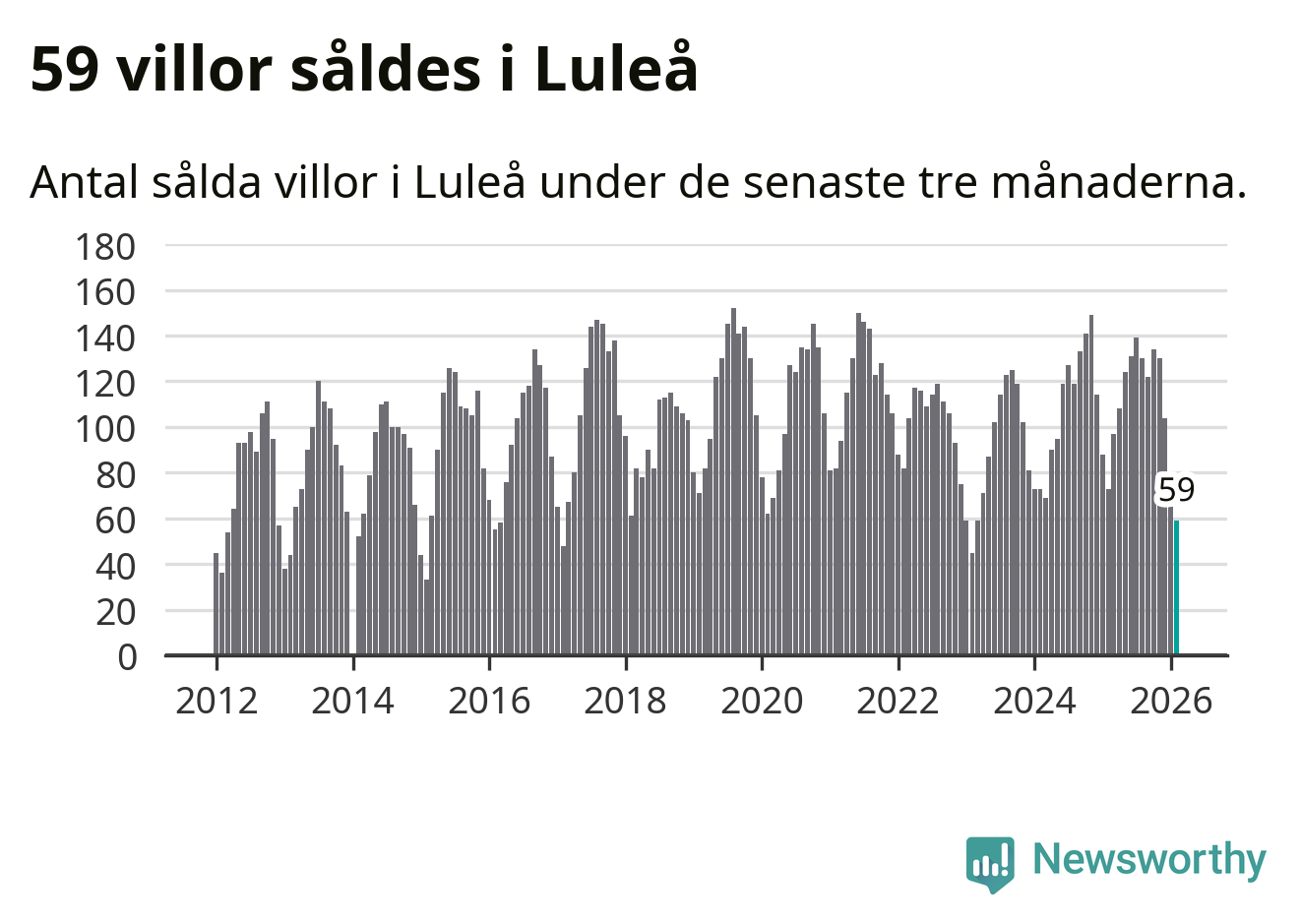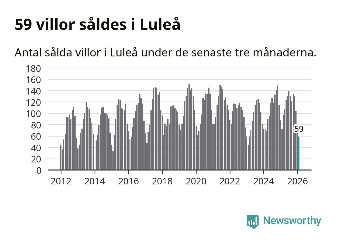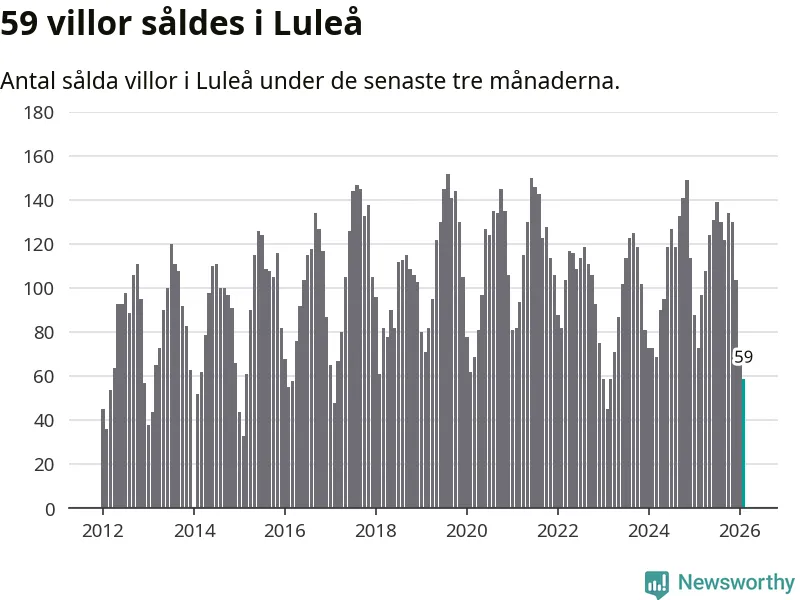 Sammanlagt såldes 59 villor i Luleå kommun mellan december och februari till ett genomsnittligt pris på 3,6 miljoner kronor. I fjol gjordes 73 affärer vid den här tiden på året.