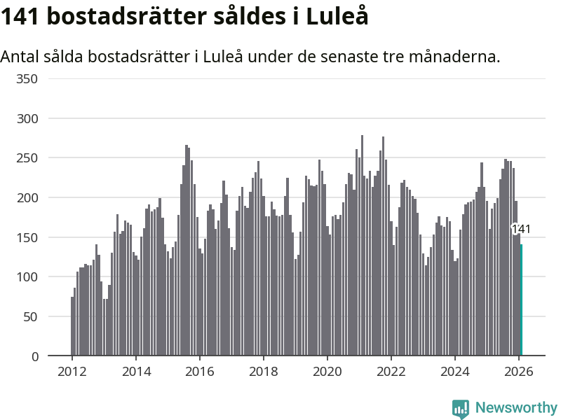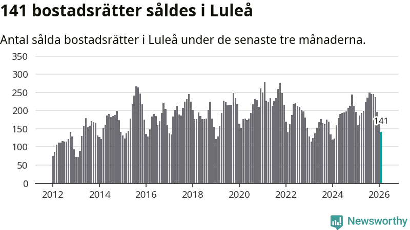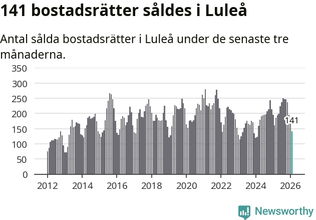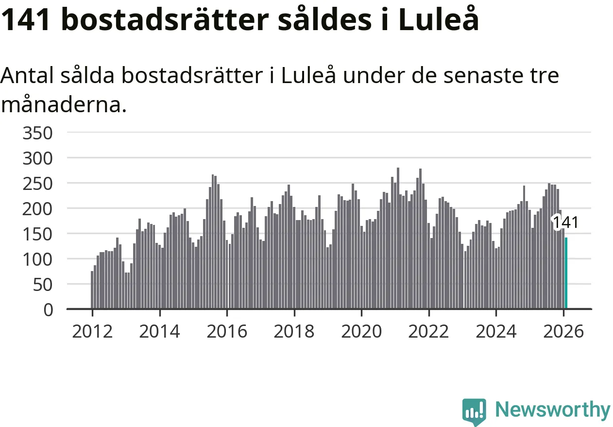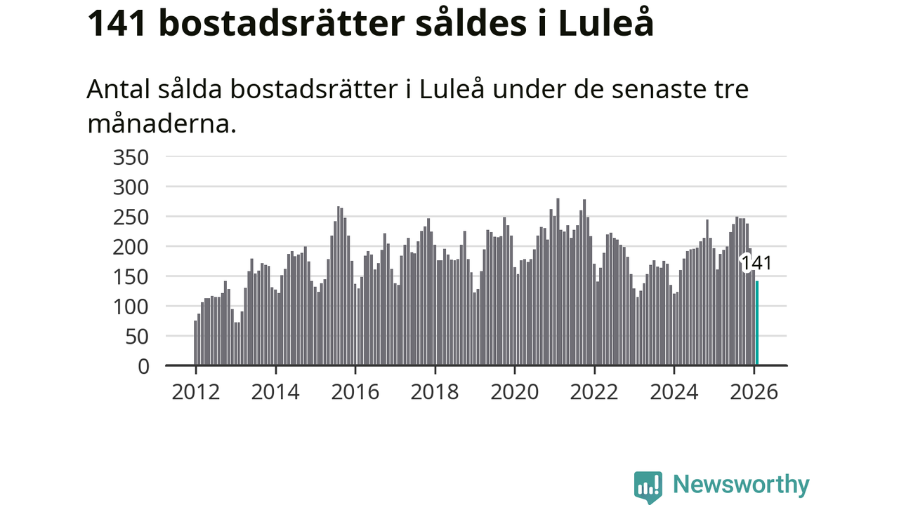 Sammanlagt såldes 141 bostadsrätter i Luleå kommun mellan december och februari till ett genomsnittligt pris på 1,9 miljoner kronor. I fjol gjordes 160 affärer vid den här tiden på året.