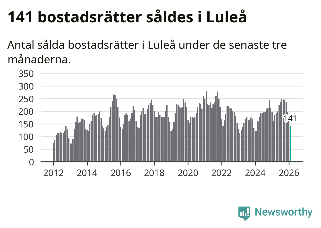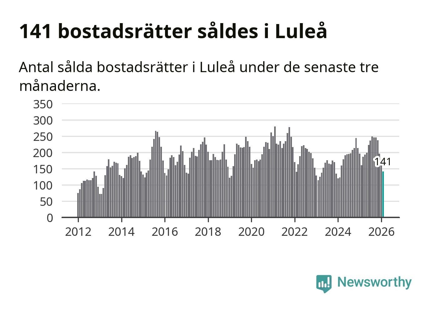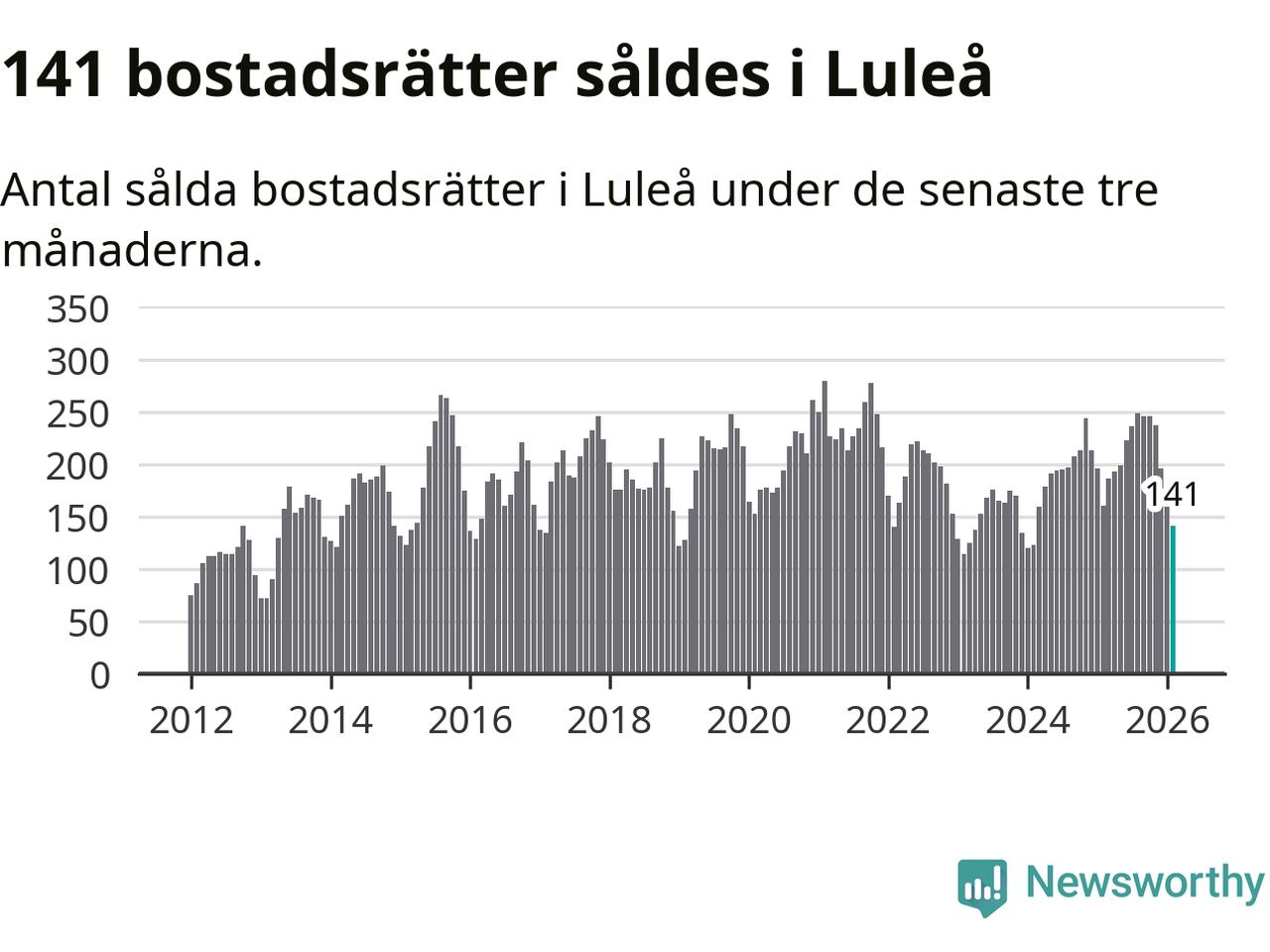 Sammanlagt såldes 141 bostadsrätter i Luleå kommun mellan december och februari till ett genomsnittligt pris på 1,9 miljoner kronor. I fjol gjordes 160 affärer vid den här tiden på året.