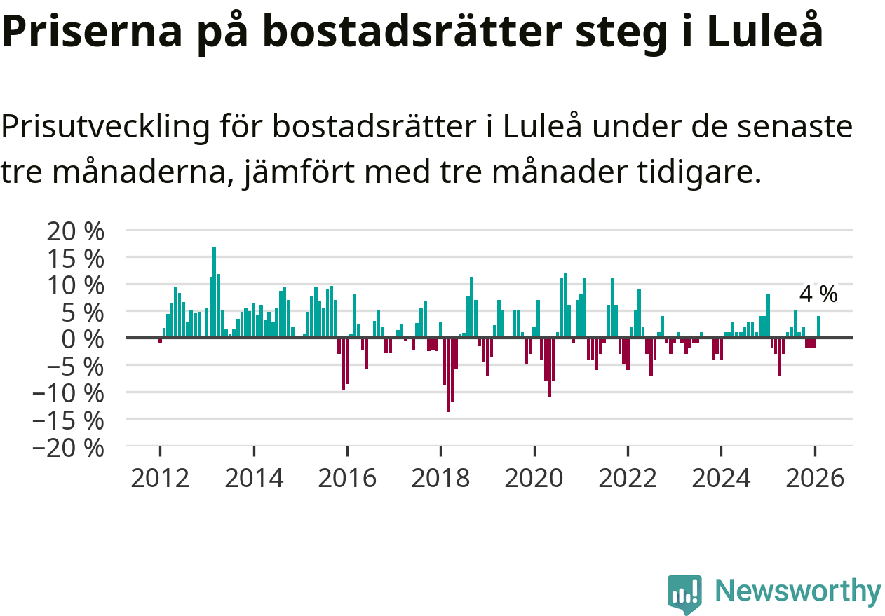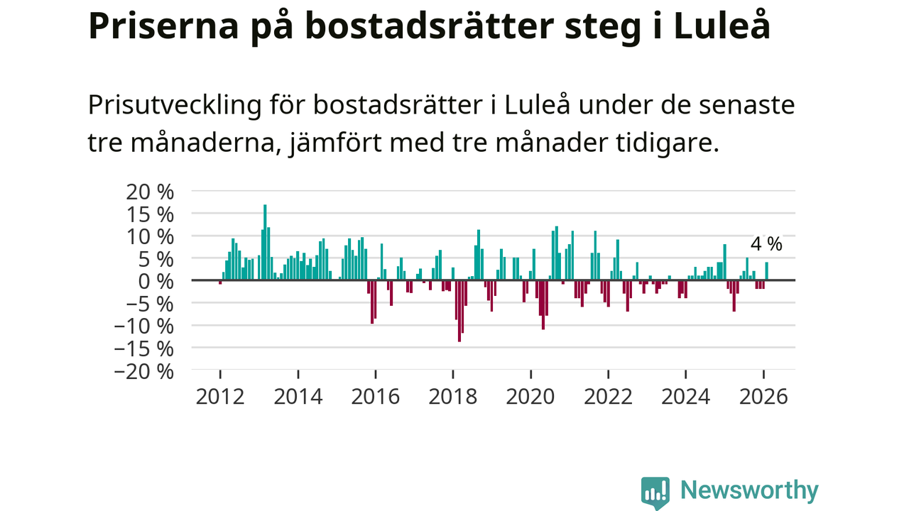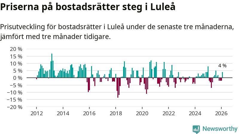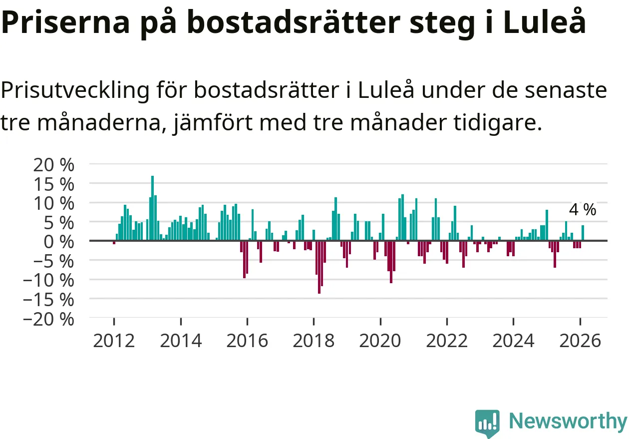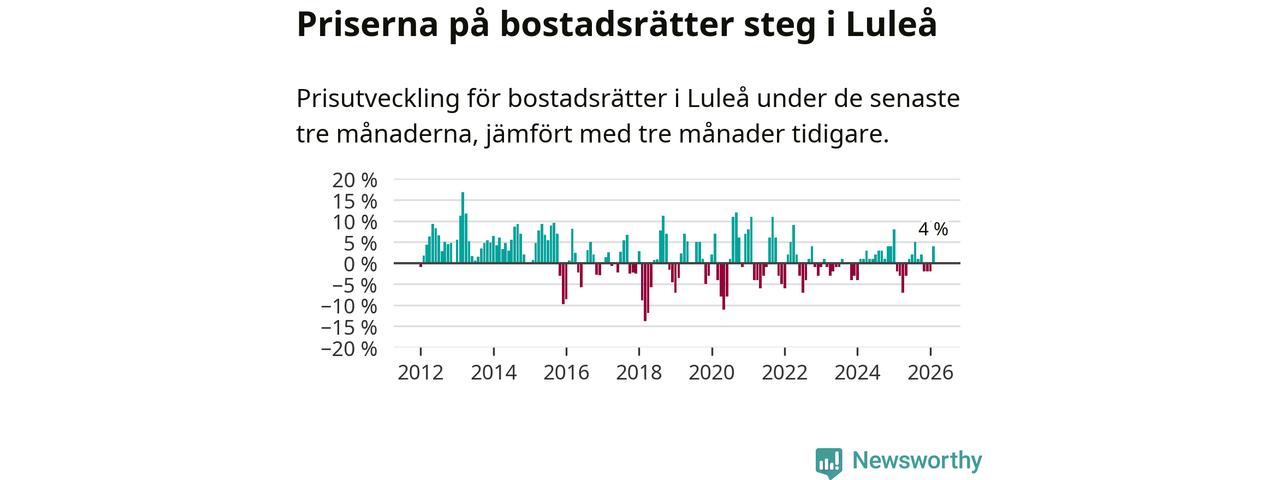 Priserna på bostadsrätter har gått upp i Luleå kommun. Medelpriset på försäljningarna under de senaste tre månaderna visar på en uppgång med 4 procent.