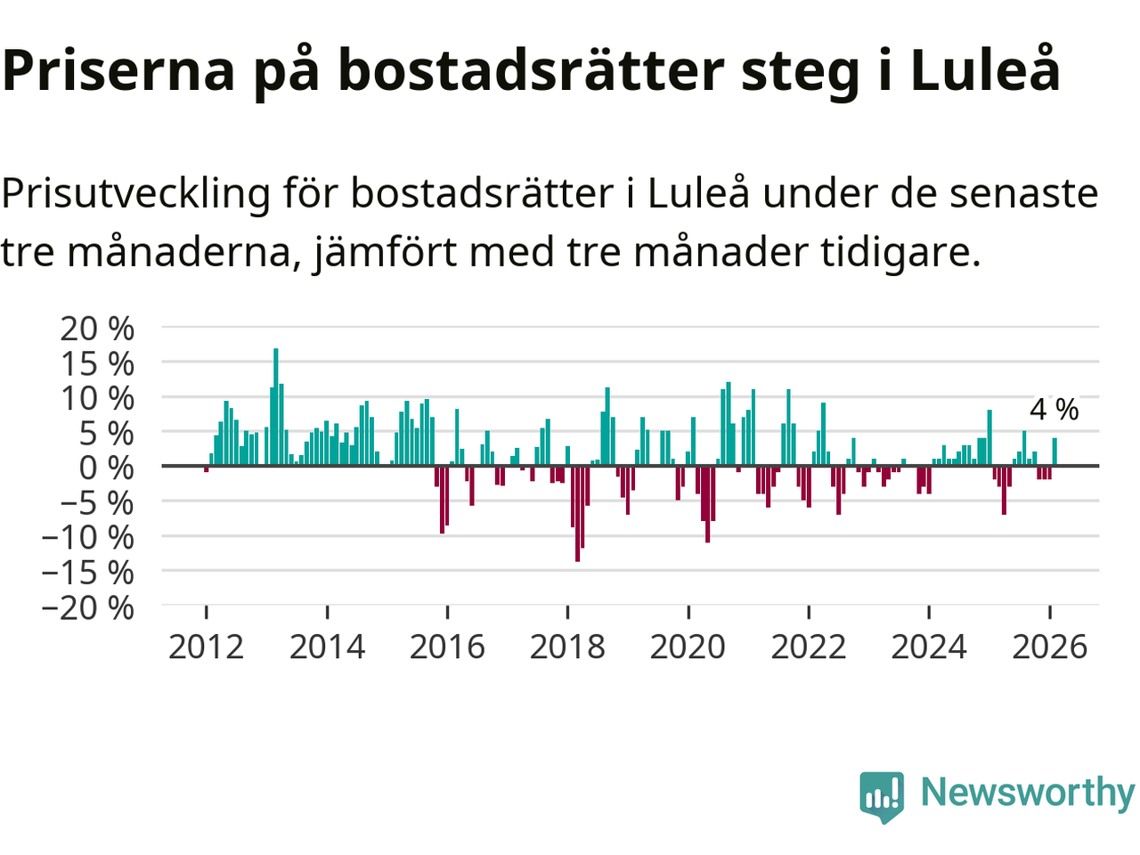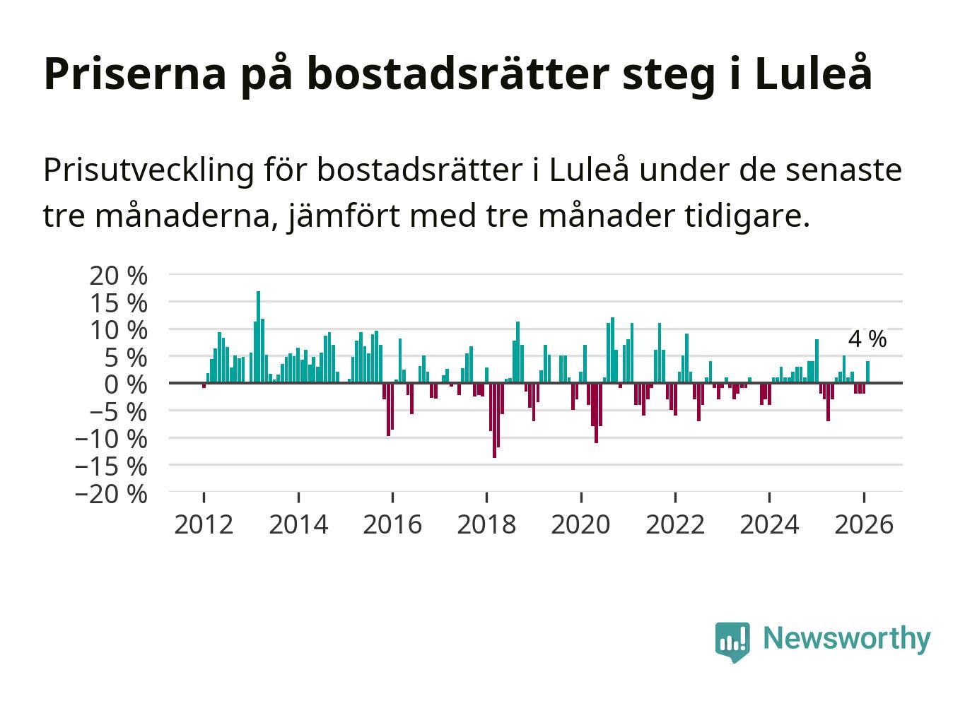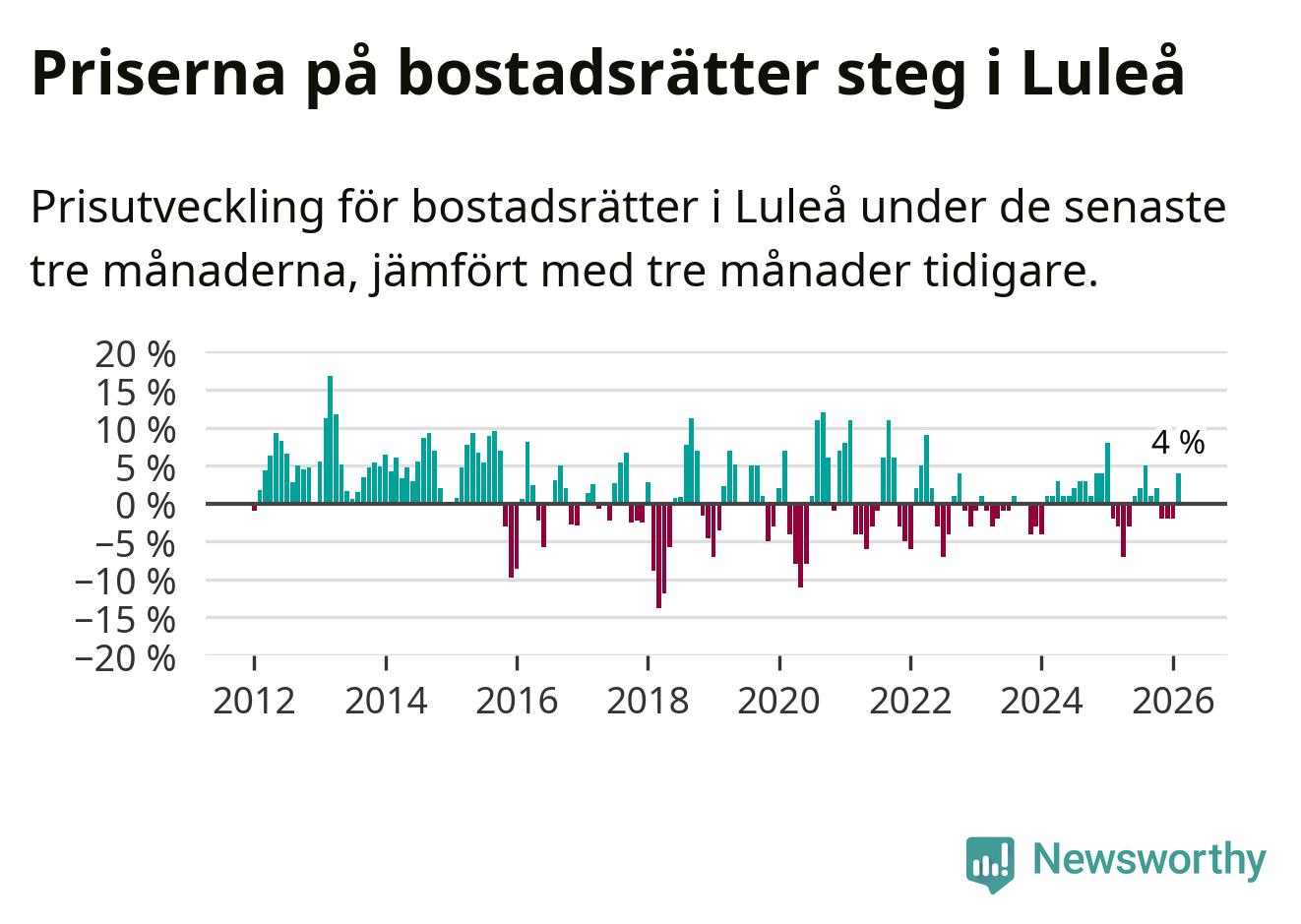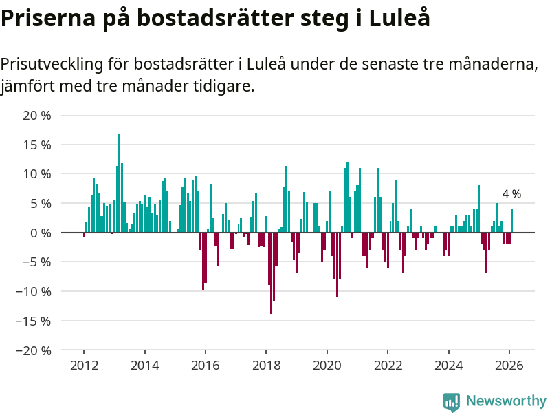 Priserna på bostadsrätter har gått upp i Luleå kommun. Medelpriset på försäljningarna under de senaste tre månaderna visar på en uppgång med 4 procent.