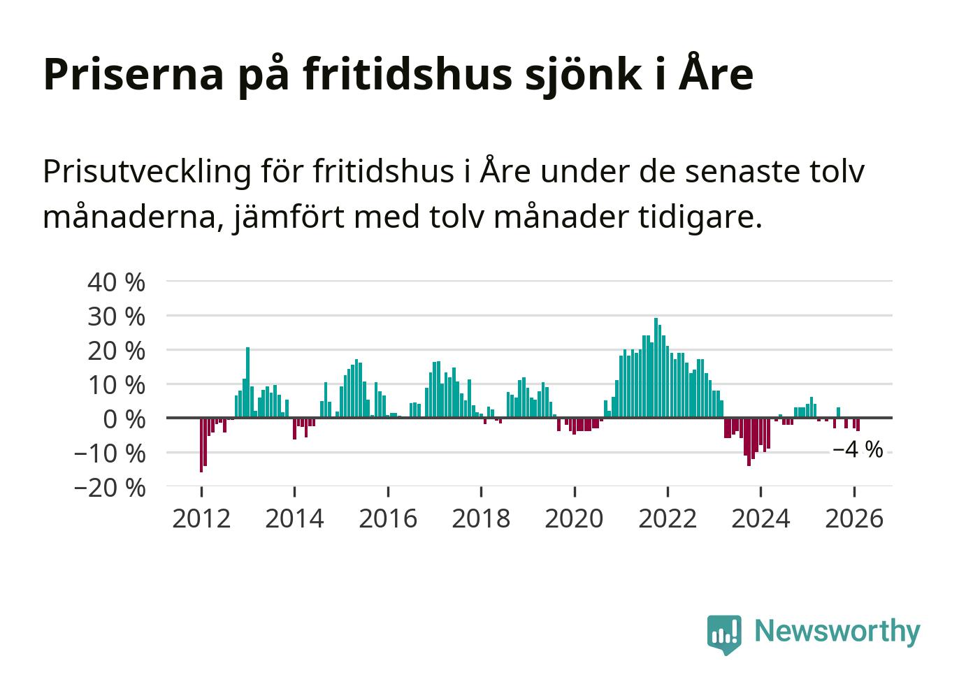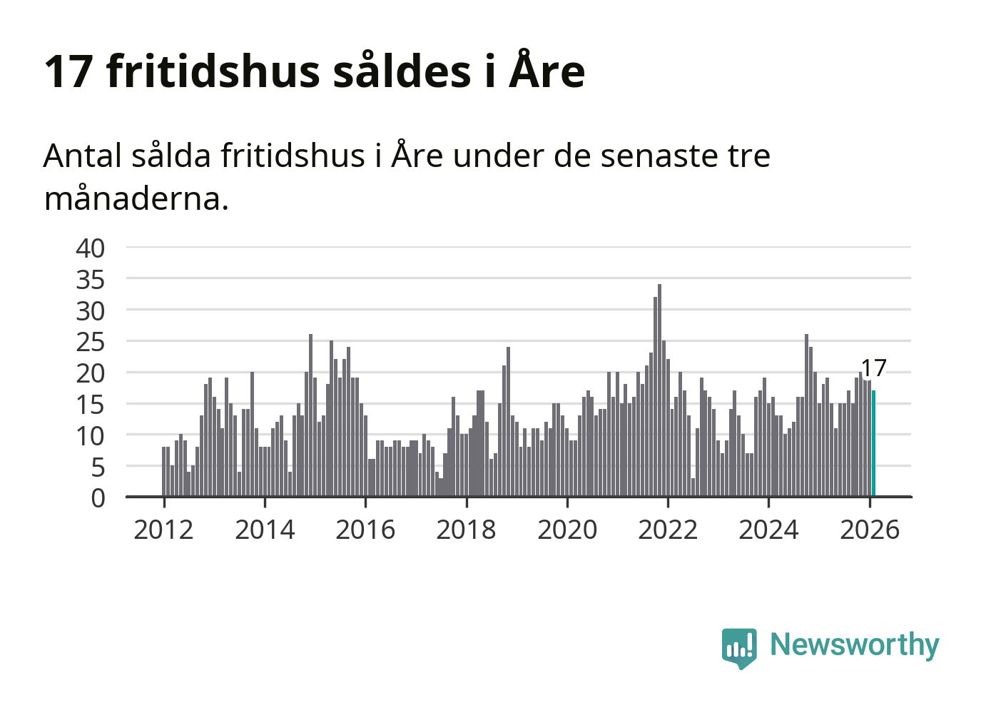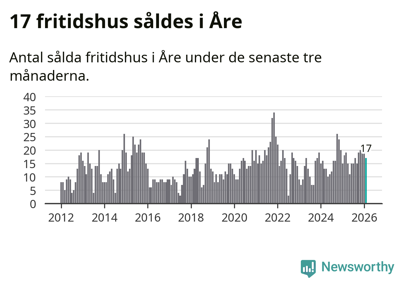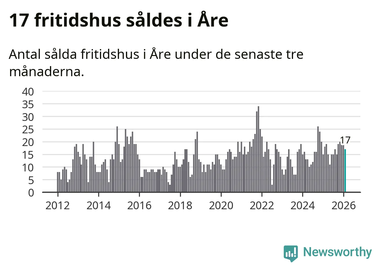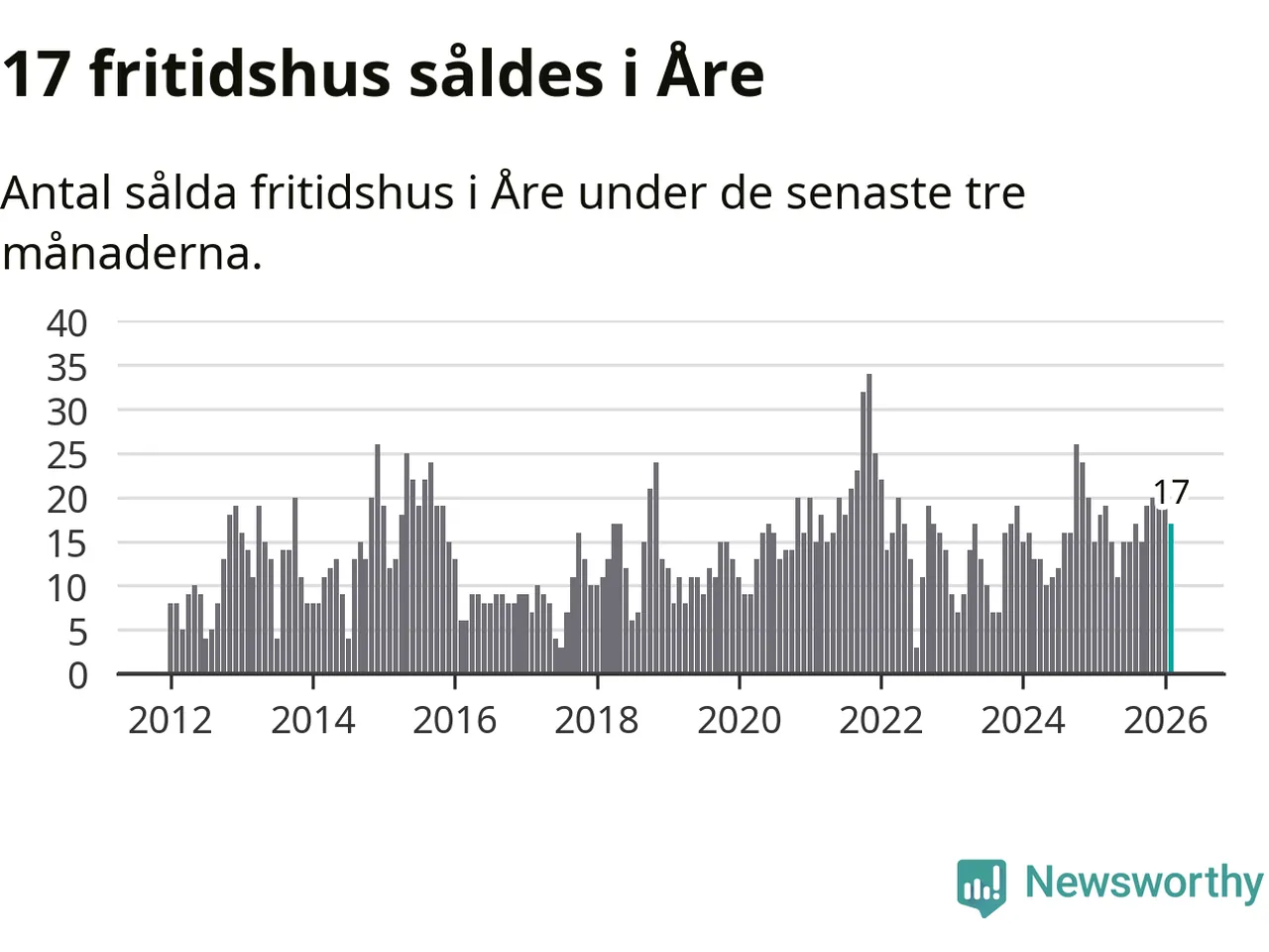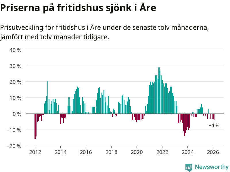 Sammanlagt såldes 17 fritidshus i Åre kommun mellan december 2025 och februari till ett genomsnittligt pris på 3,4 miljoner kronor. I fjol gjordes 18 affärer vid den här tiden på året.