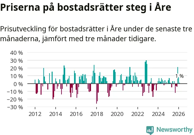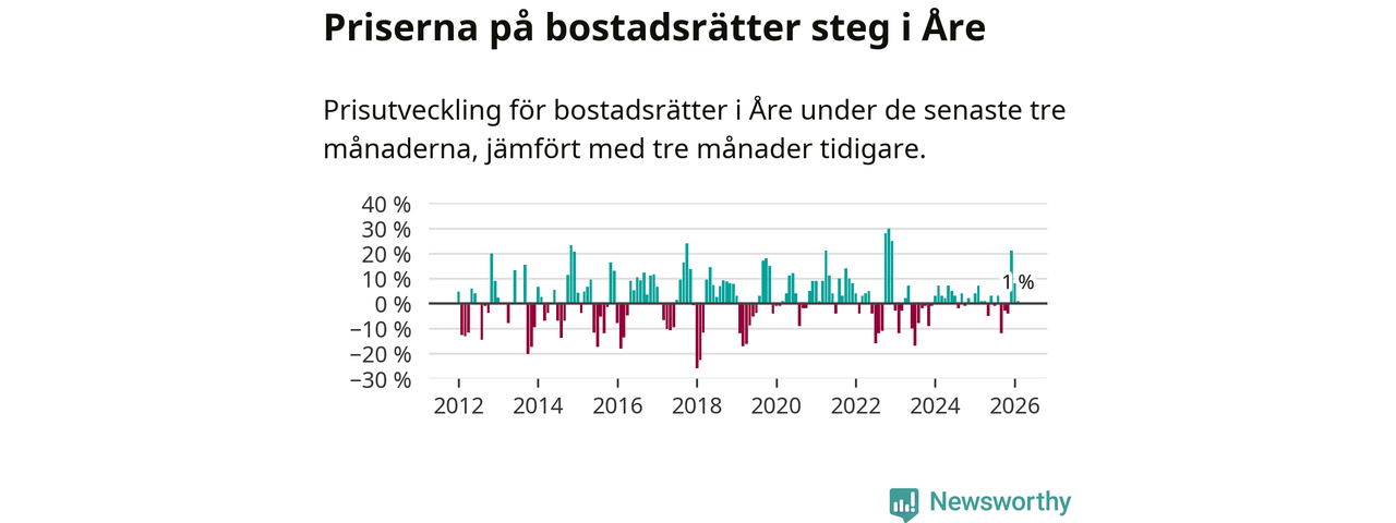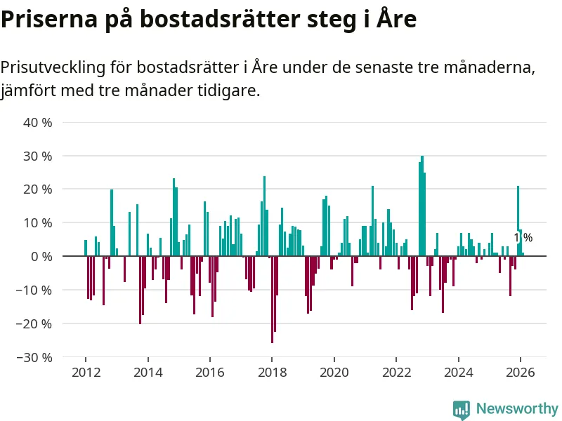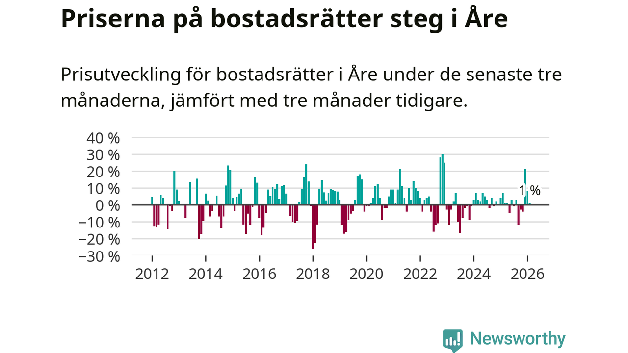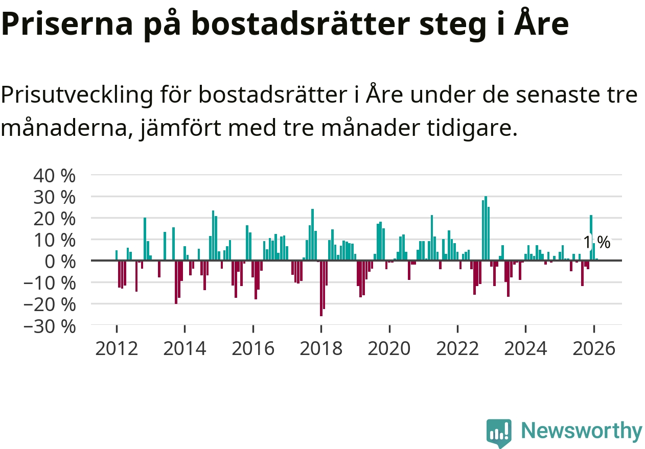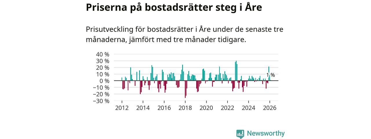 Priserna på bostadsrätter har gått upp i Åre kommun. Medelpriset på försäljningarna under de senaste tre månaderna visar på en uppgång med 1 procent.