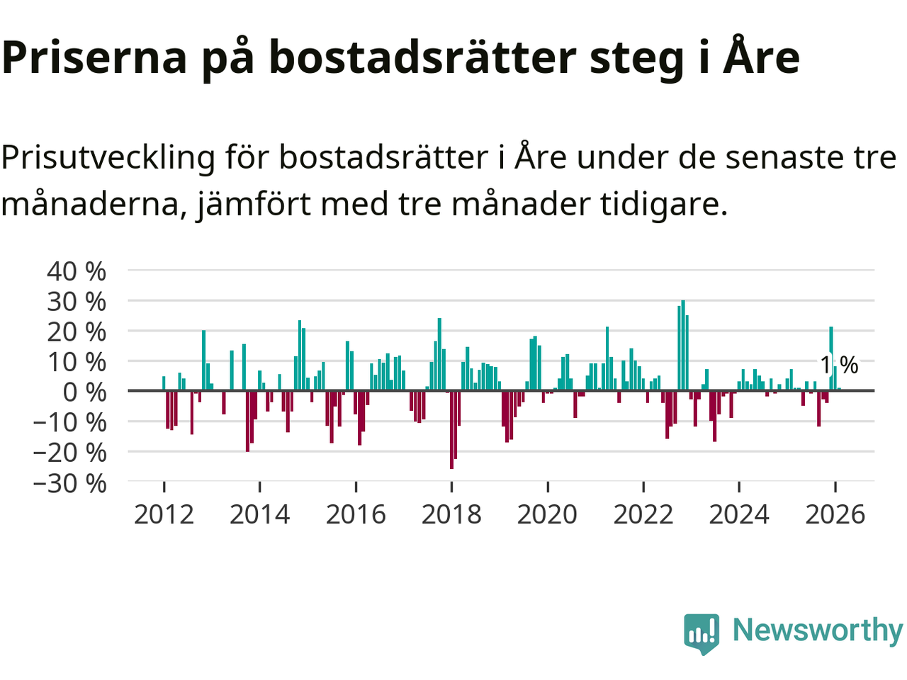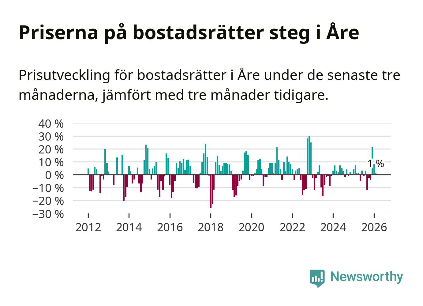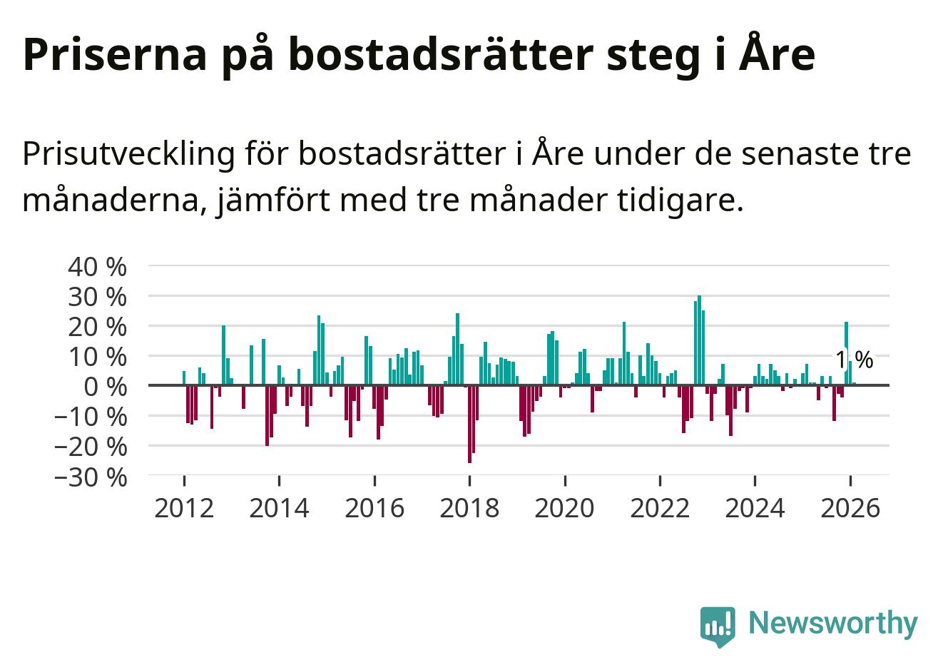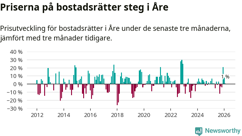 Priserna på bostadsrätter har gått upp i Åre kommun. Medelpriset på försäljningarna under de senaste tre månaderna visar på en uppgång med 1 procent.