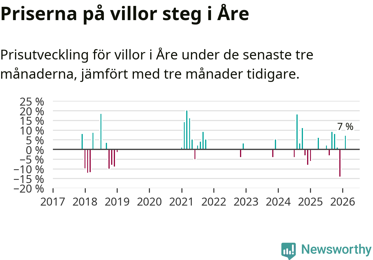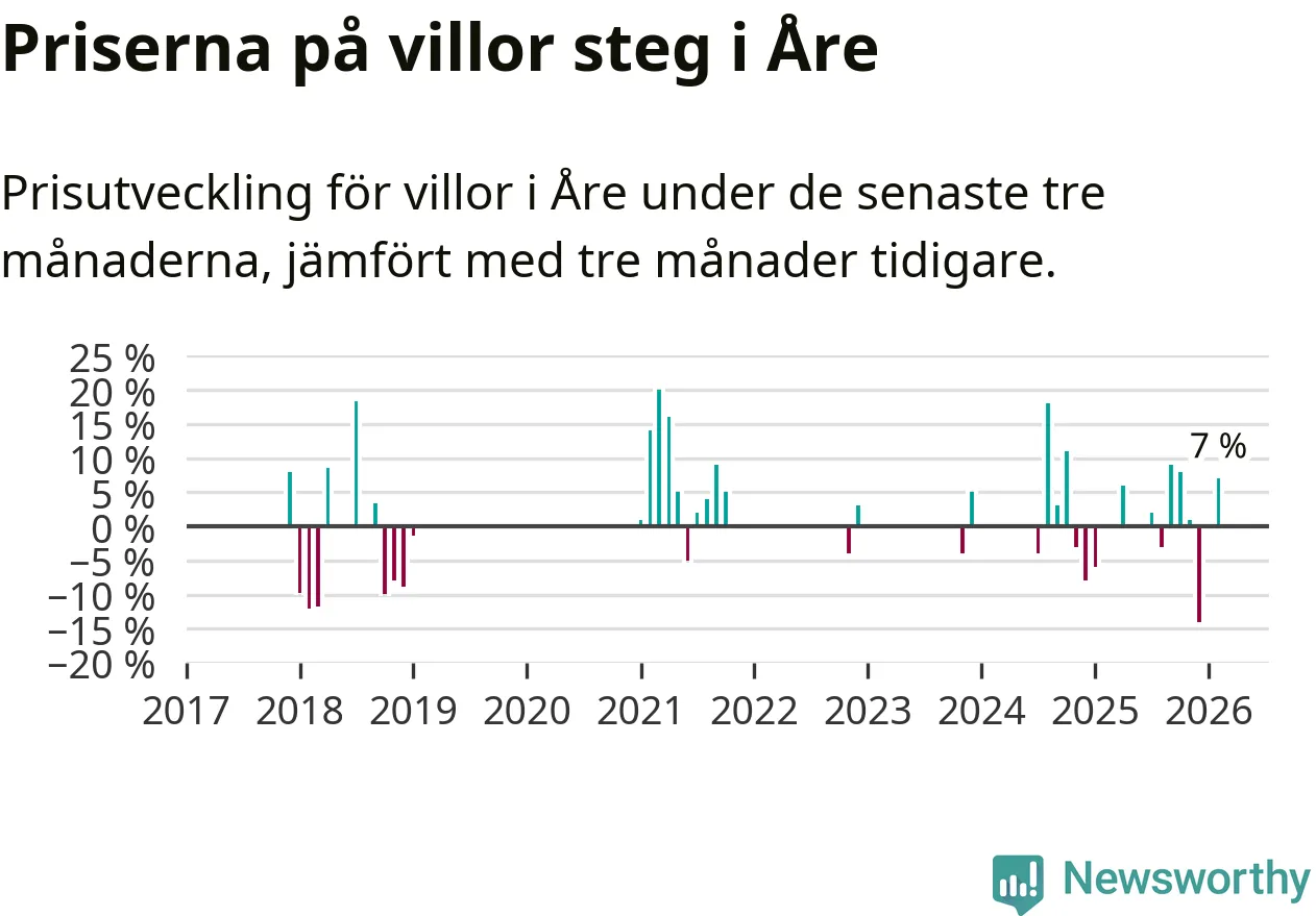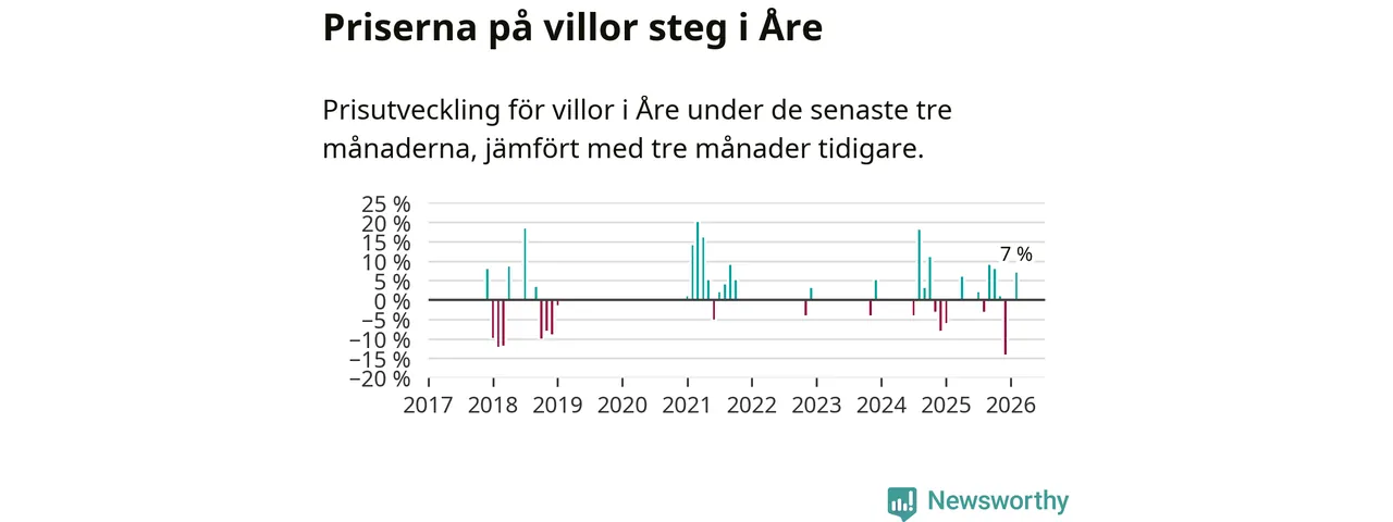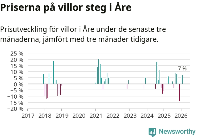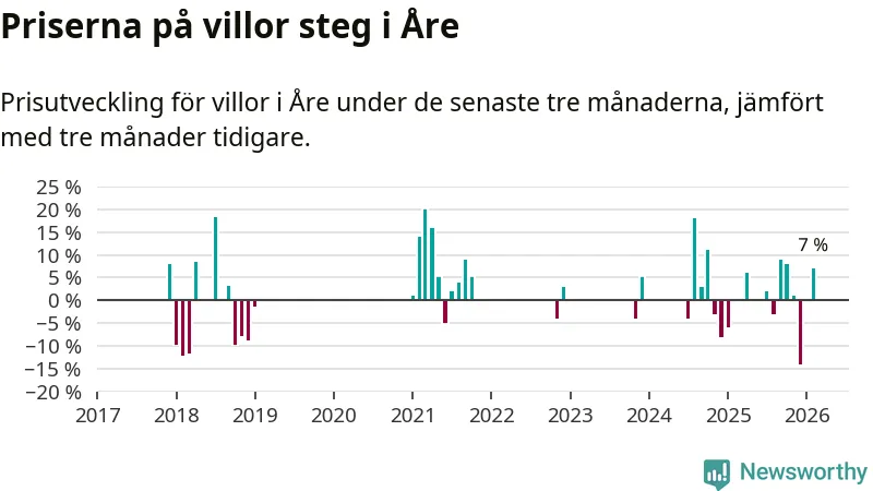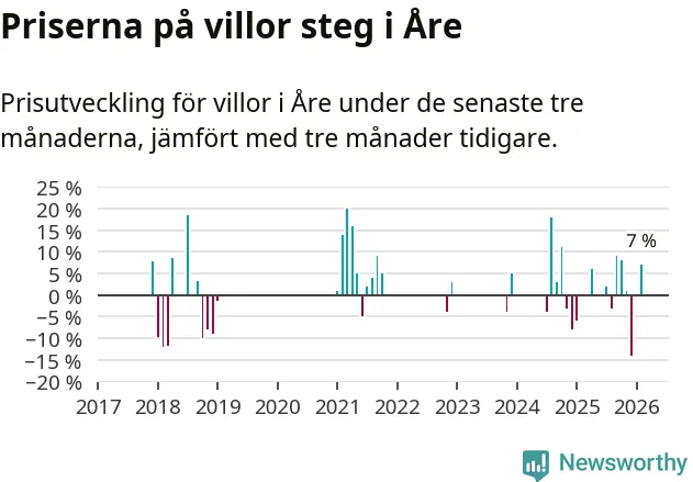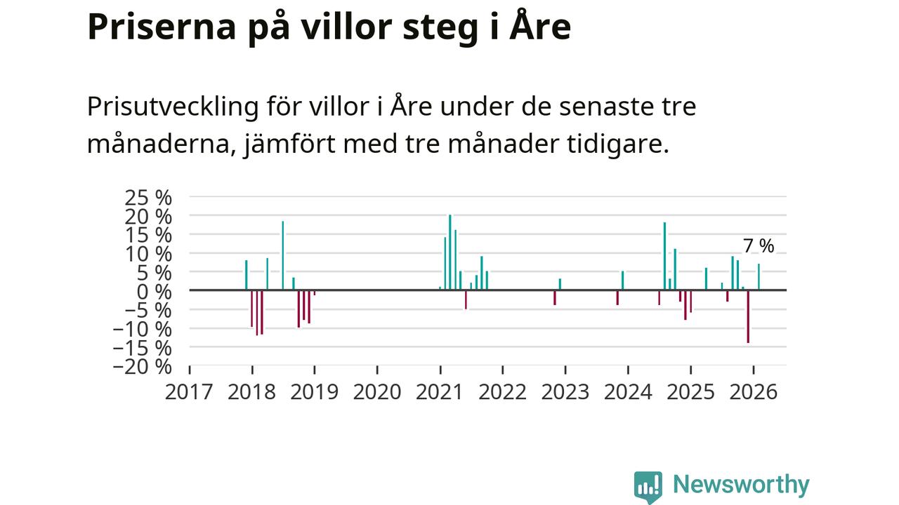 Statistiken visar även på en kännbar prisuppgång i Åre kommun. Medelpriset på försäljningarna av villor i kommunen var 7 procent högre än för tre månader sedan. I hela Jämtland däremot ligger villapriserna stilla.