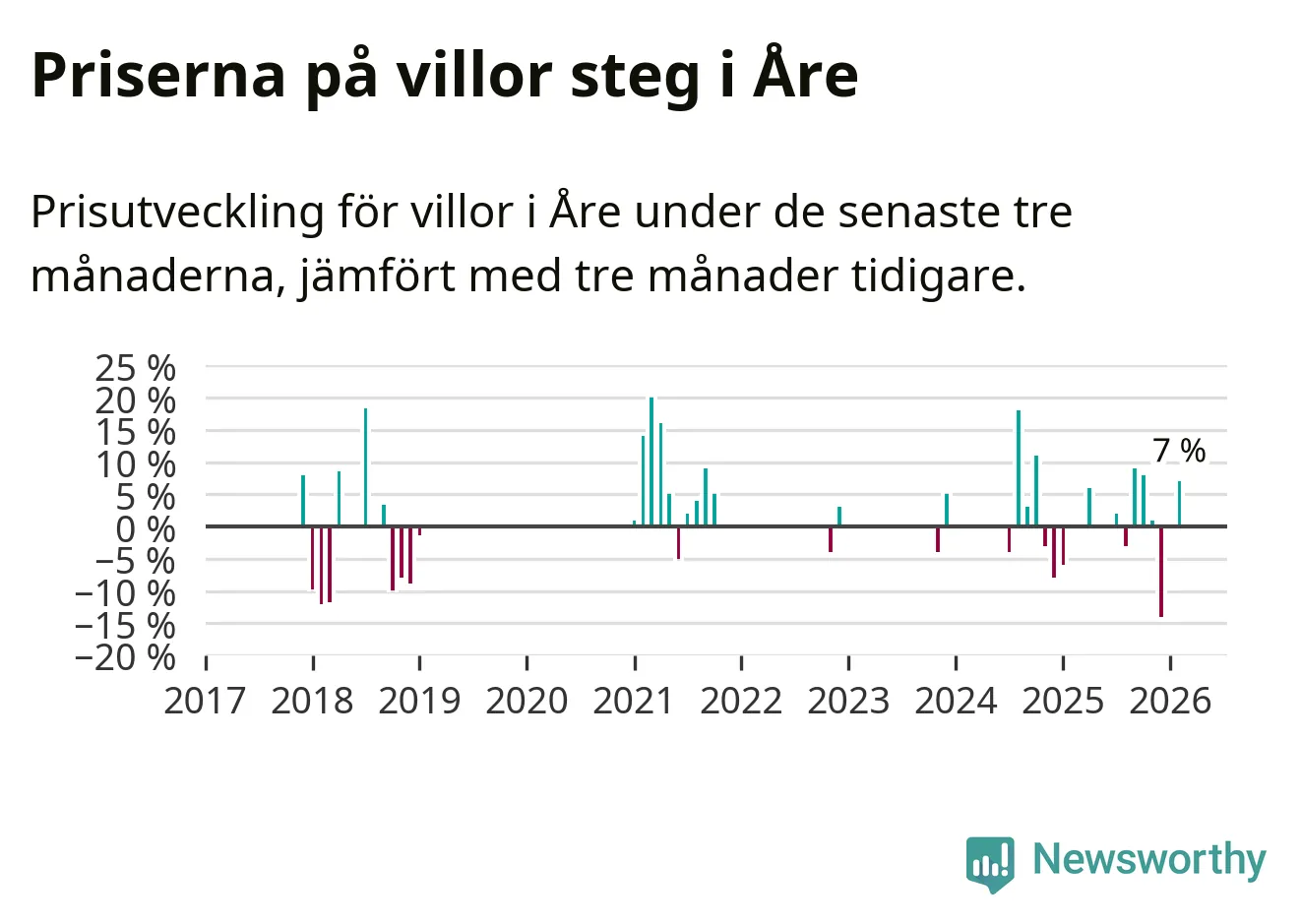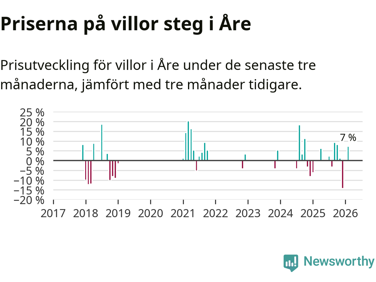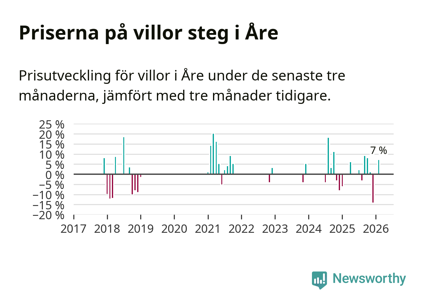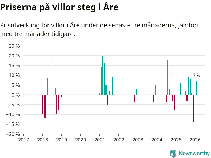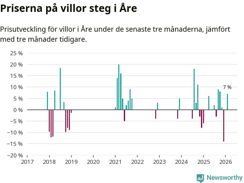 Statistiken visar även på en kännbar prisuppgång i Åre kommun. Medelpriset på försäljningarna av villor i kommunen var 7 procent högre än för tre månader sedan. I hela Jämtland däremot ligger villapriserna stilla.