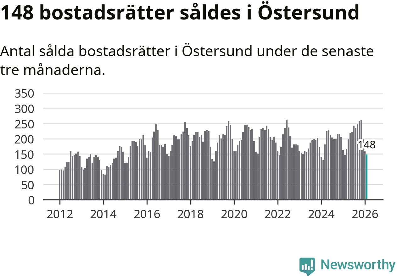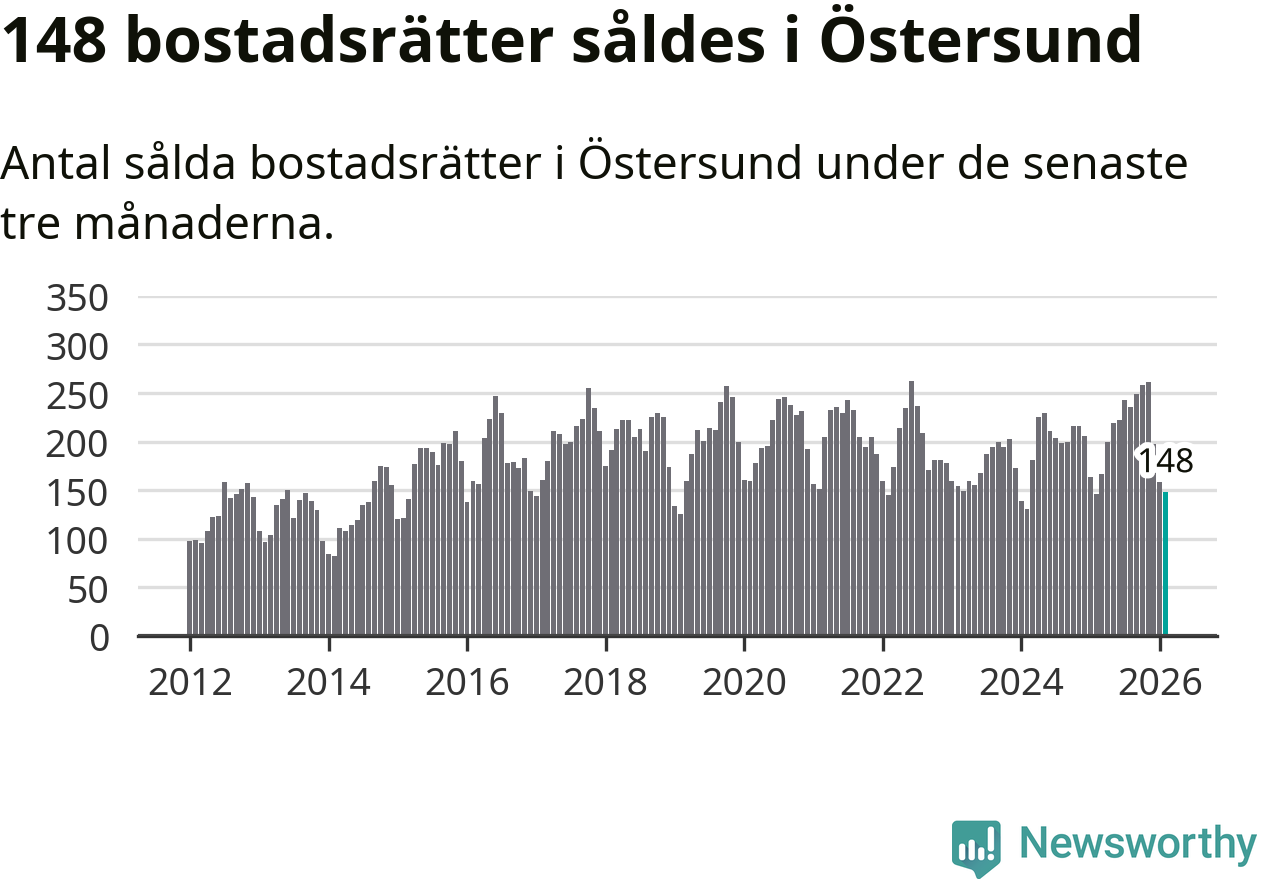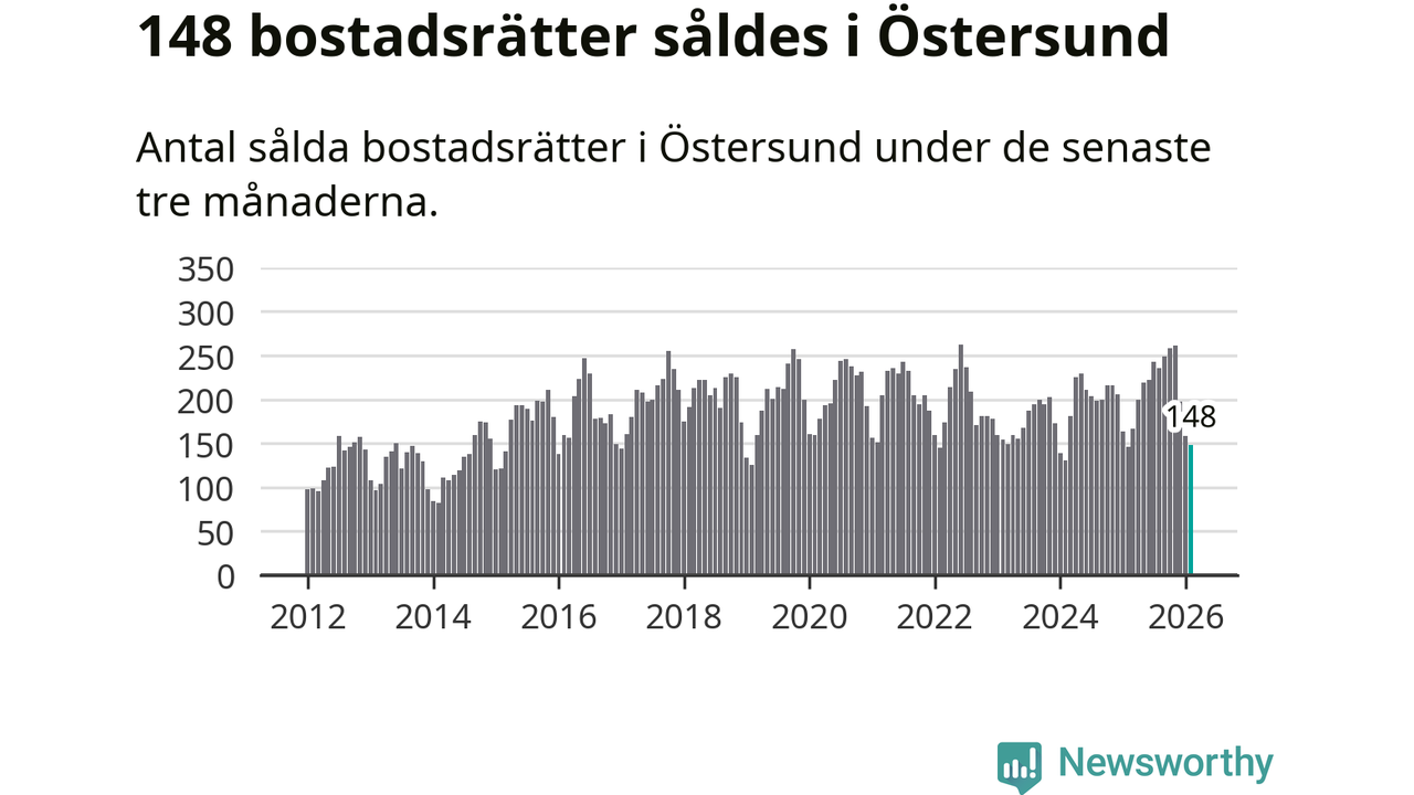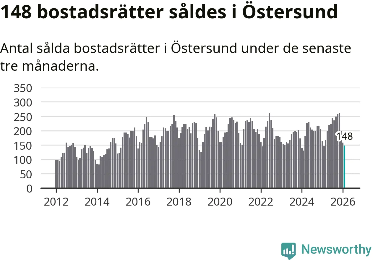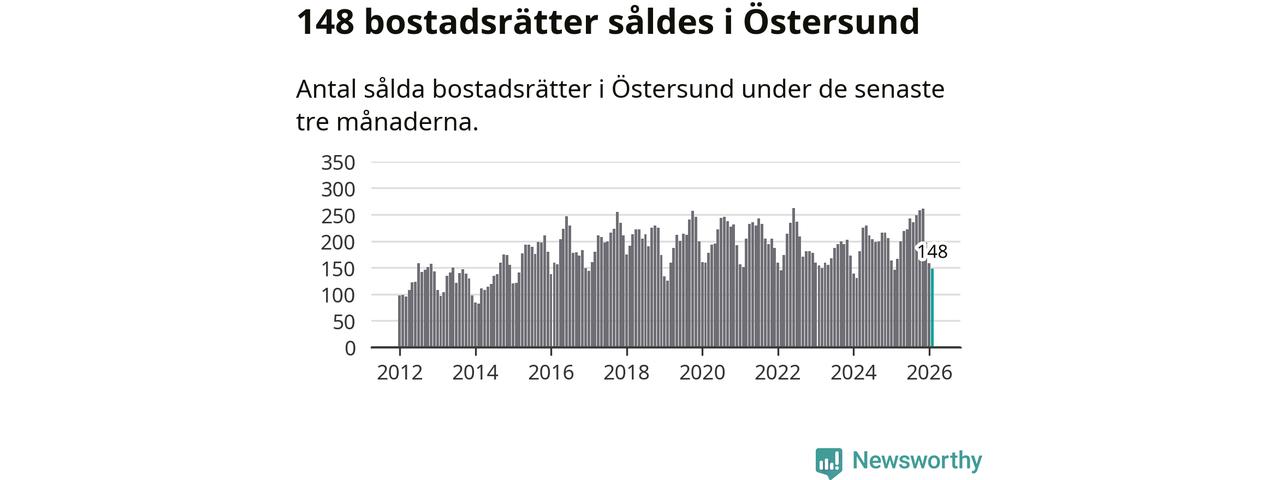 Sammanlagt såldes 148 bostadsrätter i Östersunds kommun mellan december och februari till ett genomsnittligt pris på 1,5 miljoner kronor. I fjol gjordes 146 affärer vid den här tiden på året.
