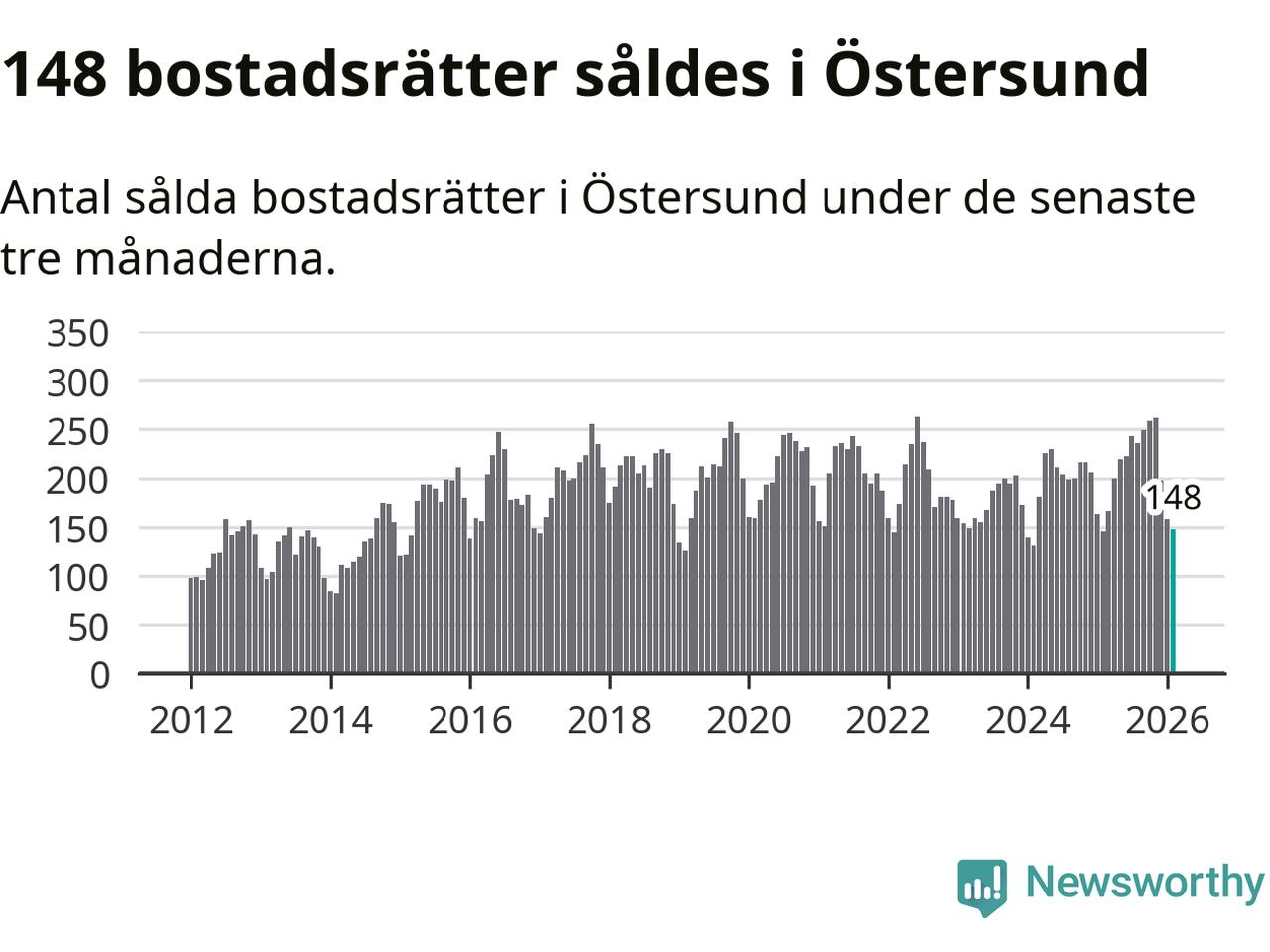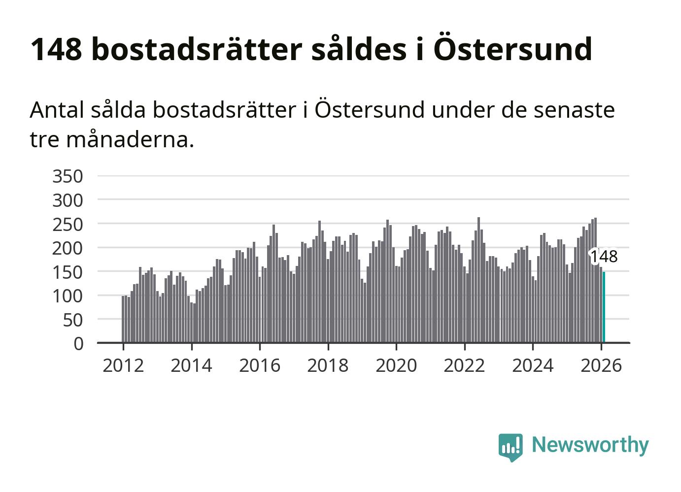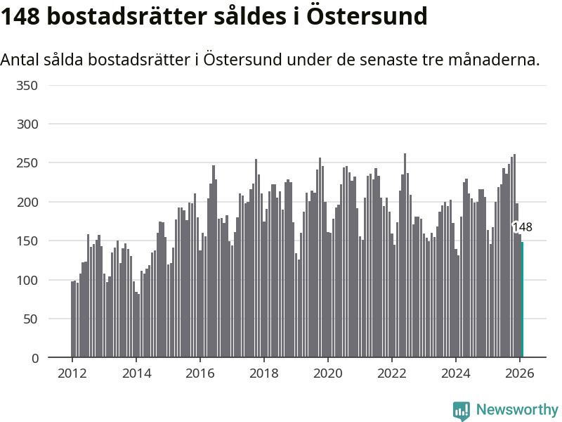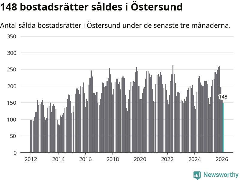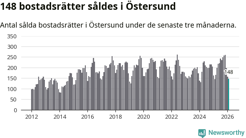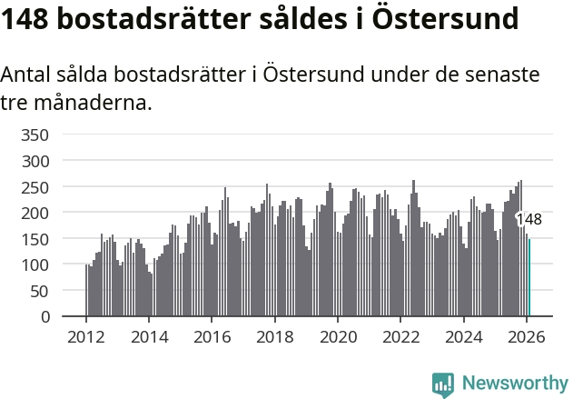 Sammanlagt såldes 148 bostadsrätter i Östersunds kommun mellan december och februari till ett genomsnittligt pris på 1,5 miljoner kronor. I fjol gjordes 146 affärer vid den här tiden på året.