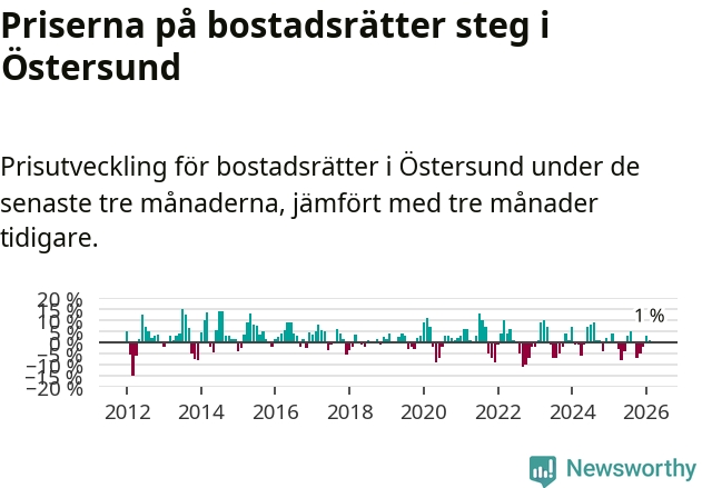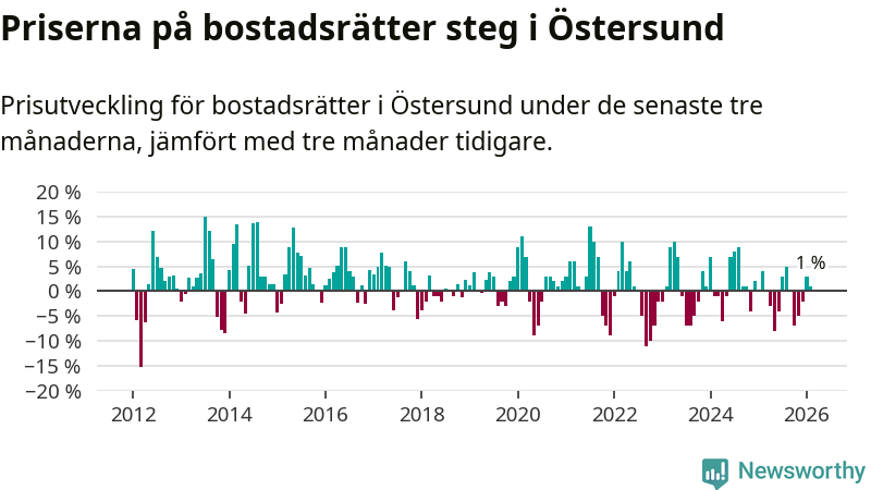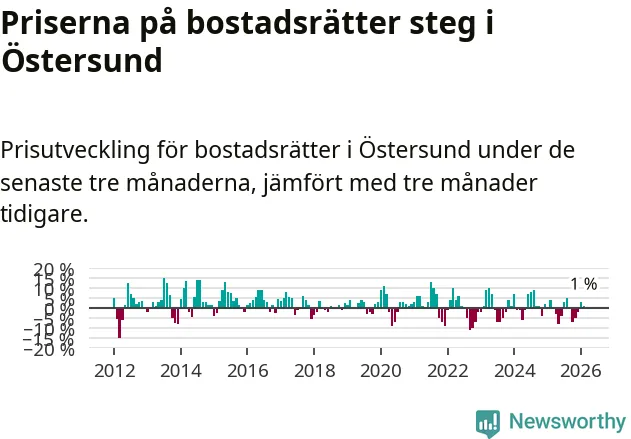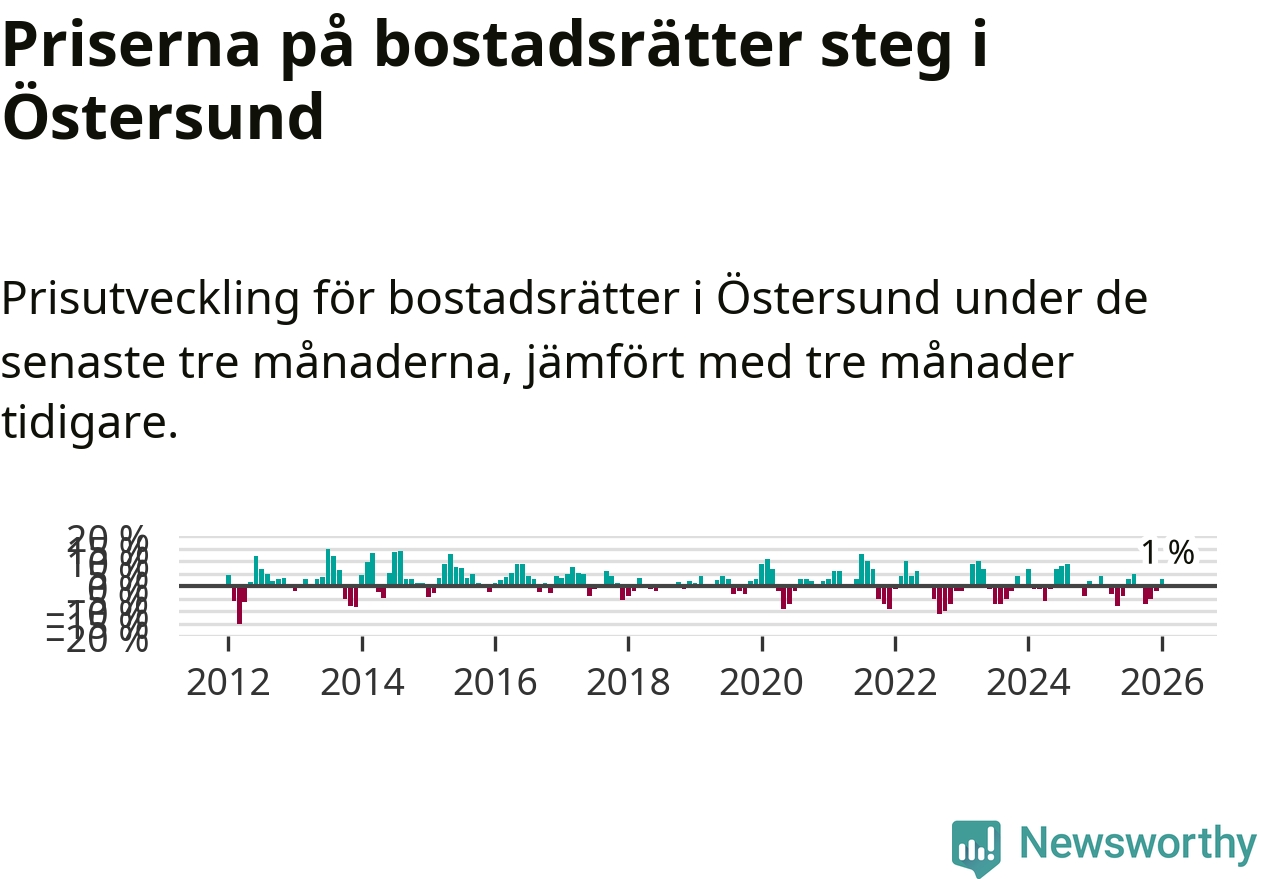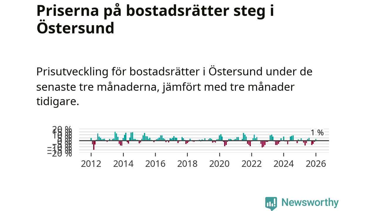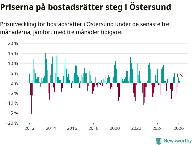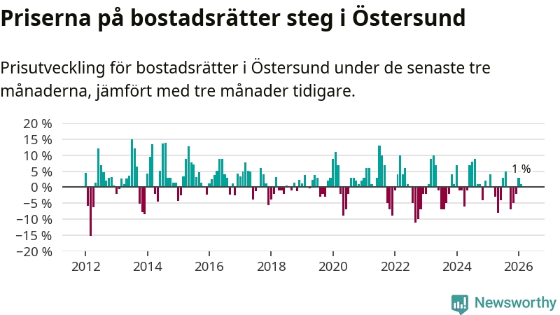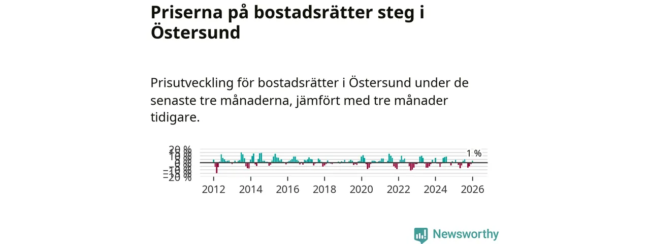 Priserna på bostadsrätter har gått upp i Östersunds kommun. Medelpriset på försäljningarna under de senaste tre månaderna visar på en uppgång med 1 procent.