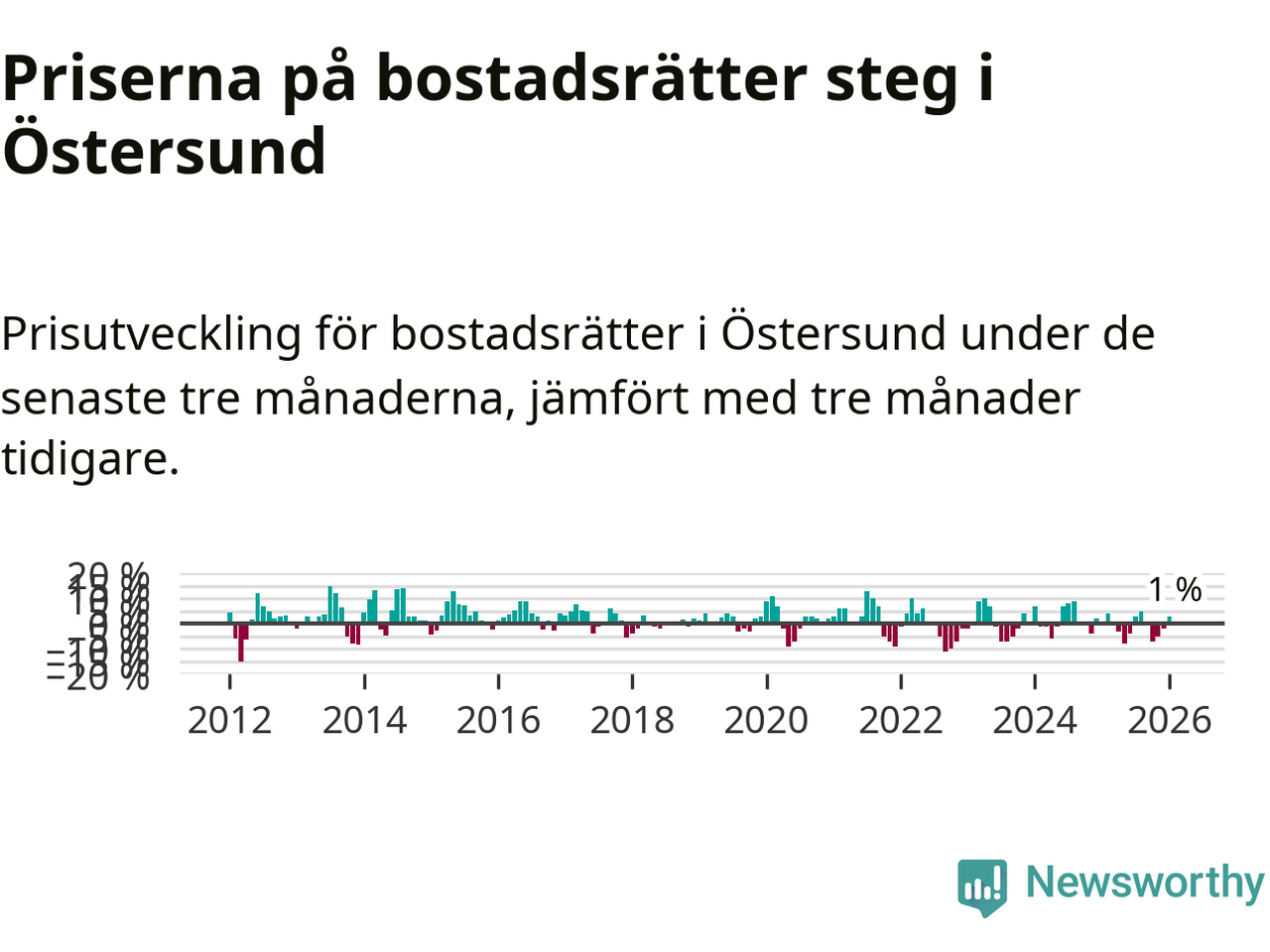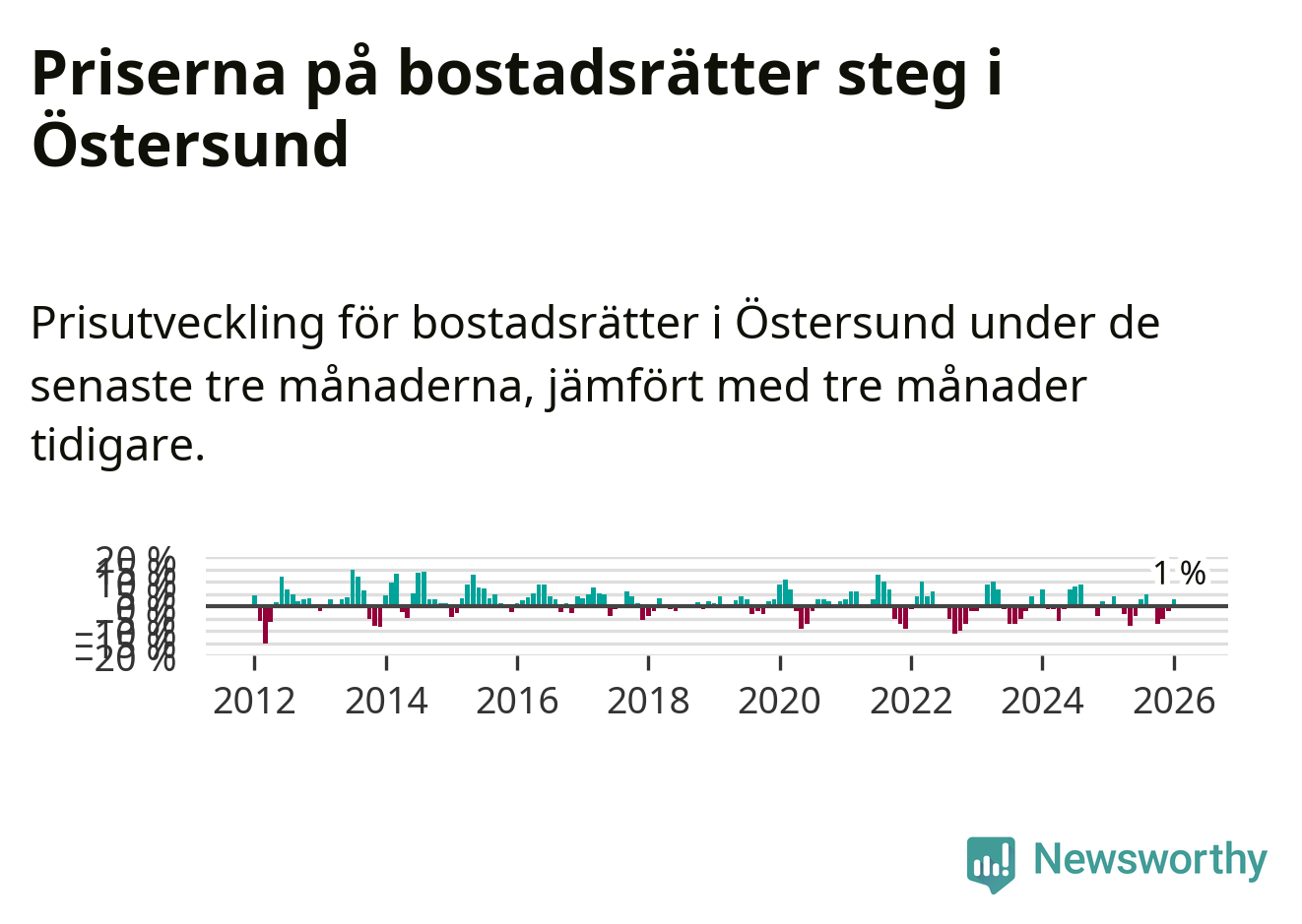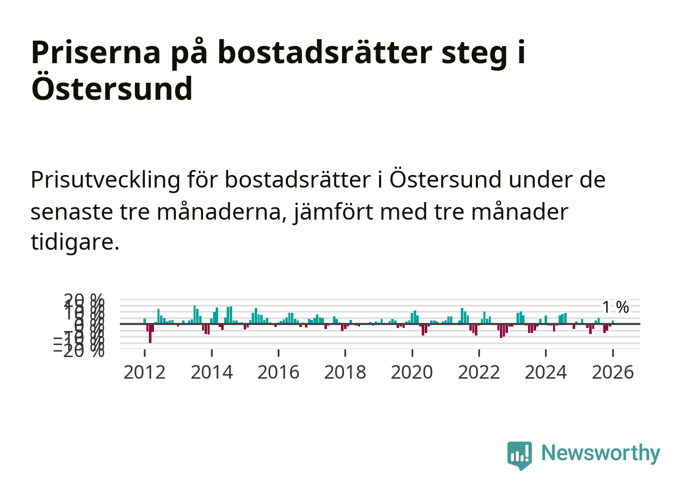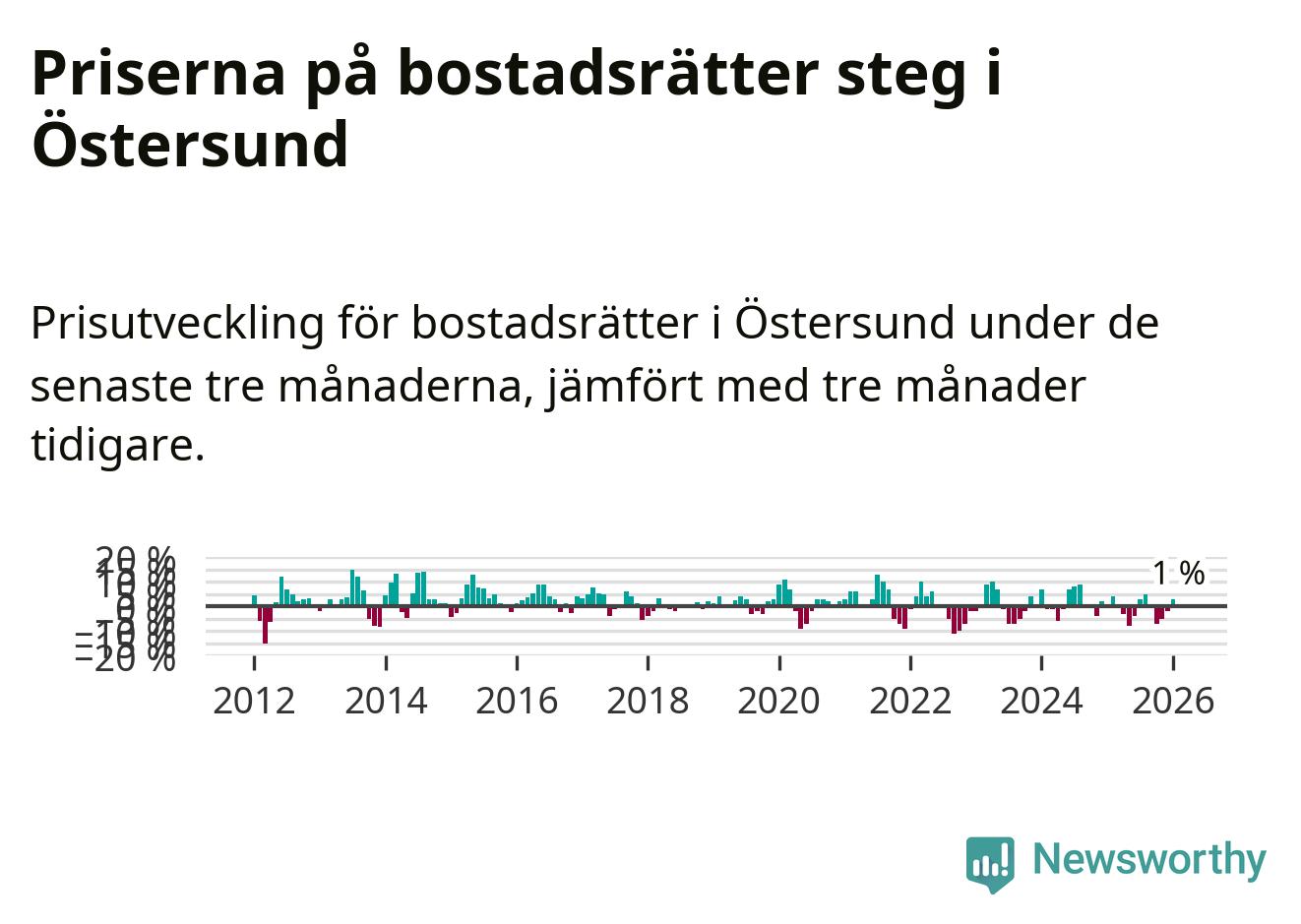 Priserna på bostadsrätter har gått upp i Östersunds kommun. Medelpriset på försäljningarna under de senaste tre månaderna visar på en uppgång med 1 procent.