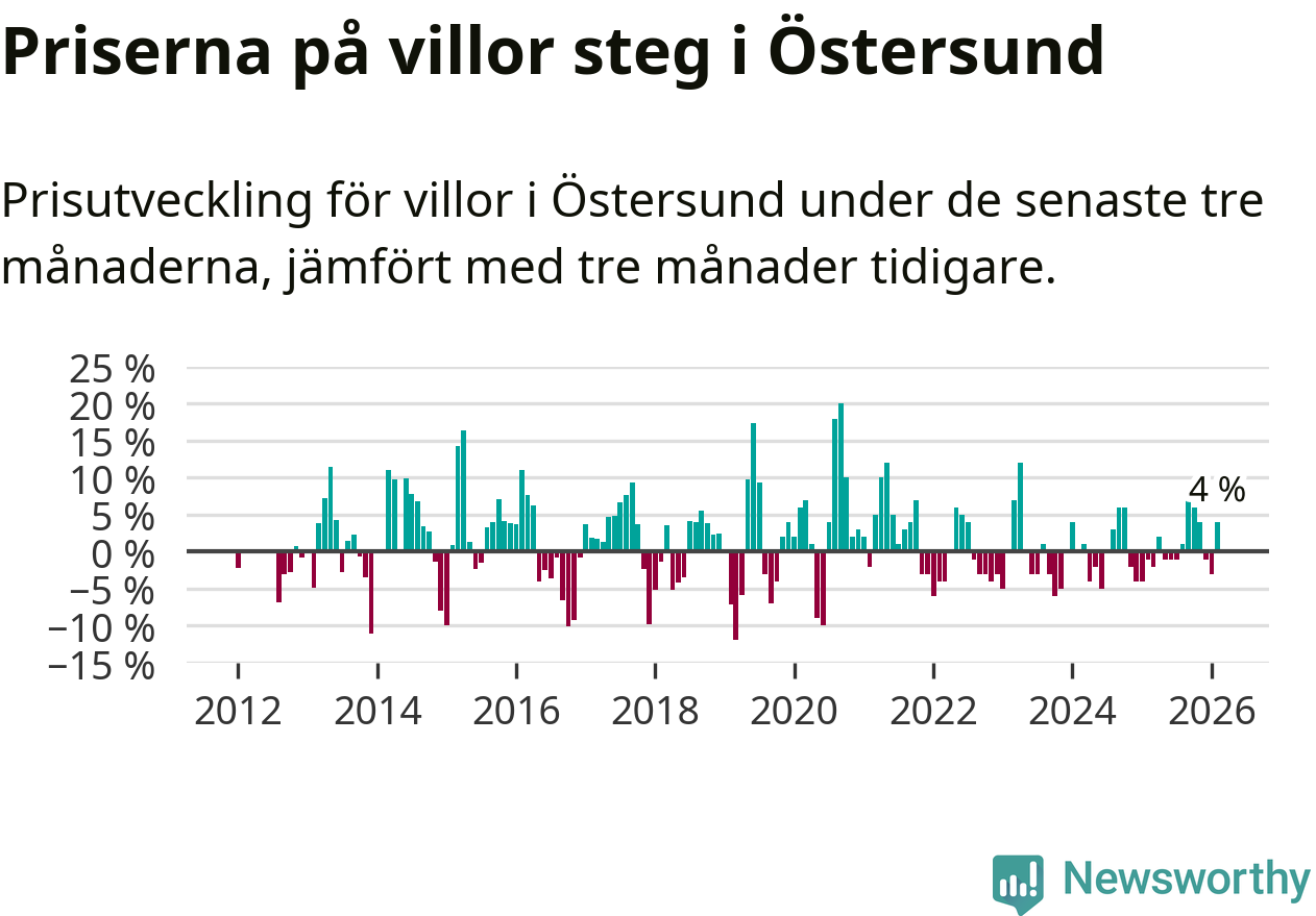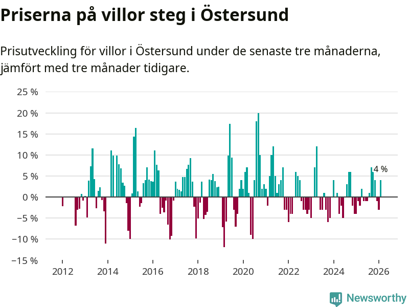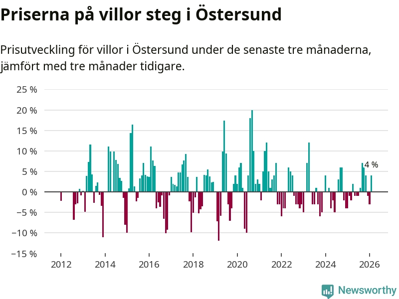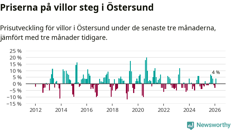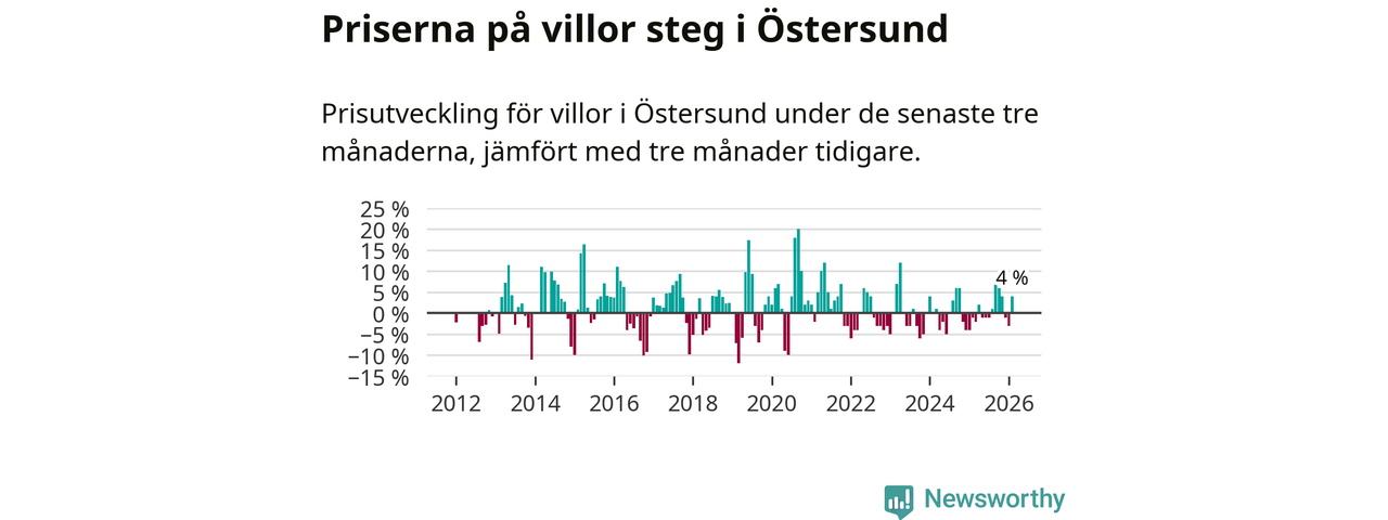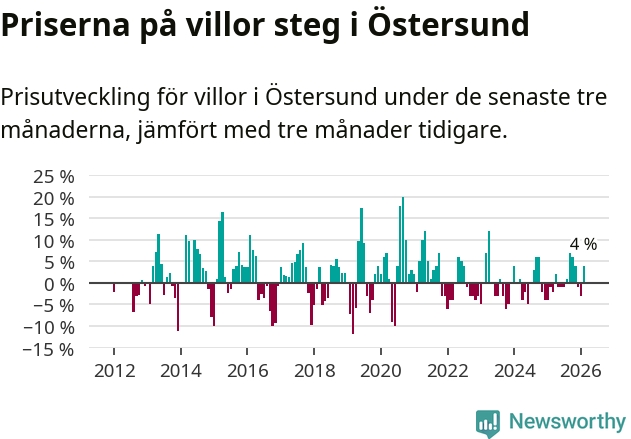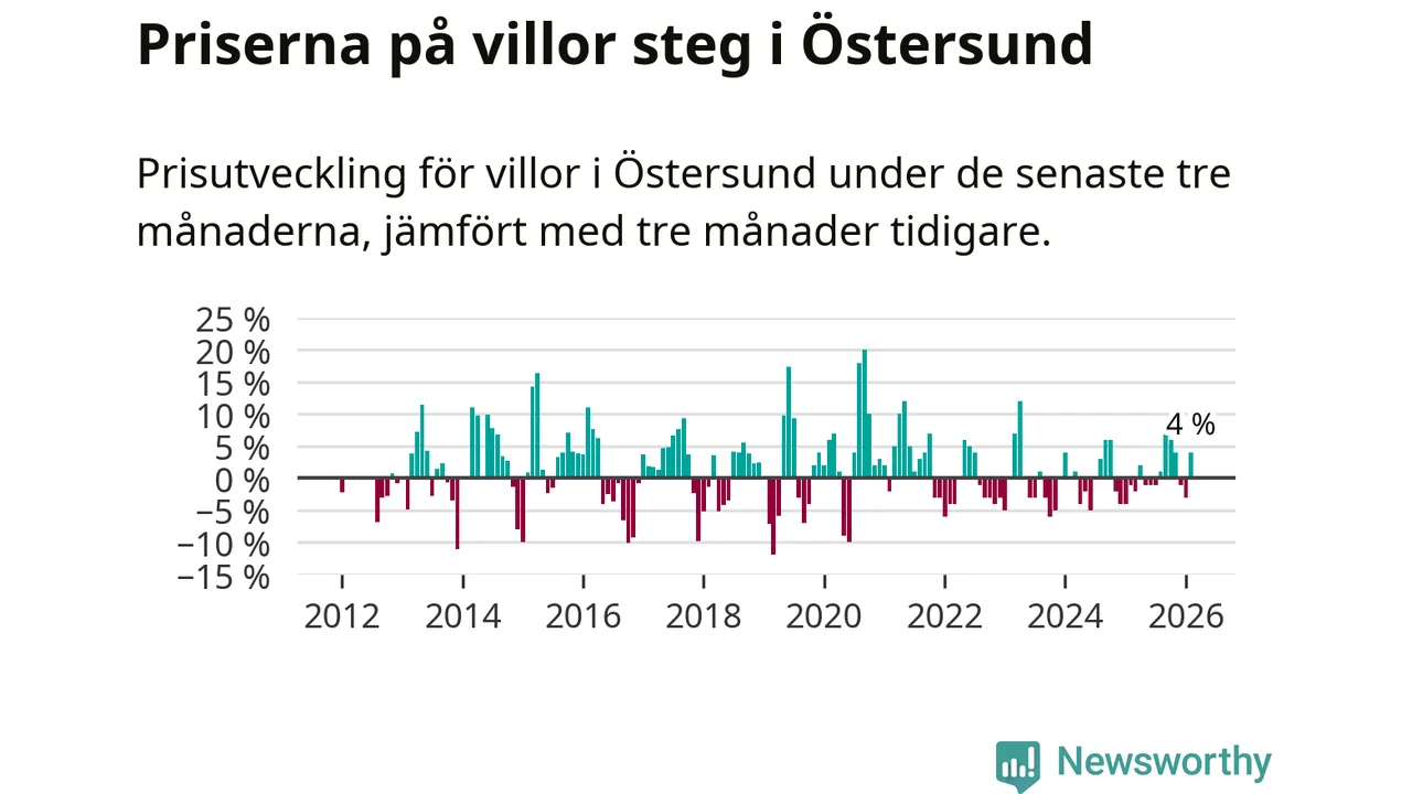 Villapriserna har gått upp i Östersunds kommun. Medelpriset på försäljningarna under de senaste tre månaderna visar på en uppgång med 4 procent.