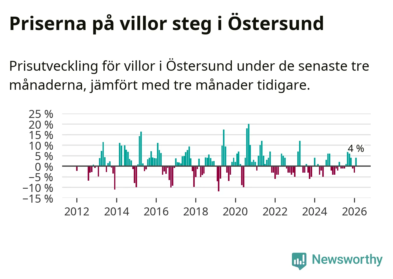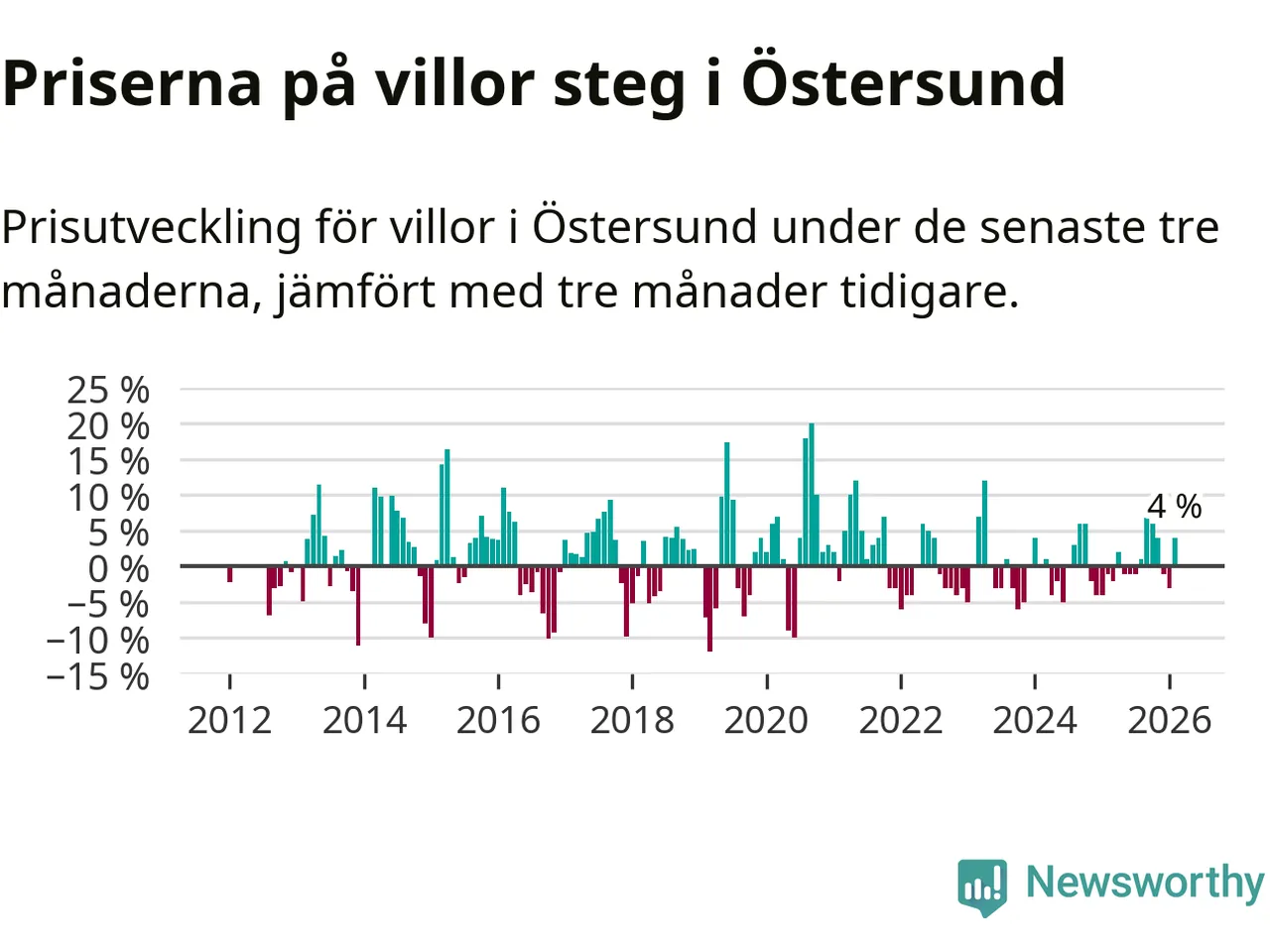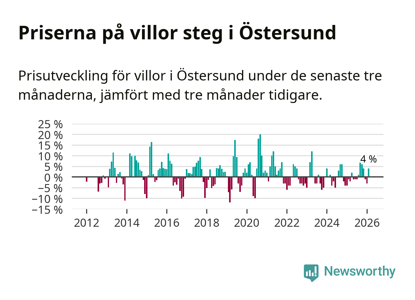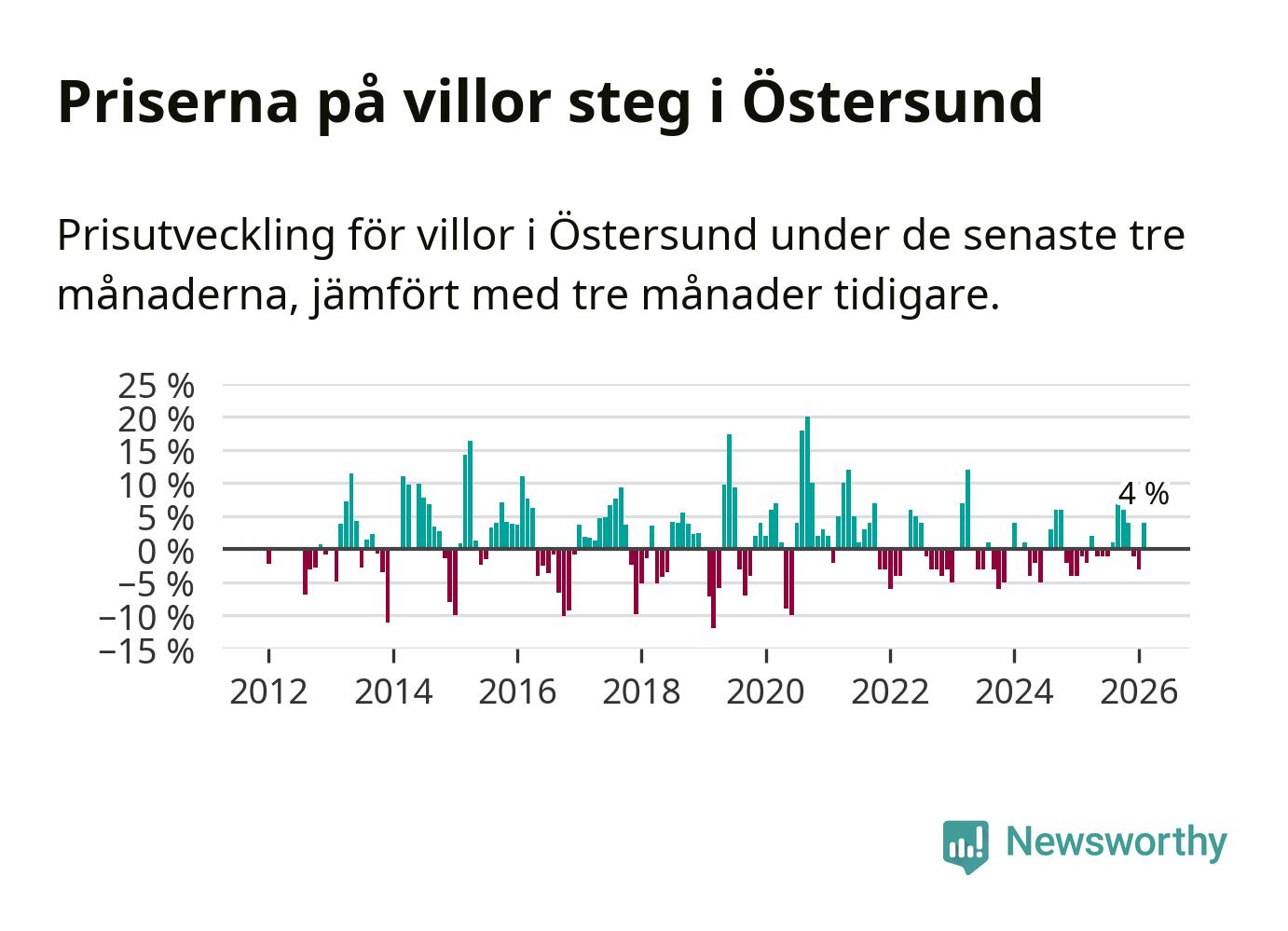 Villapriserna har gått upp i Östersunds kommun. Medelpriset på försäljningarna under de senaste tre månaderna visar på en uppgång med 4 procent.