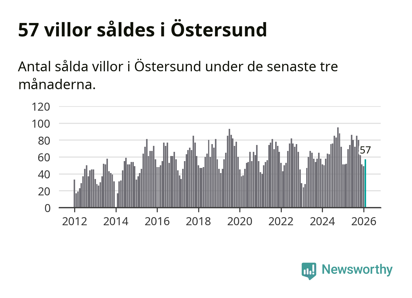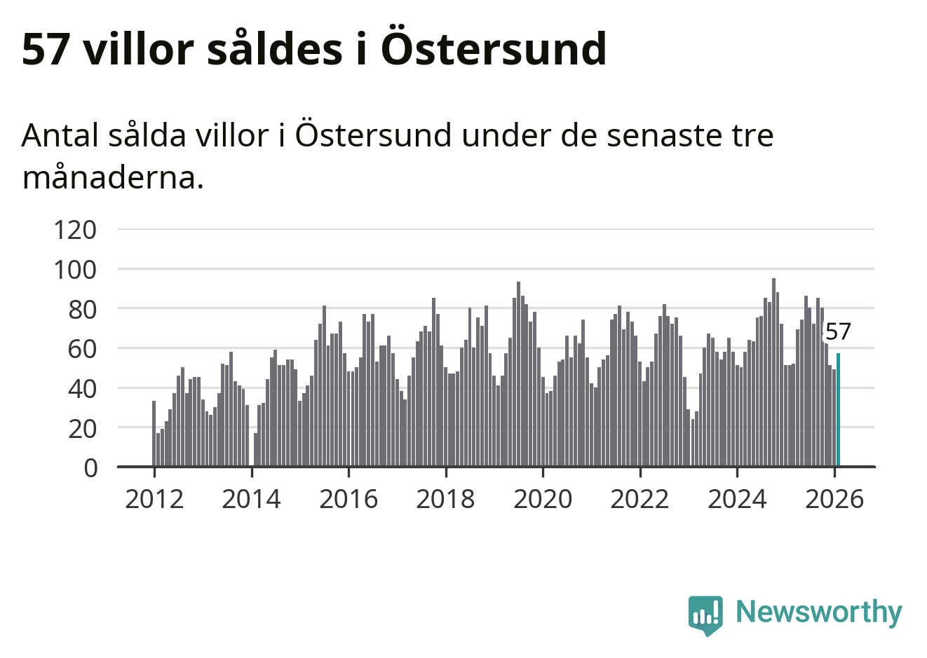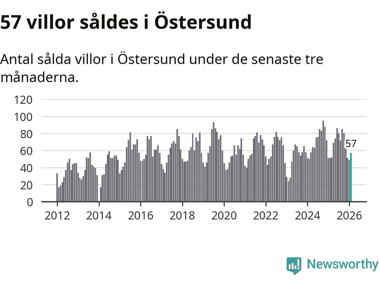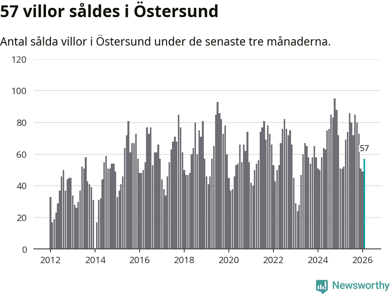 Sammanlagt såldes 57 villor i Östersunds kommun mellan december och februari till ett genomsnittligt pris på 3,7 miljoner kronor. I fjol gjordes 51 affärer vid den här tiden på året.