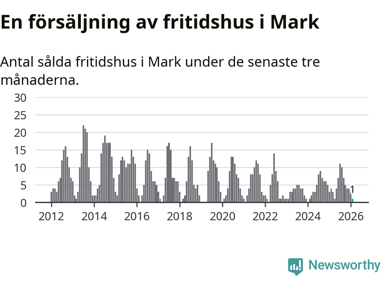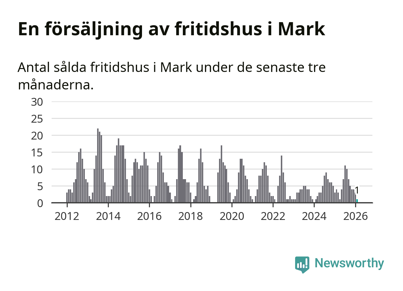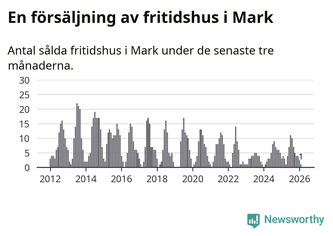 Mellan december och februari gjordes sammanlagt en affär med fritidshus i Marks kommun. Det kan jämföras med fyra vid motsvarande tid i fjol.