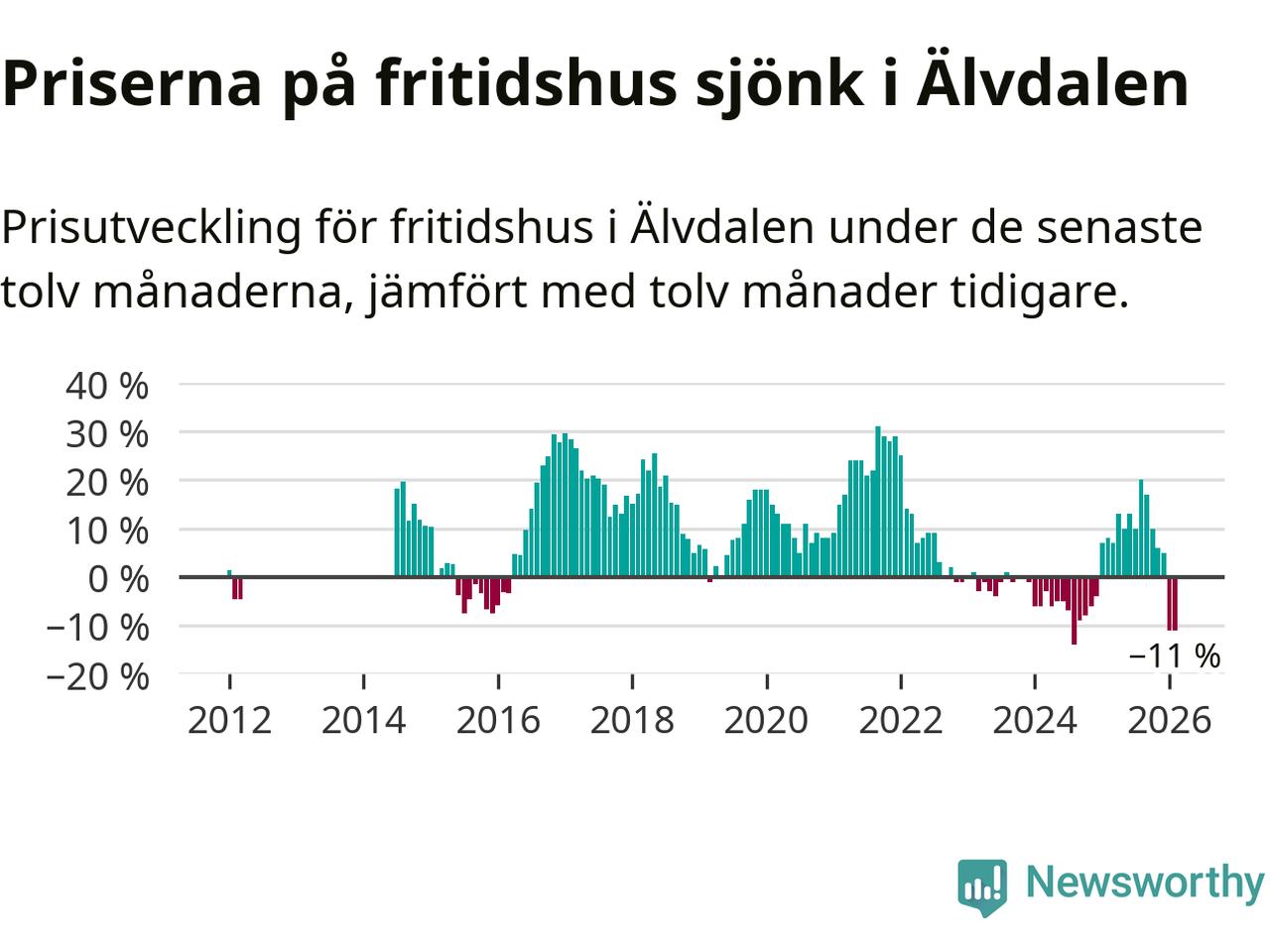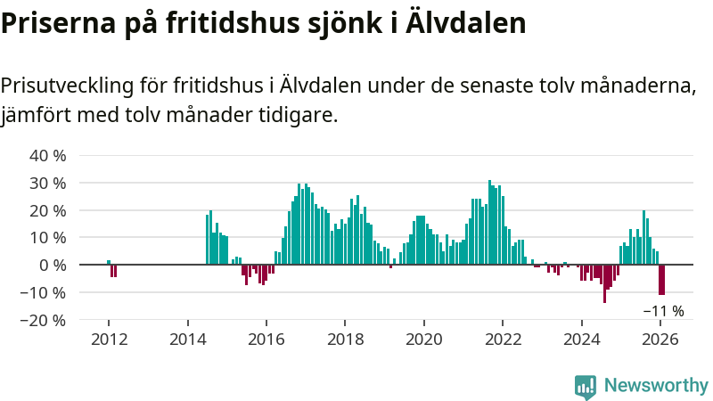 Priserna på fritidshus har gått ner i Älvdalens kommun. Medelpriset på försäljningarna under de senaste tolv månaderna visar på en nedgång med 11 procent.
