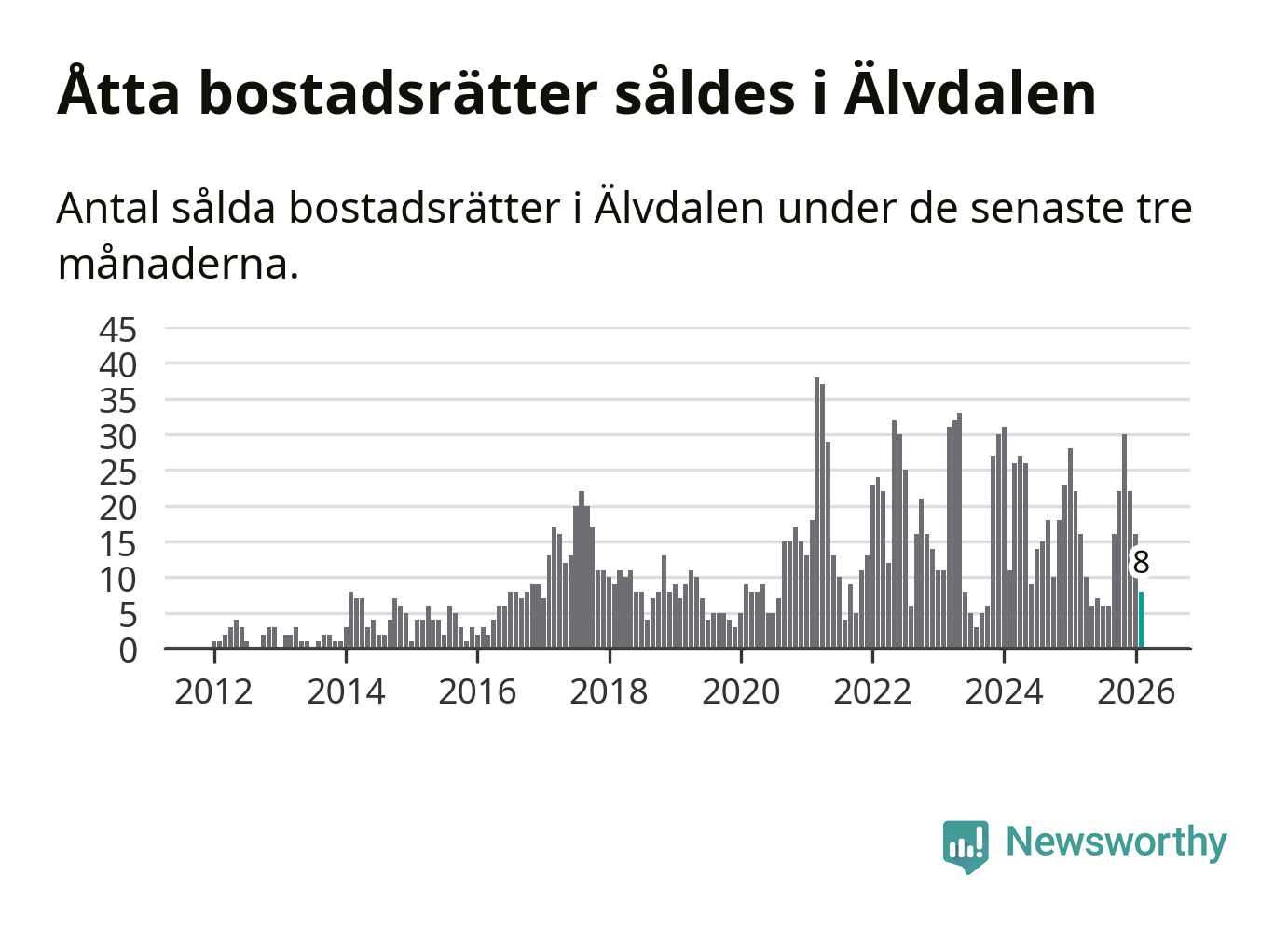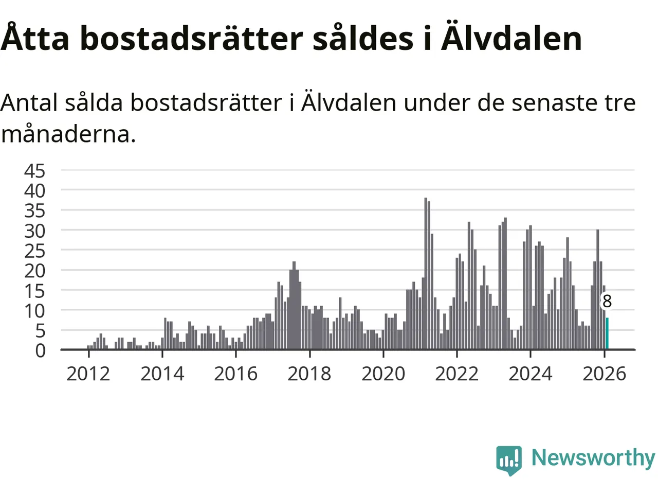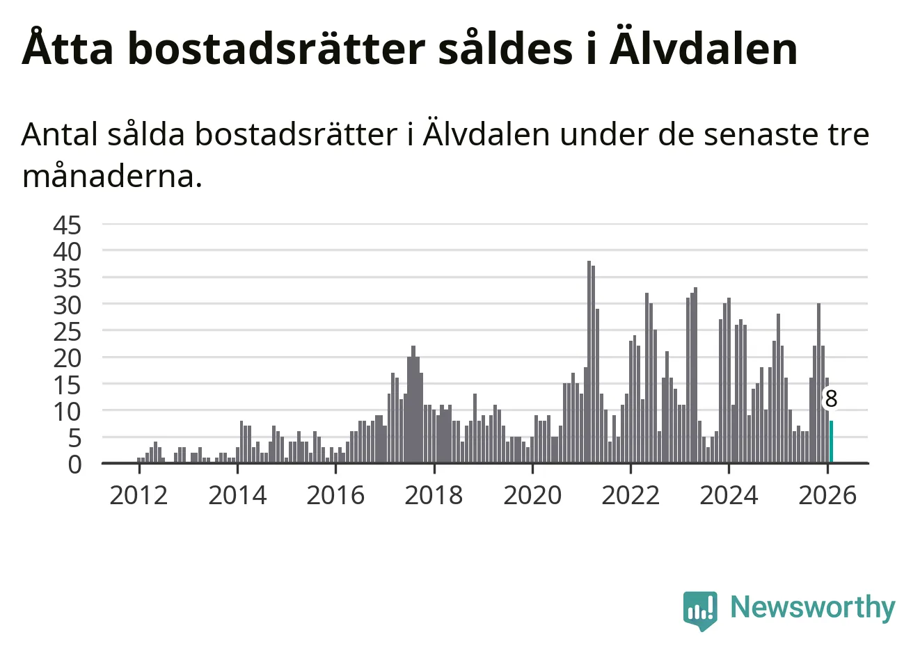 Mellan december och februari gjordes sammanlagt åtta affärer med bostadsrätter i Älvdalens kommun. Det kan jämföras med 22 vid motsvarande tid i fjol.