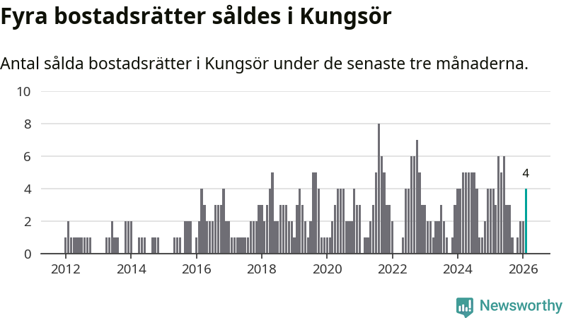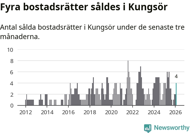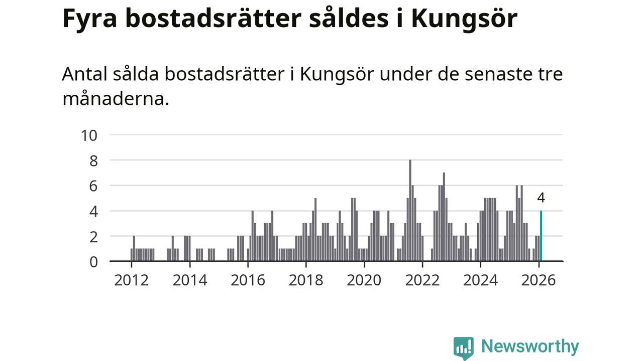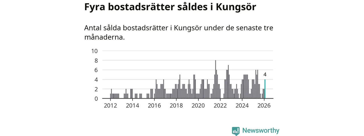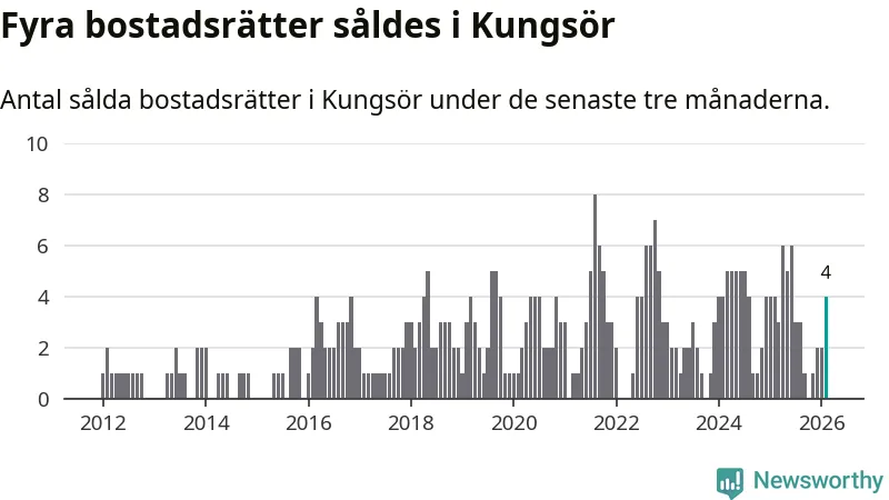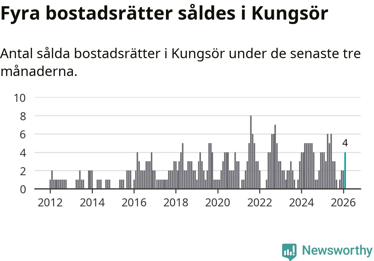 Mellan december och februari gjordes sammanlagt fyra affärer med bostadsrätter i Kungsörs kommun. Det är lika många affärer som vid motsvarande tid i fjol.