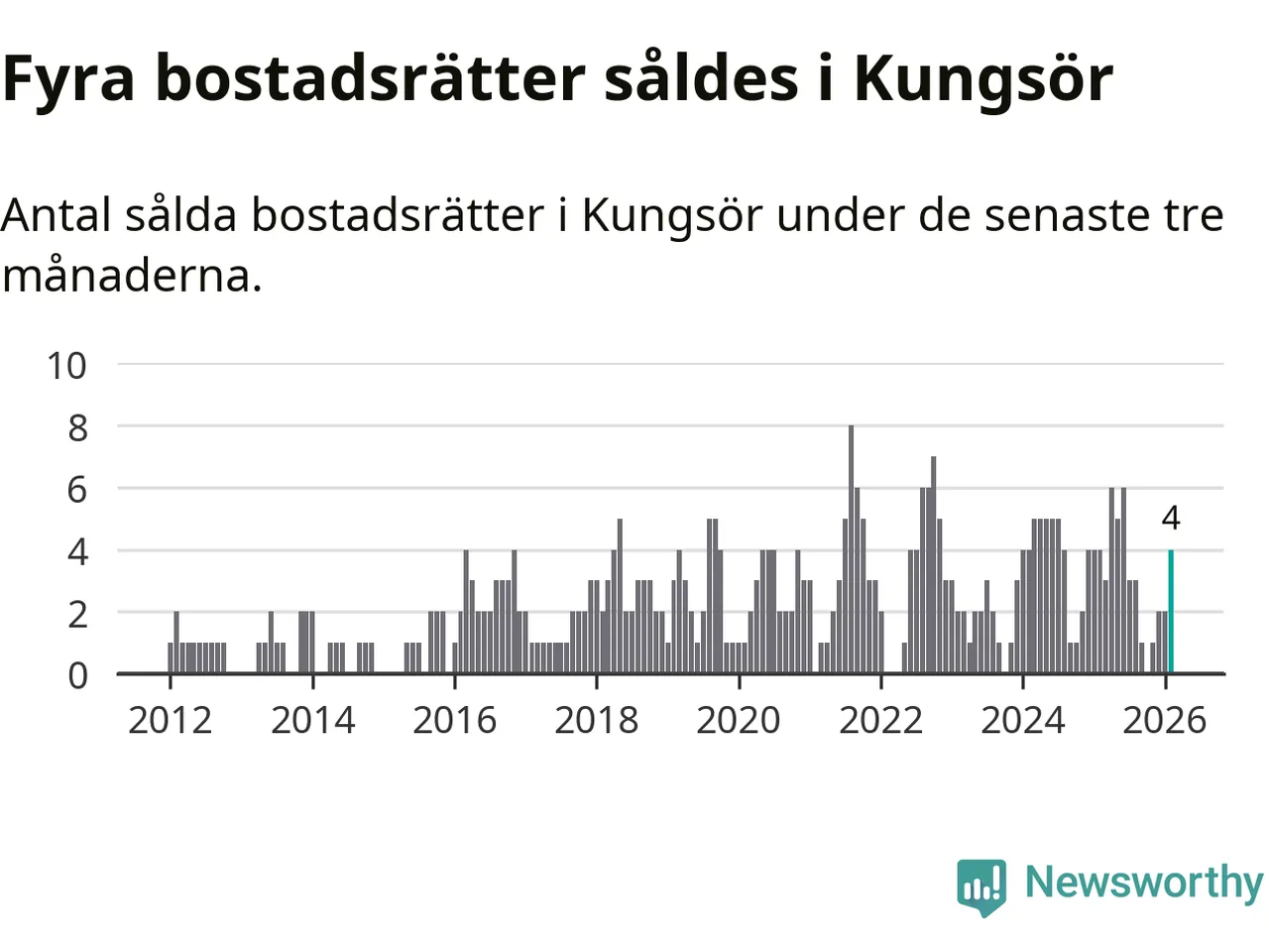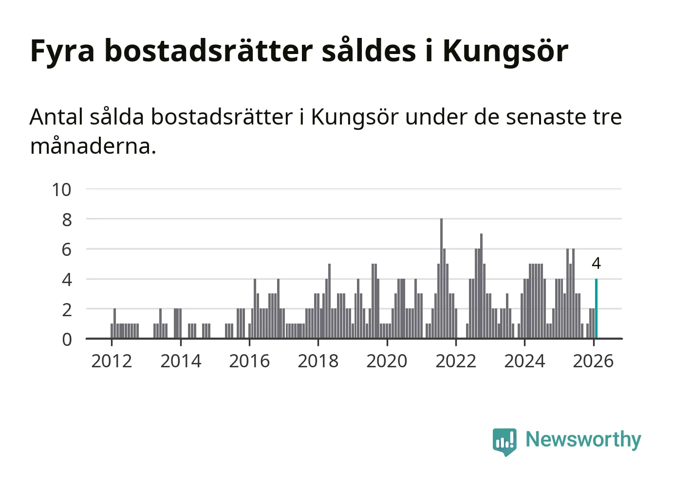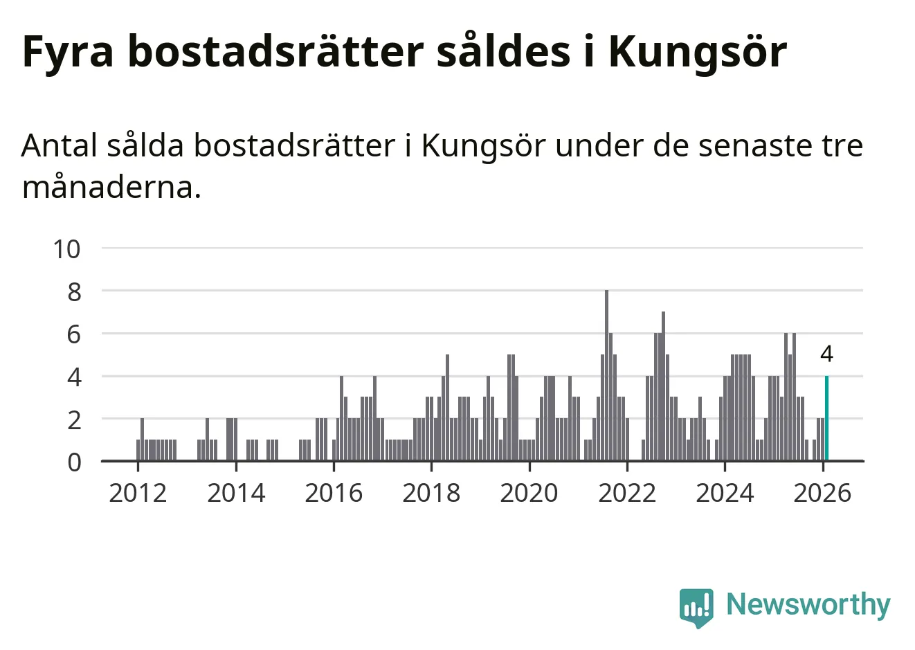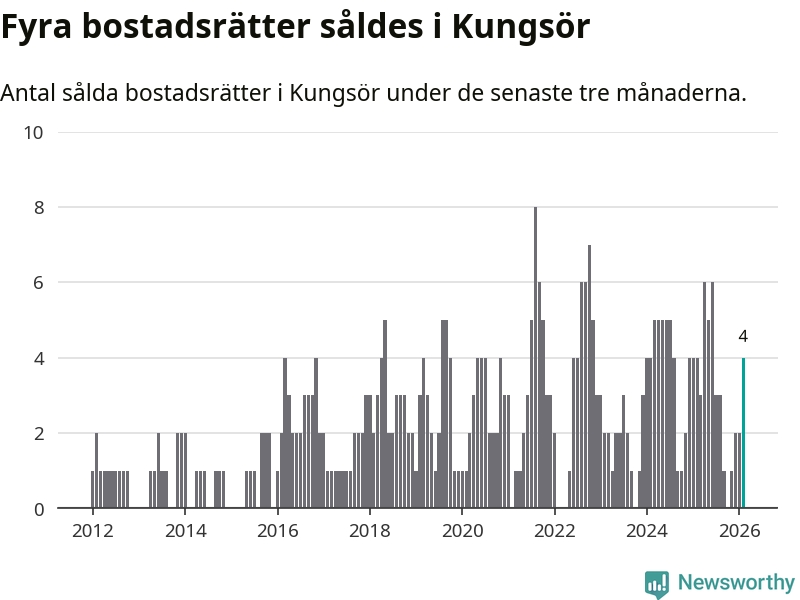 Mellan december och februari gjordes sammanlagt fyra affärer med bostadsrätter i Kungsörs kommun. Det är lika många affärer som vid motsvarande tid i fjol.