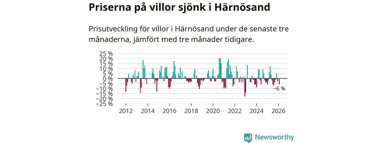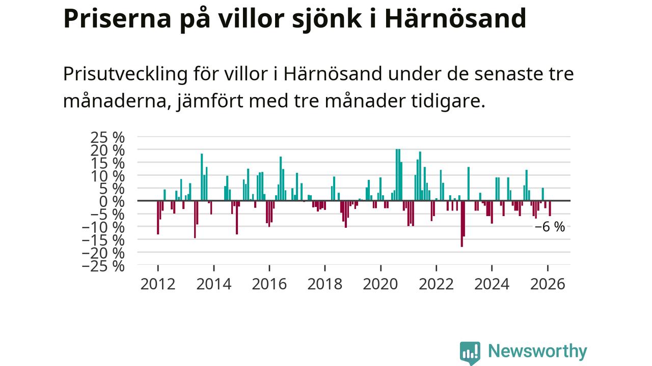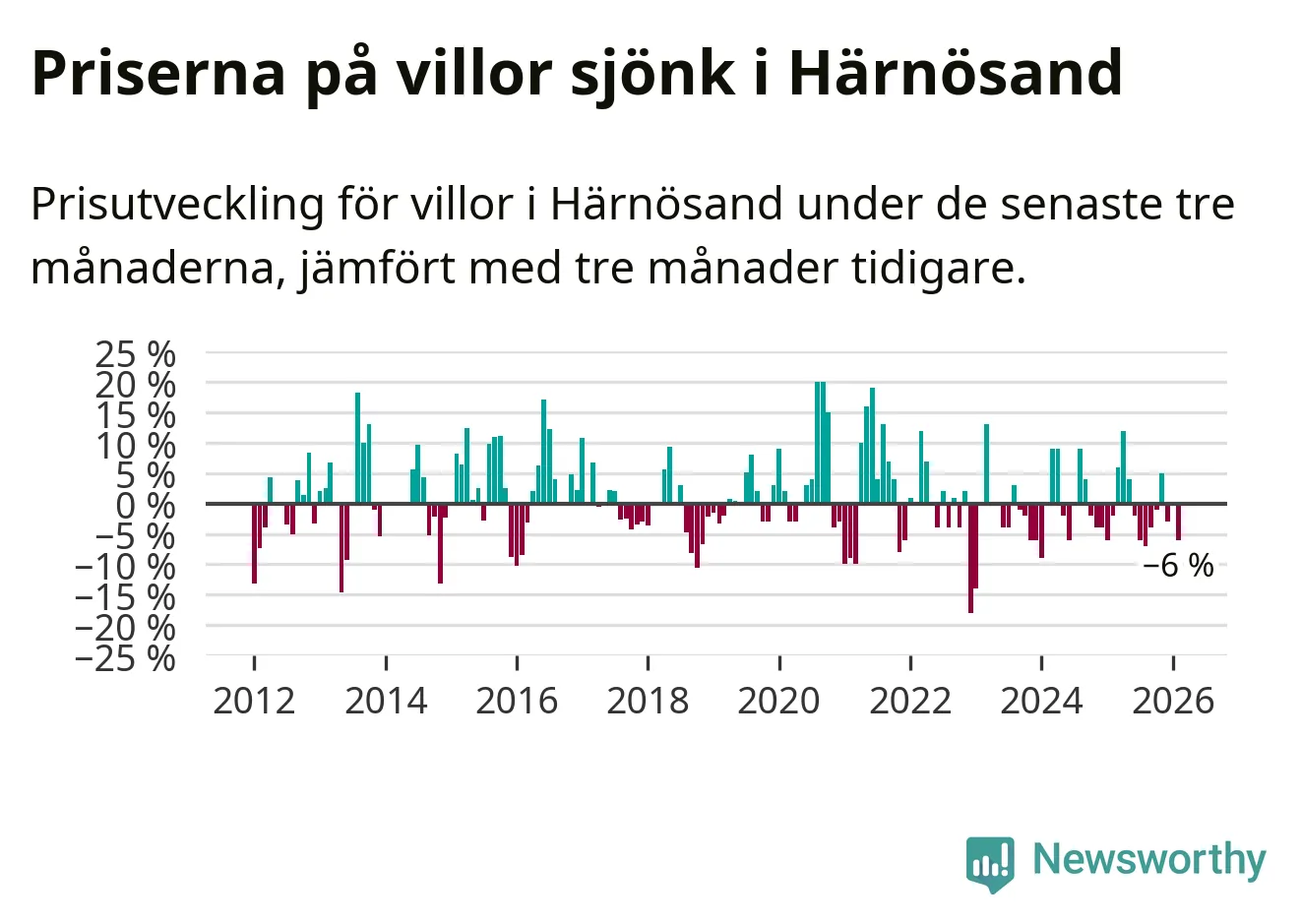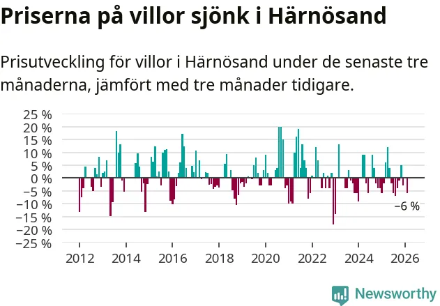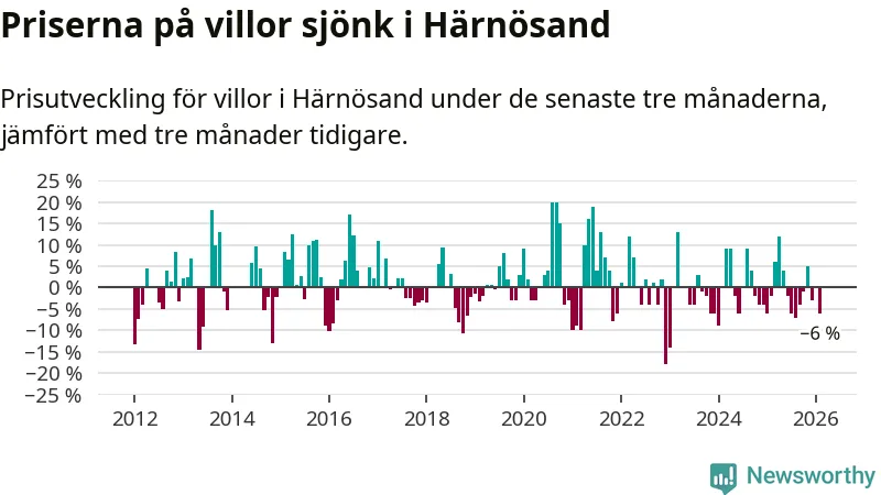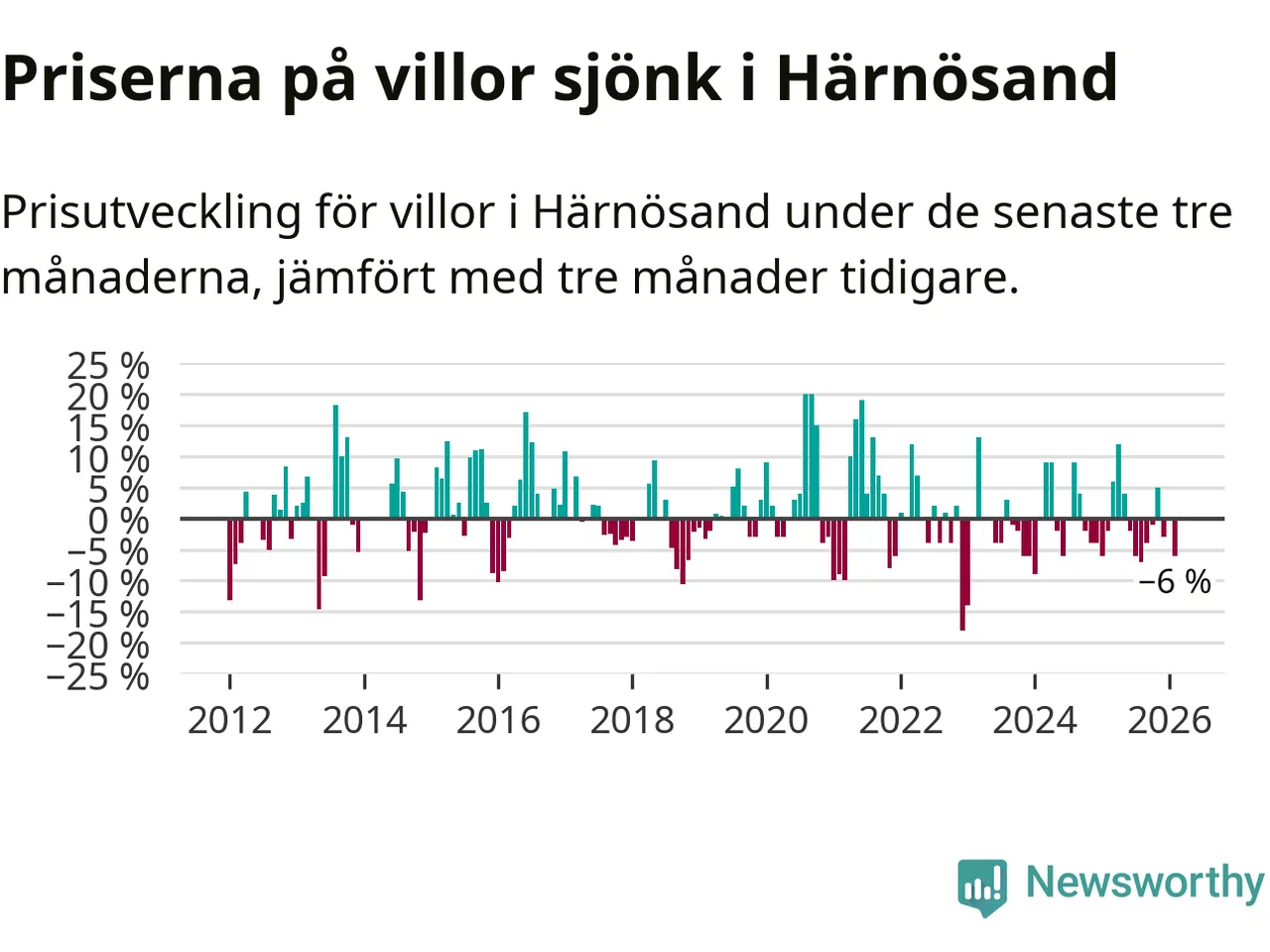 Villapriserna har gått ner i Härnösands kommun. Medelpriset på försäljningarna under de senaste tre månaderna visar på en nedgång med 6 procent.