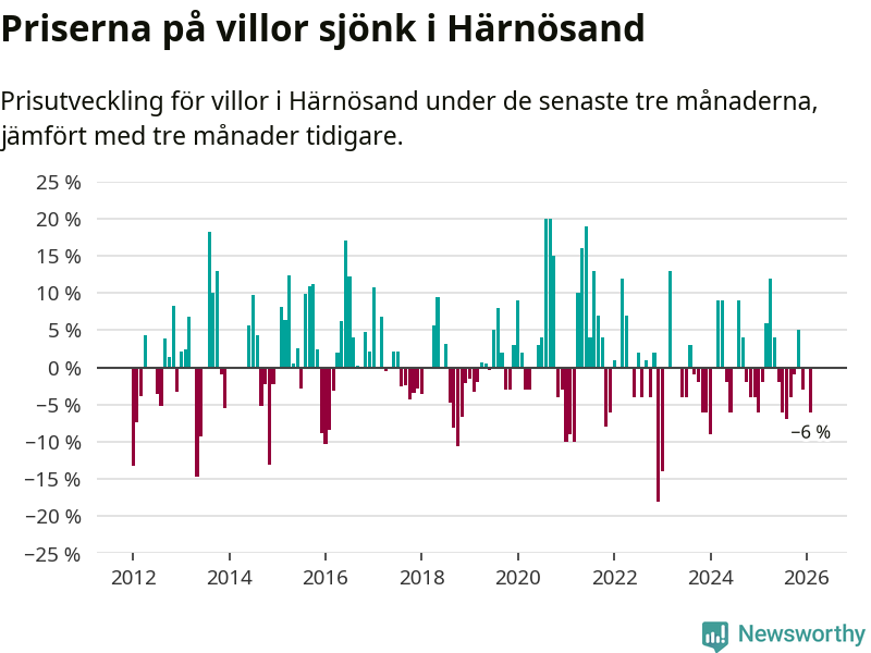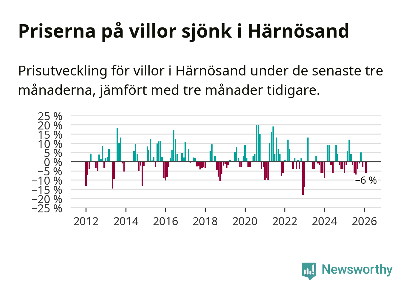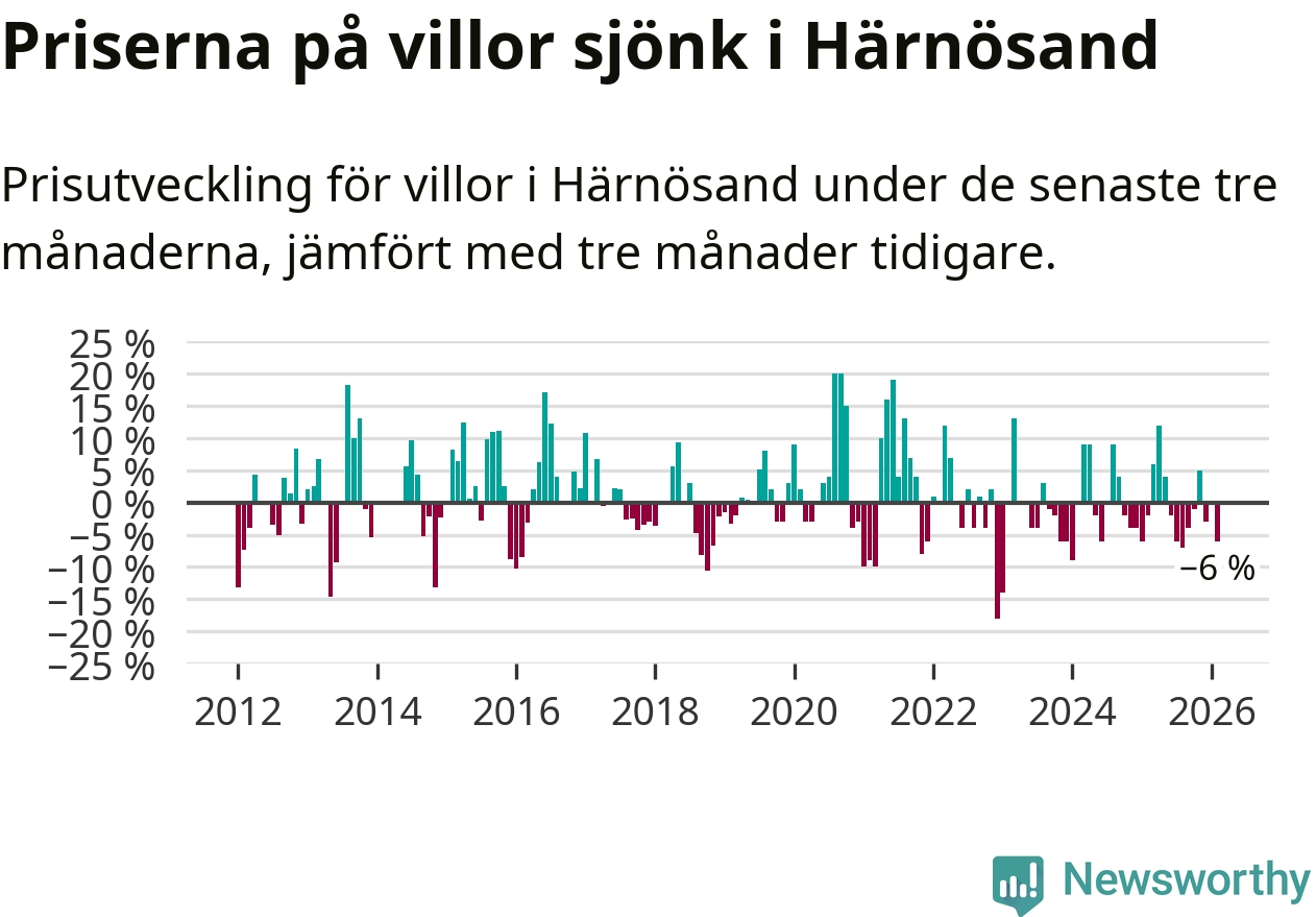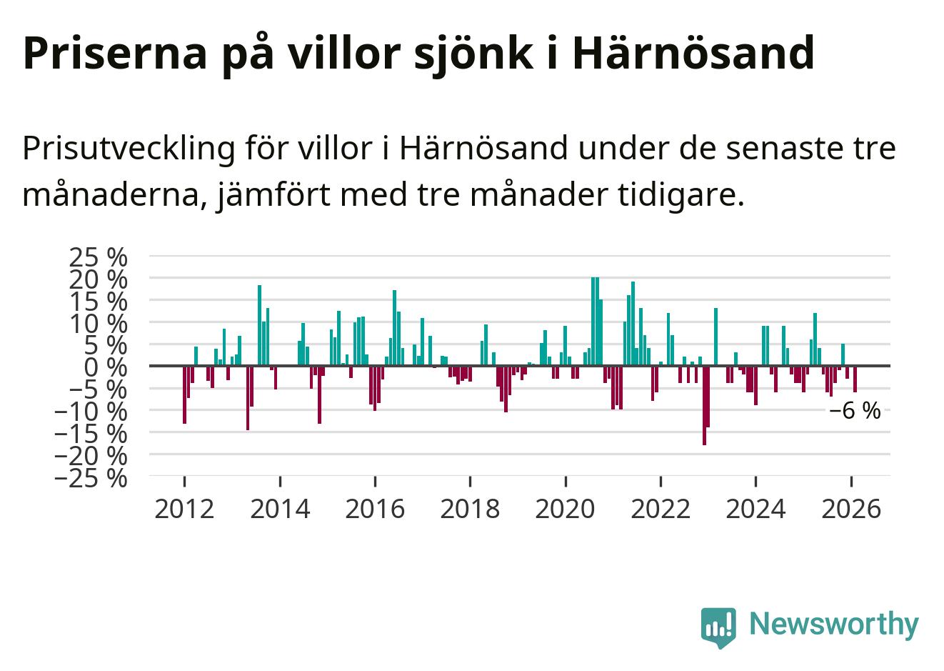 Villapriserna har gått ner i Härnösands kommun. Medelpriset på försäljningarna under de senaste tre månaderna visar på en nedgång med 6 procent.