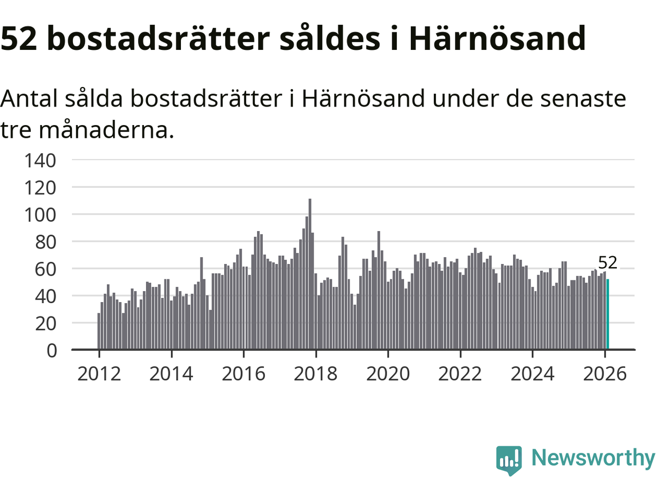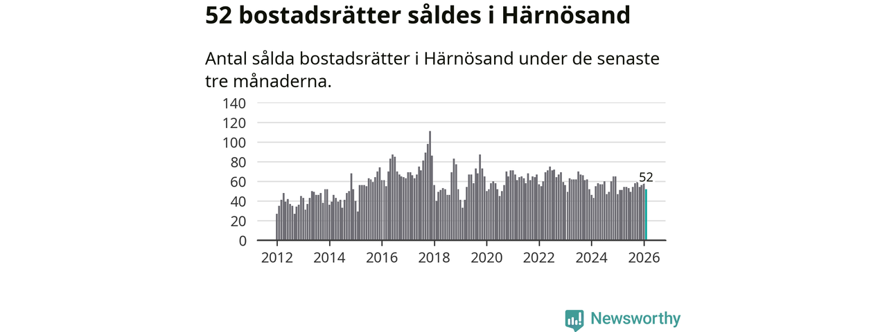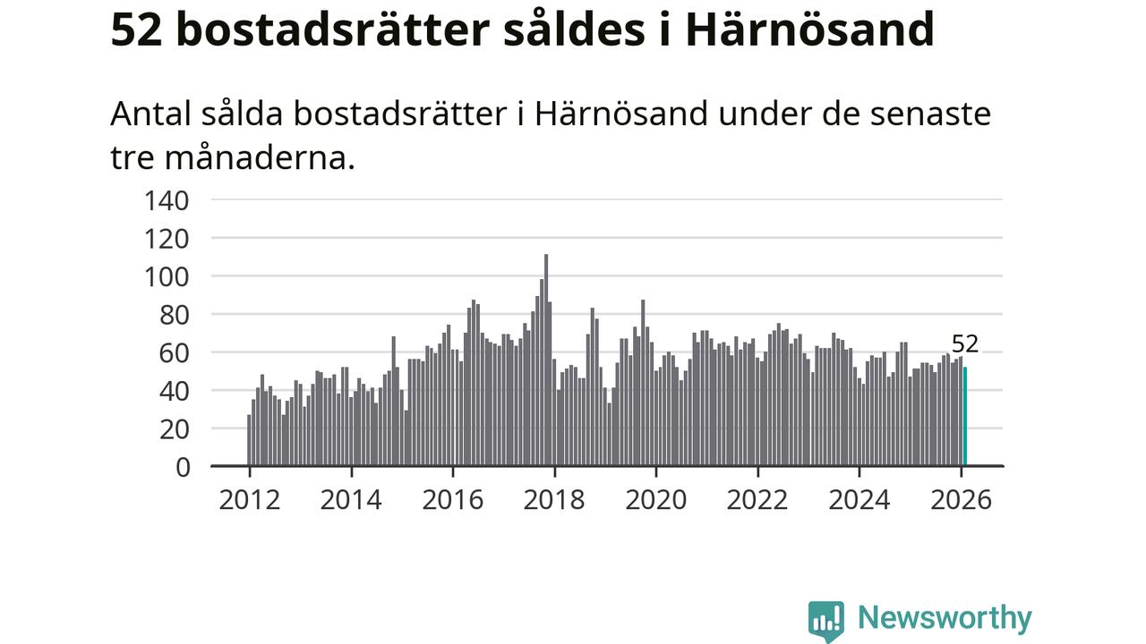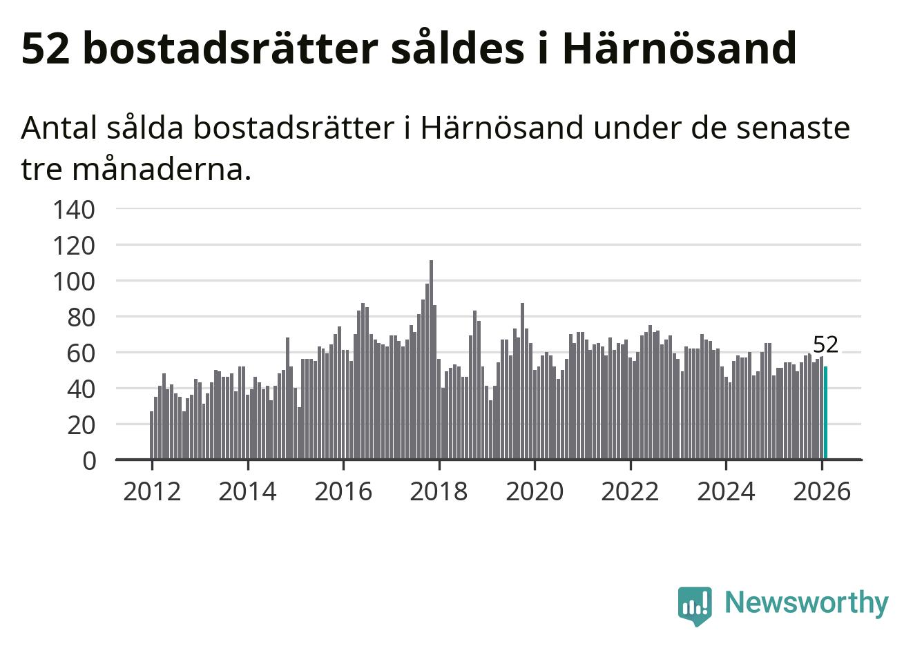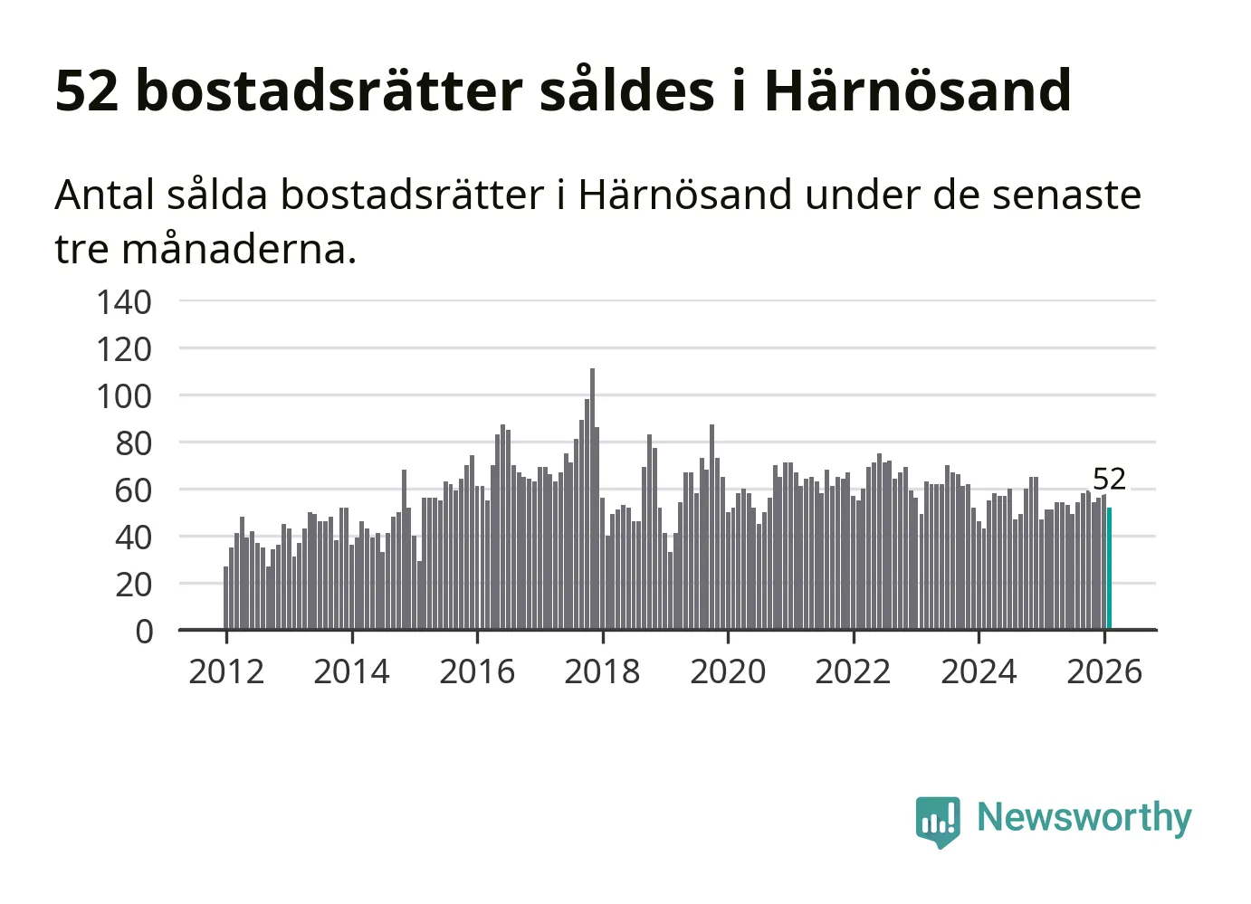 Sammanlagt såldes 52 bostadsrätter i Härnösands kommun mellan december och februari till ett genomsnittligt pris på 0,4 miljoner kronor. I fjol gjordes 51 affärer vid den här tiden på året.