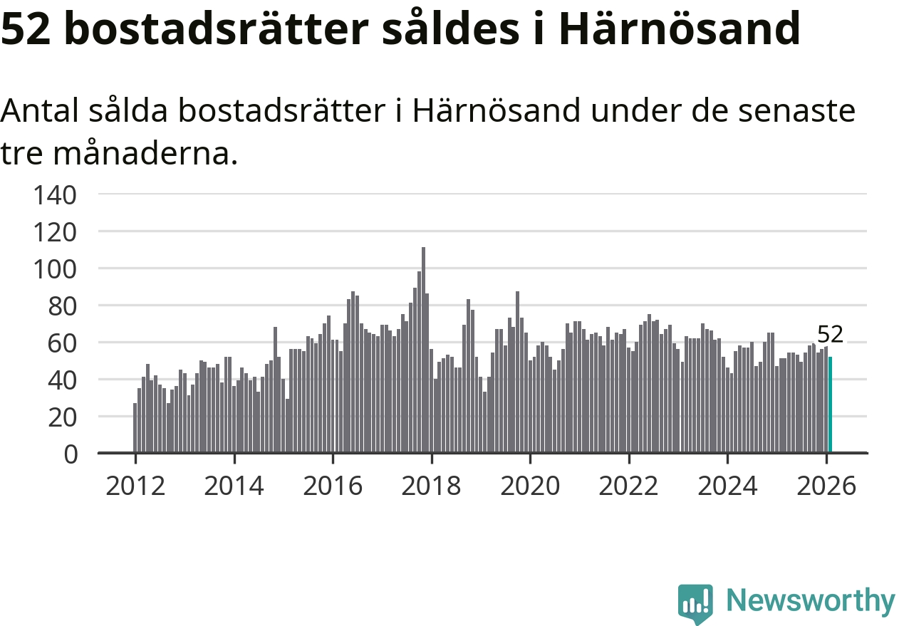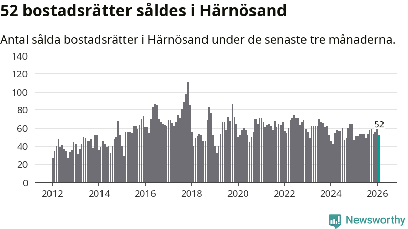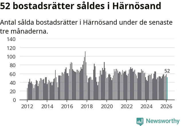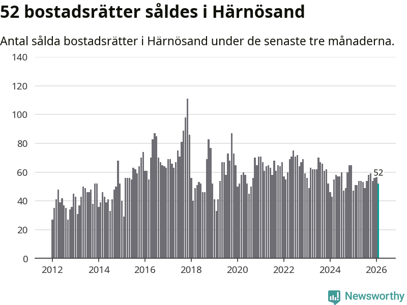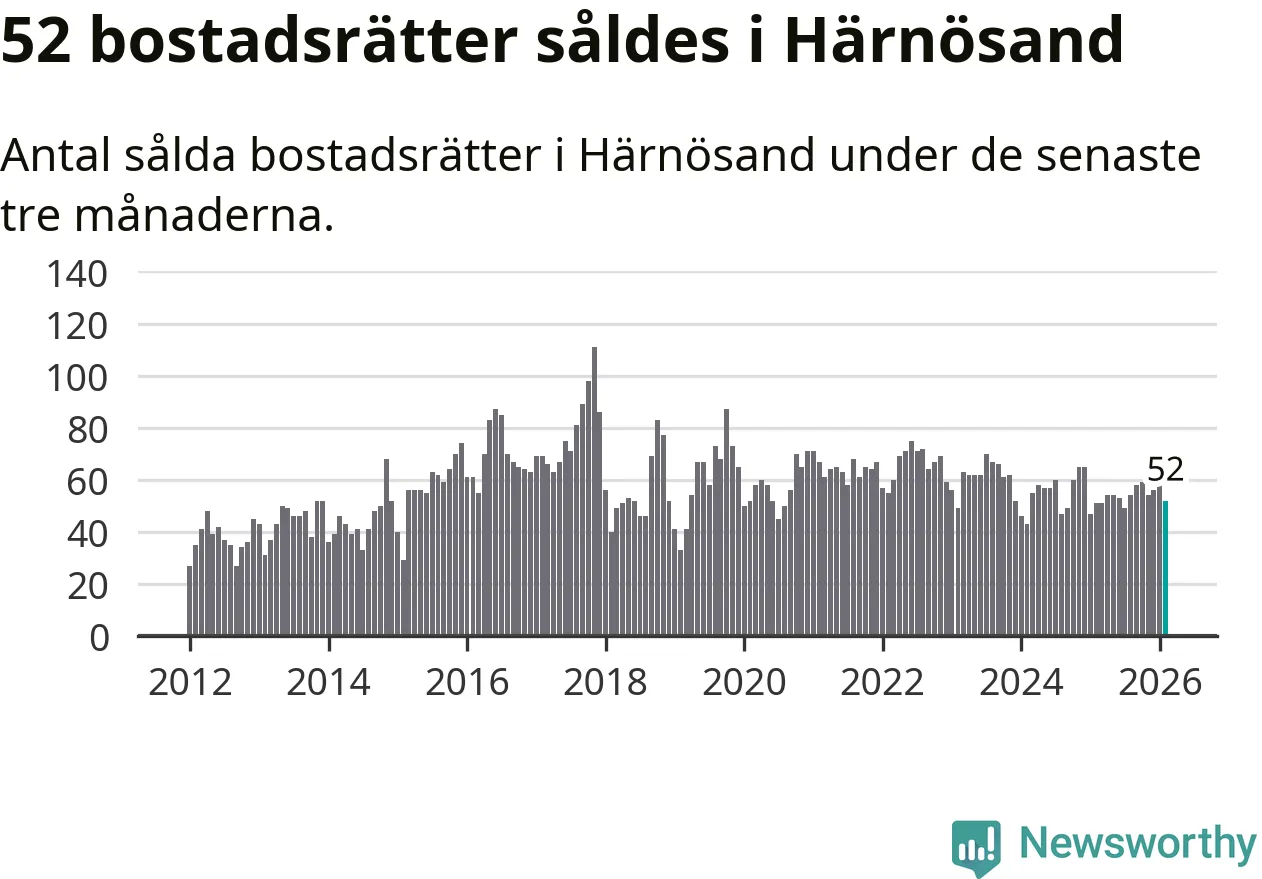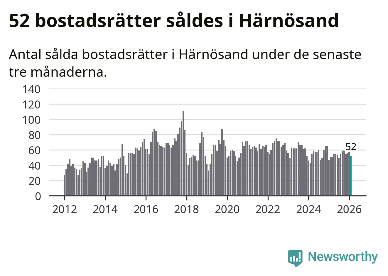 Sammanlagt såldes 52 bostadsrätter i Härnösands kommun mellan december och februari till ett genomsnittligt pris på 0,4 miljoner kronor. I fjol gjordes 51 affärer vid den här tiden på året.