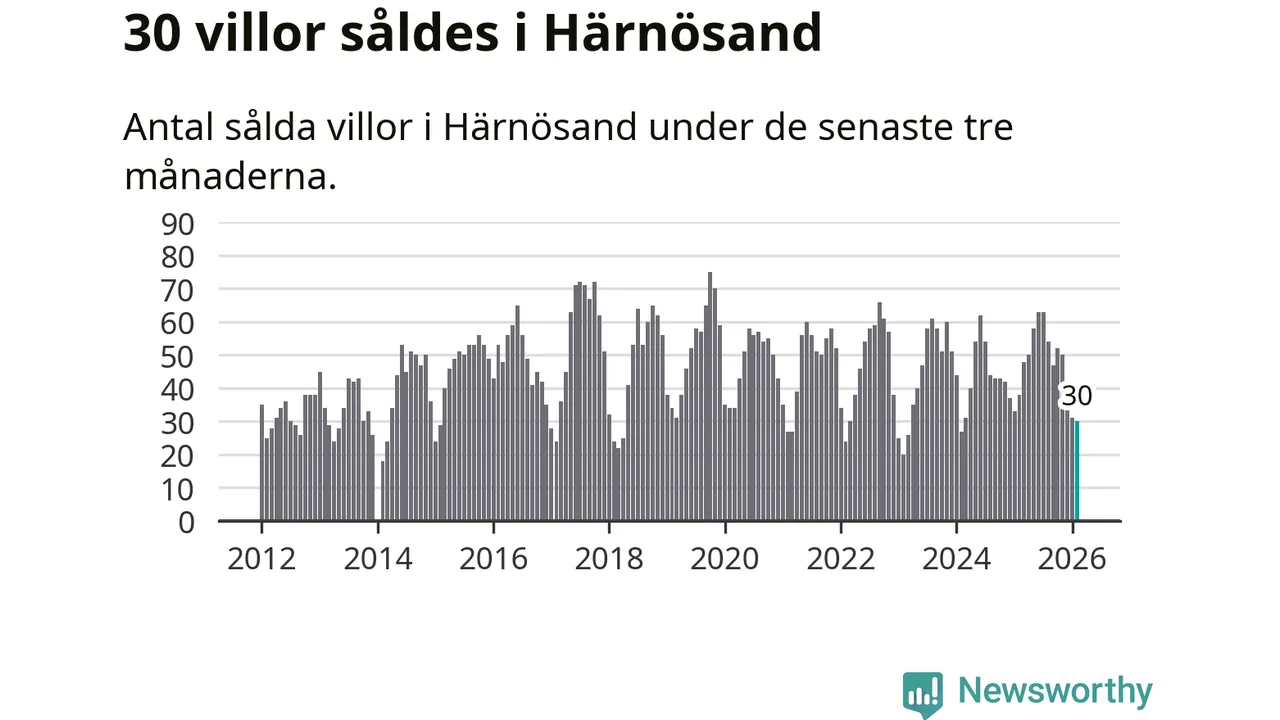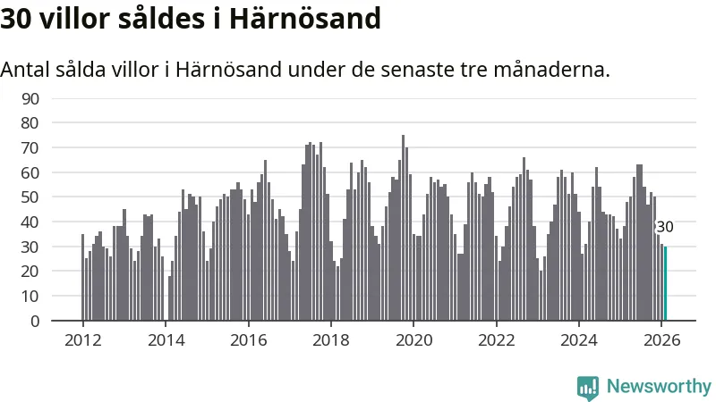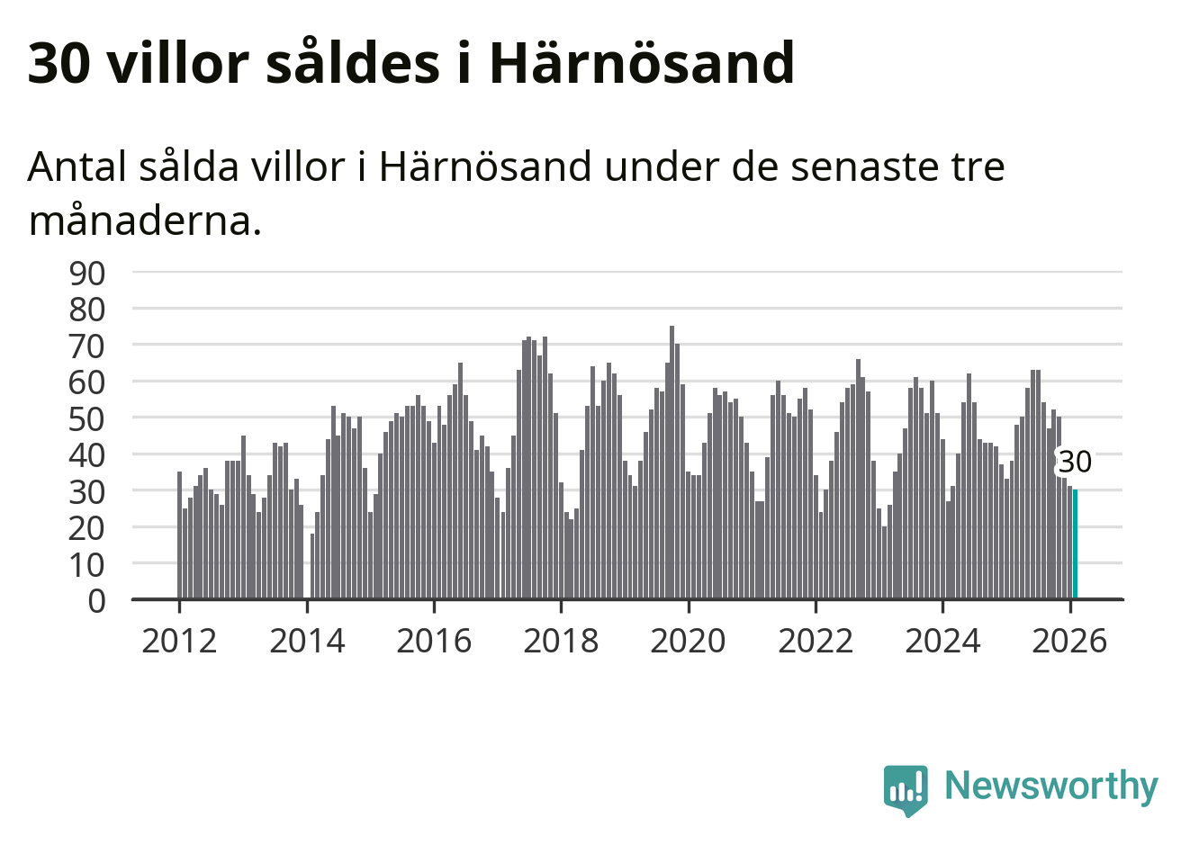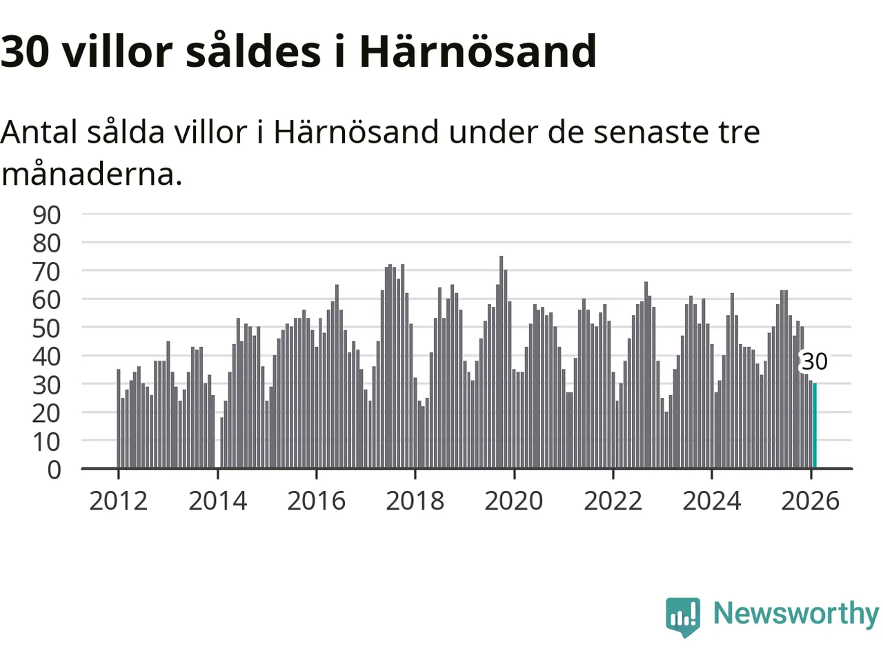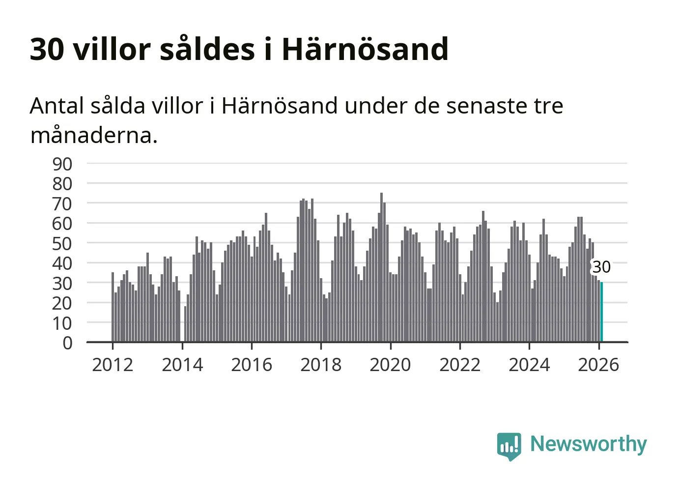 Sammanlagt såldes 30 villor i Härnösands kommun mellan december och februari till ett genomsnittligt pris på 1,4 miljoner kronor. I fjol gjordes 38 affärer vid den här tiden på året.