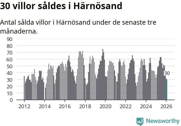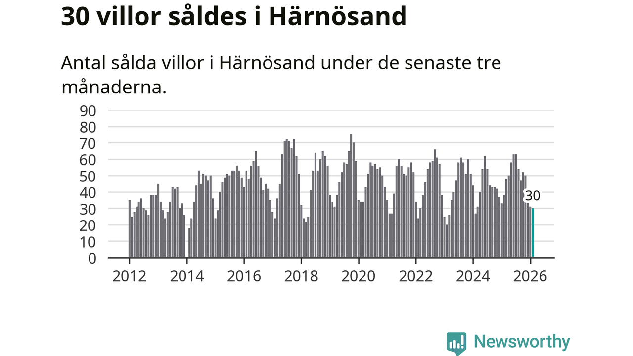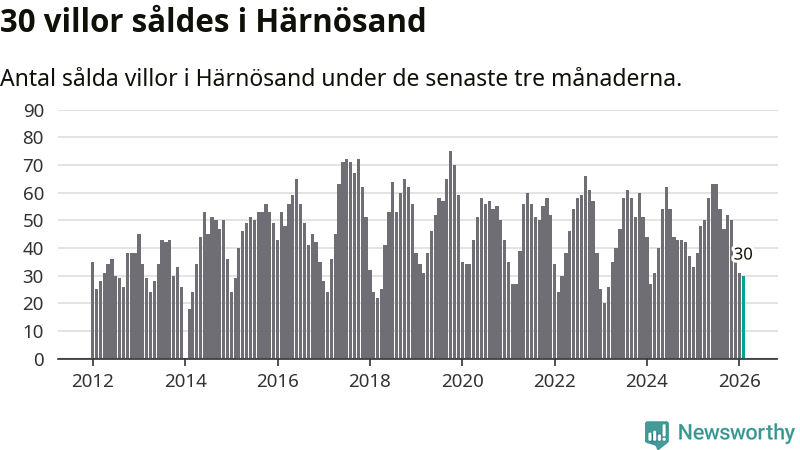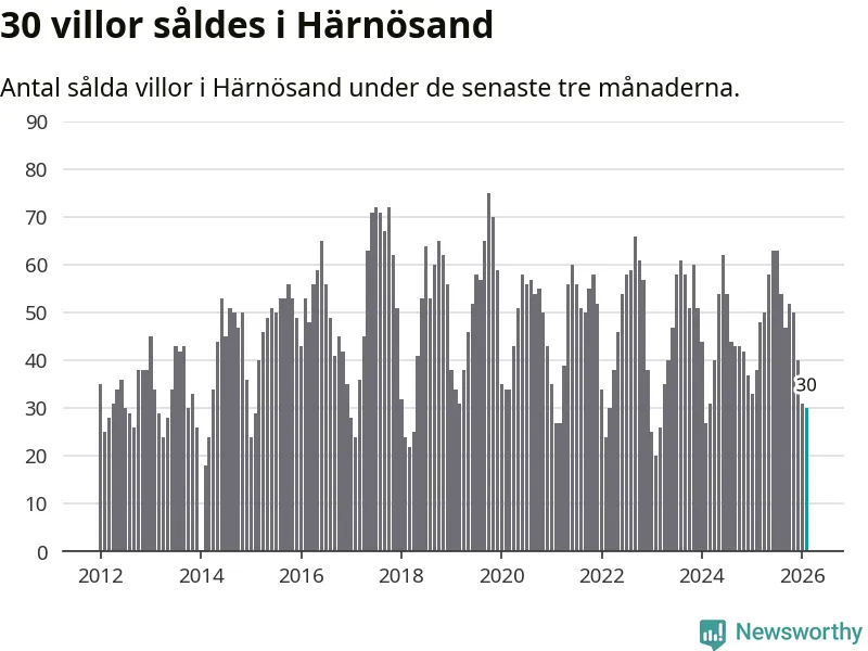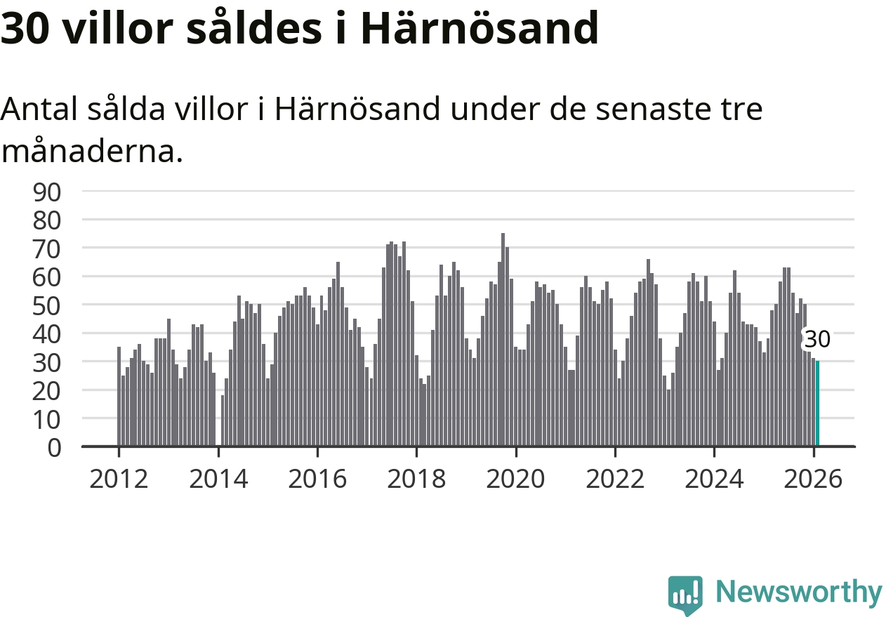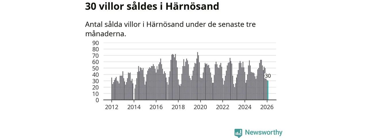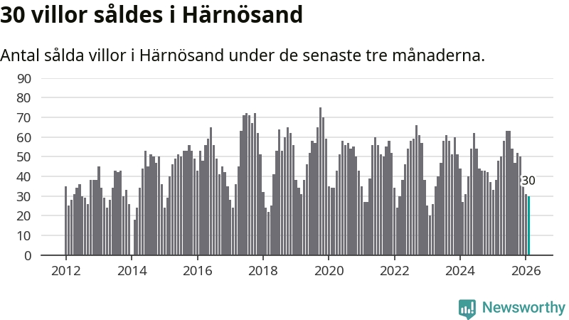 Sammanlagt såldes 30 villor i Härnösands kommun mellan december och februari till ett genomsnittligt pris på 1,4 miljoner kronor. I fjol gjordes 38 affärer vid den här tiden på året.