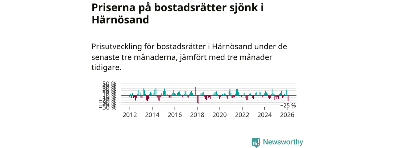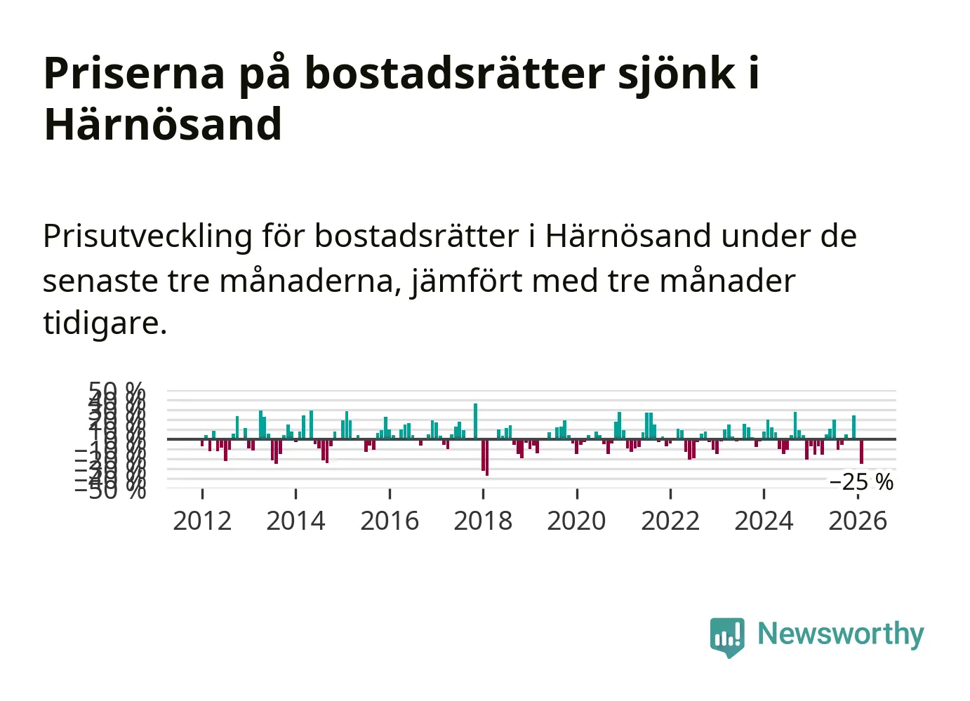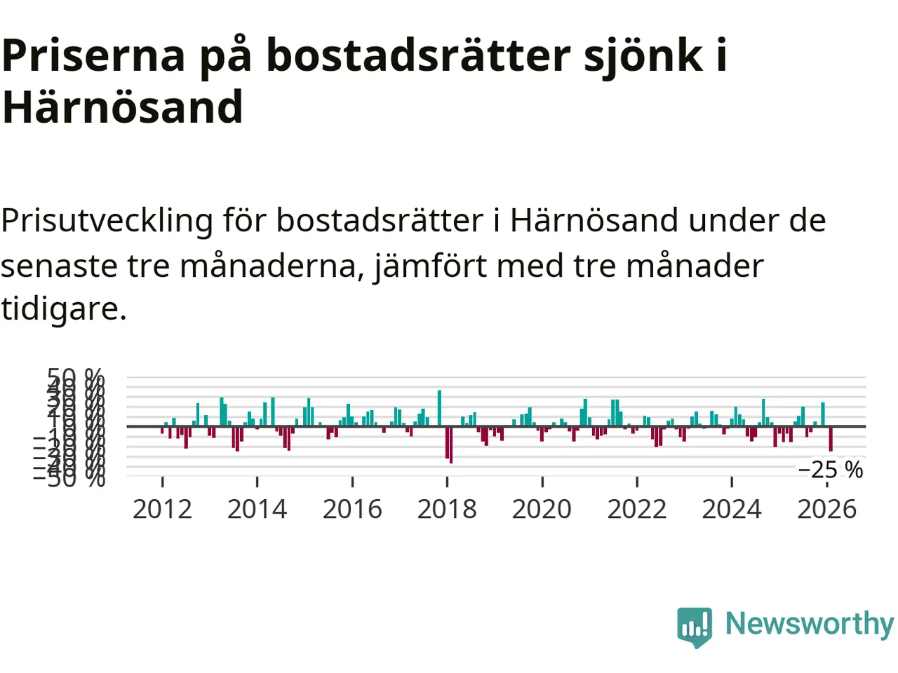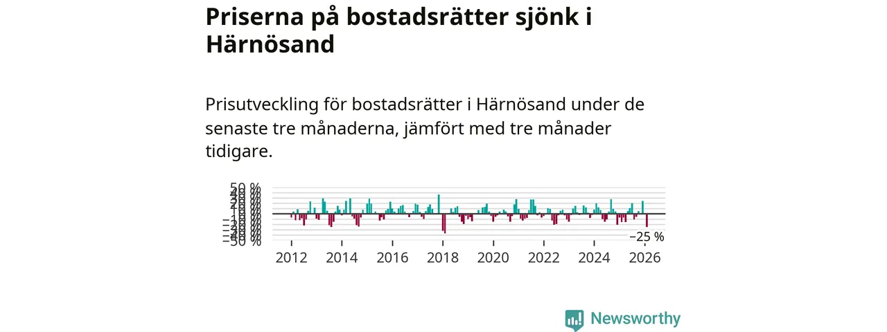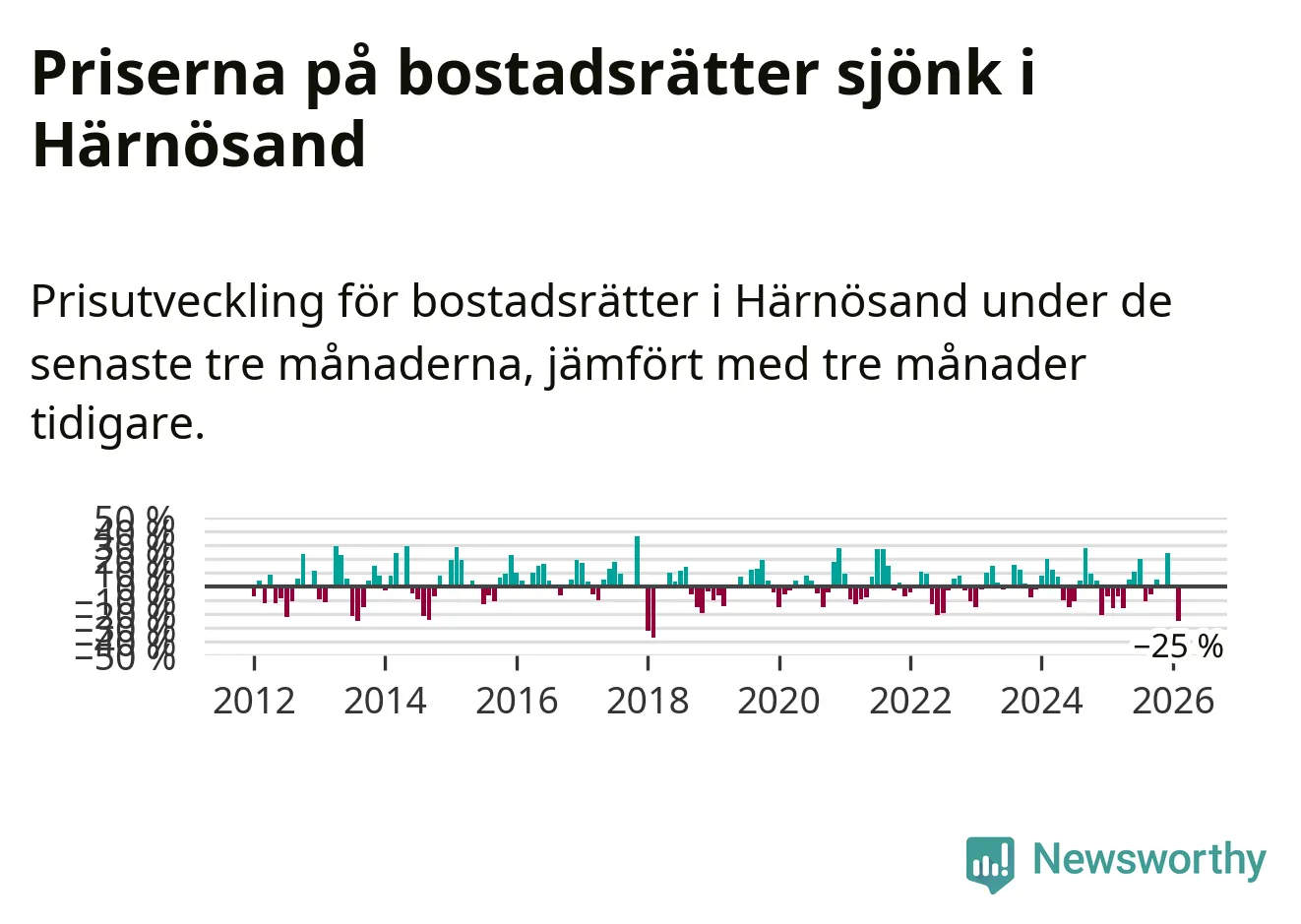Priserna på bostadsrätter sjönk med 25 procent i Härnösands kommun under de senaste tre månaderna. Det är den svagaste prisutvecklingen sedan 2018.