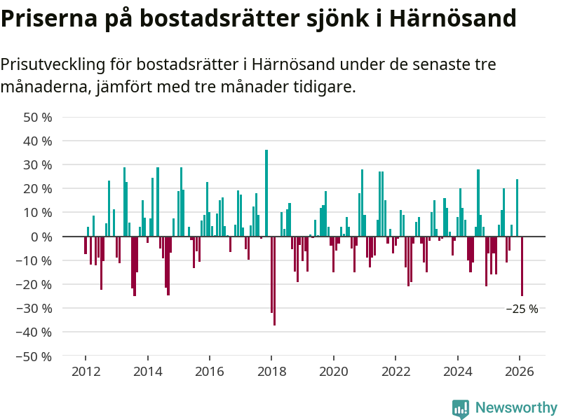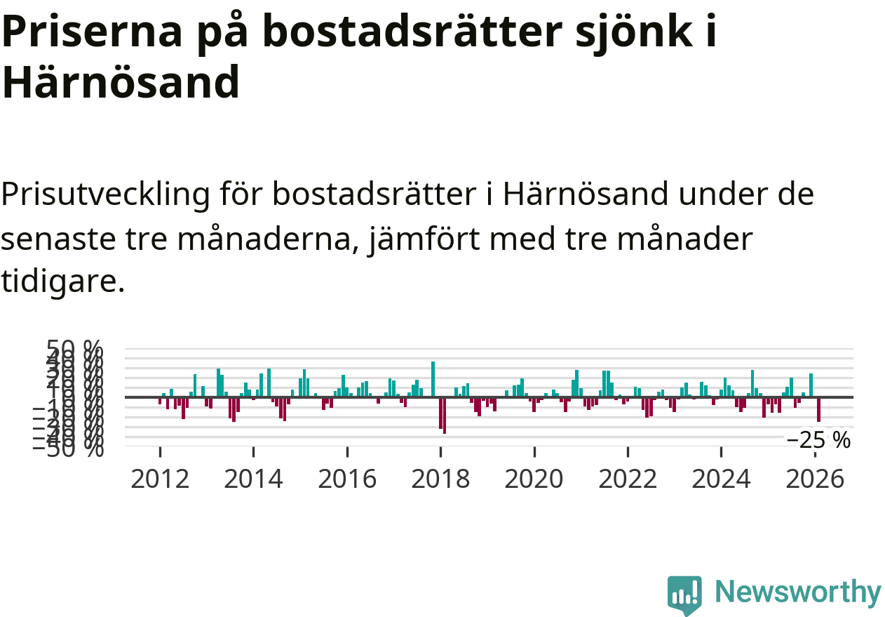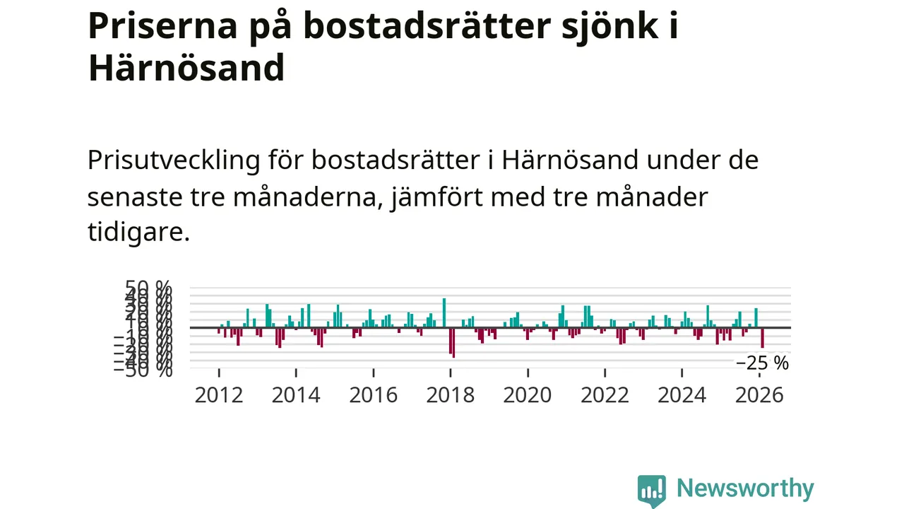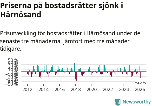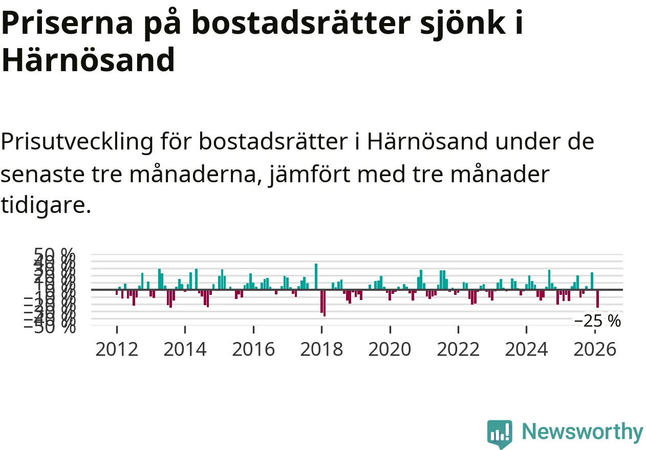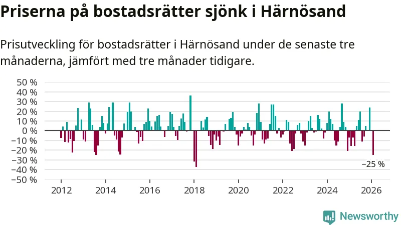 Priserna på bostadsrätter sjönk med 25 procent i Härnösands kommun under de senaste tre månaderna. Det är den svagaste prisutvecklingen sedan 2018.