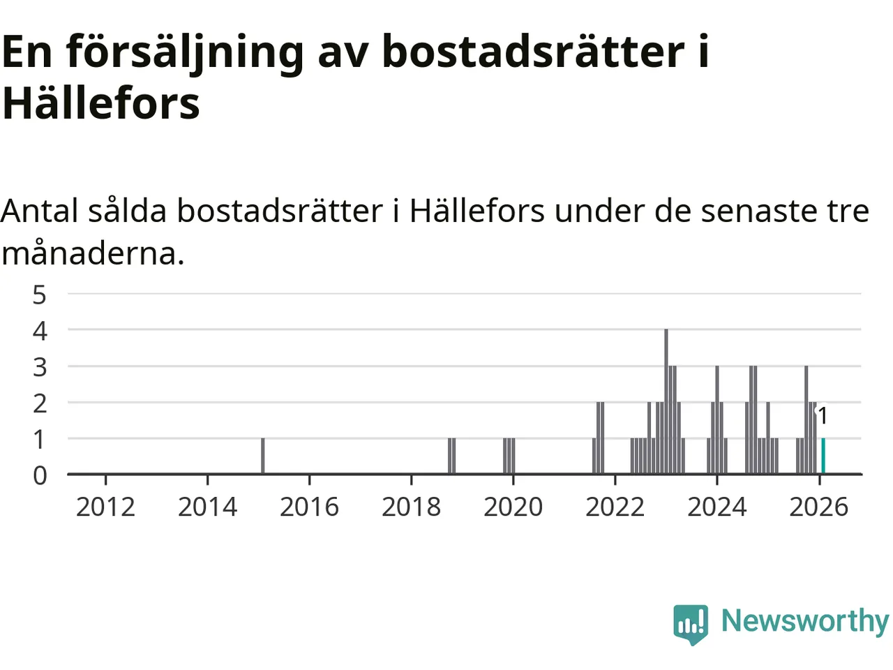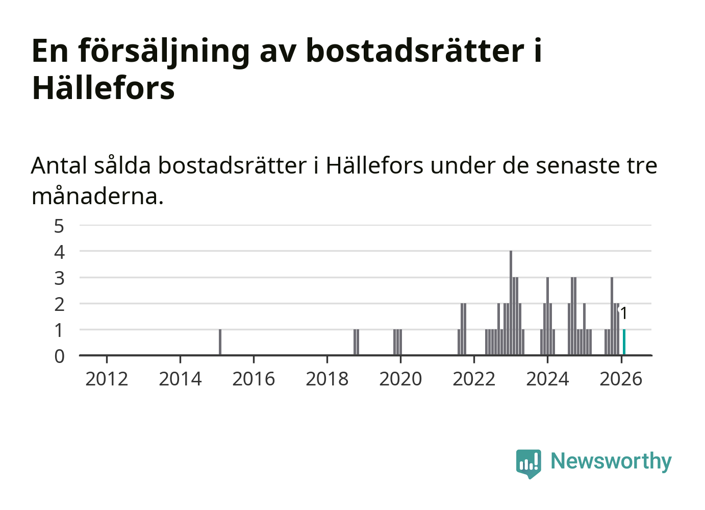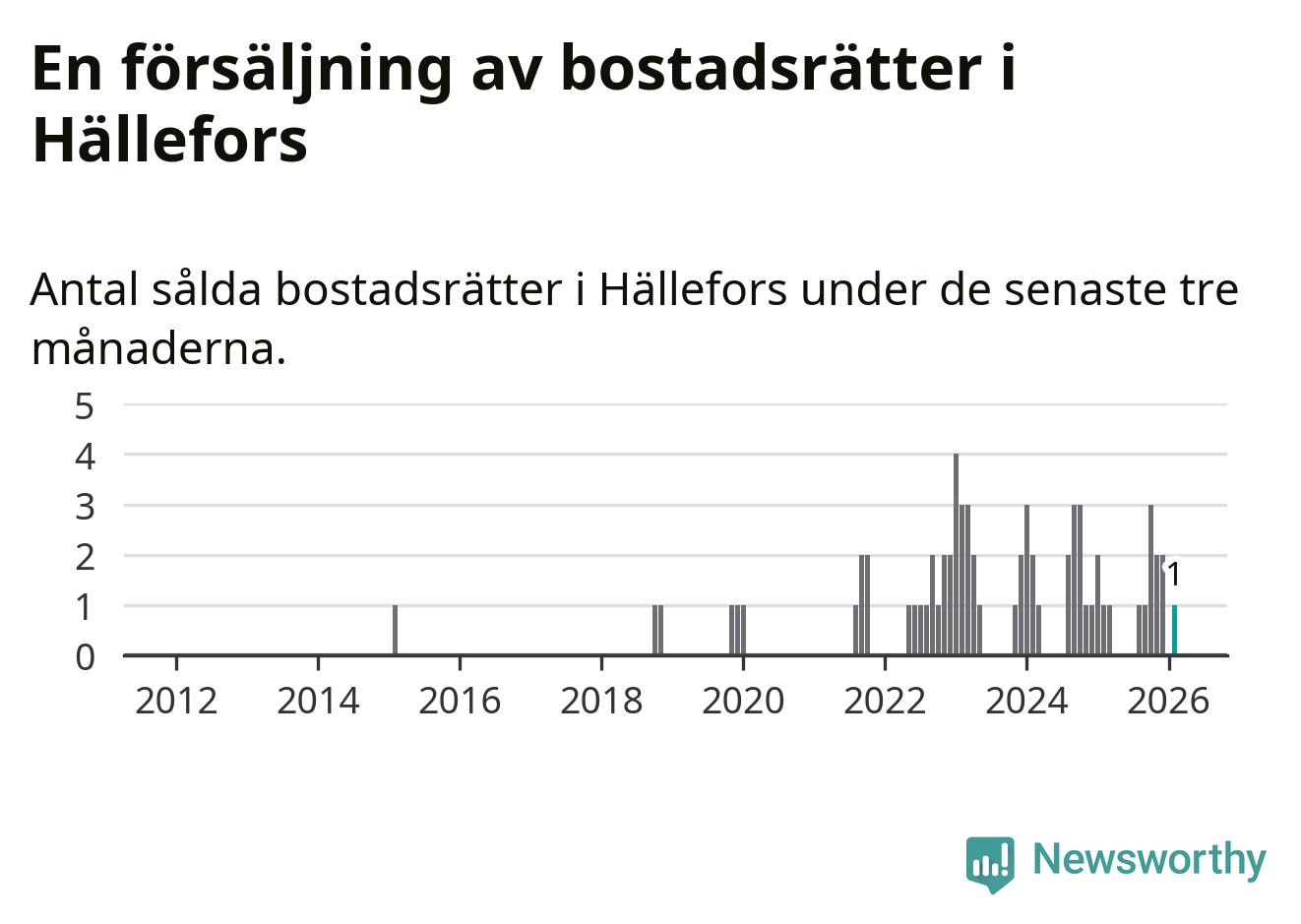 Mellan december och februari gjordes sammanlagt en affär med bostadsrätter i Hällefors kommun. Det är lika många affärer som vid motsvarande tid i fjol.