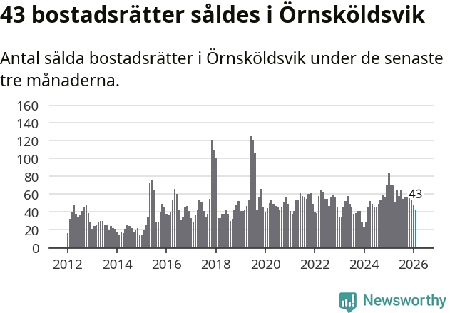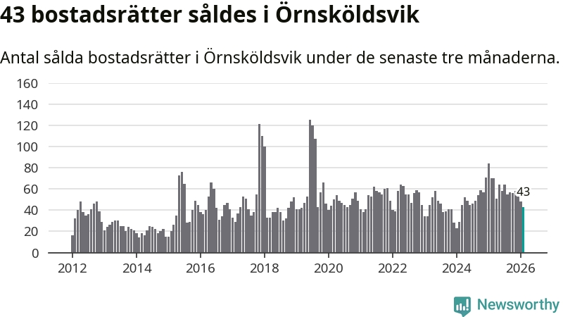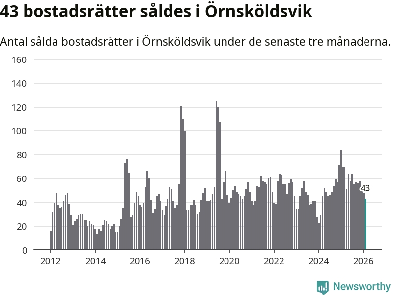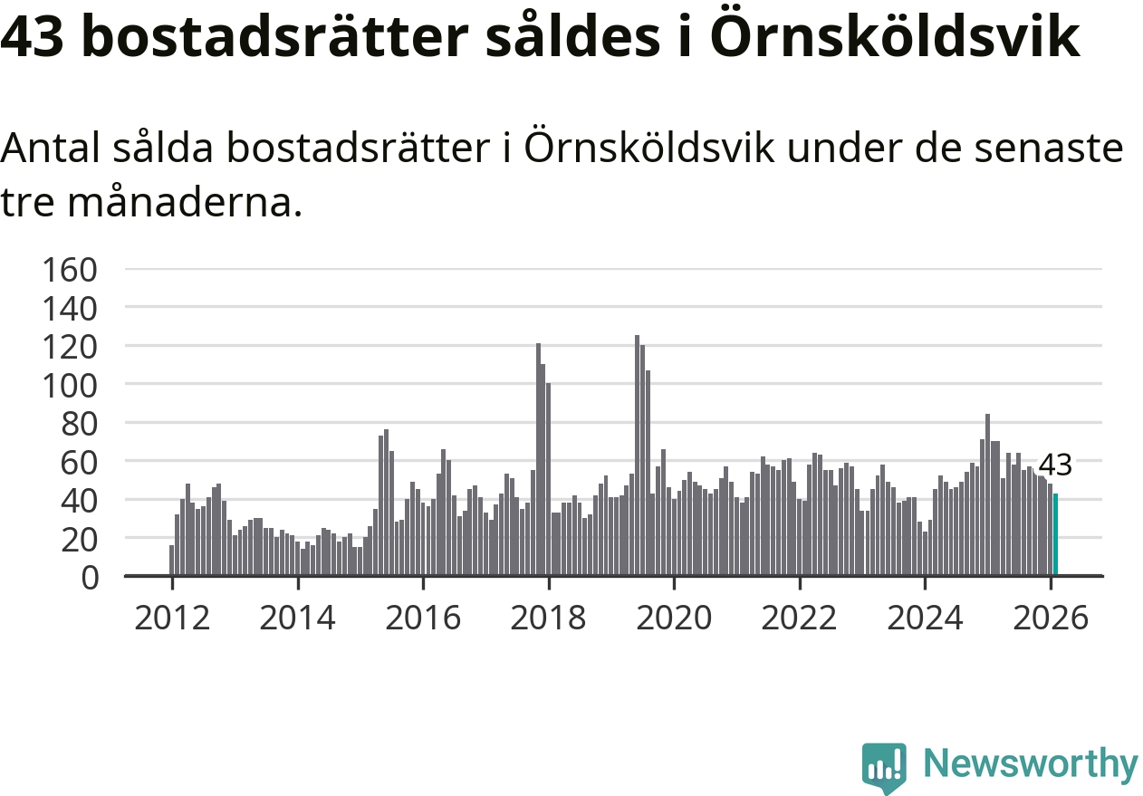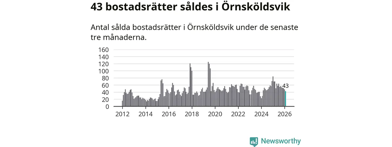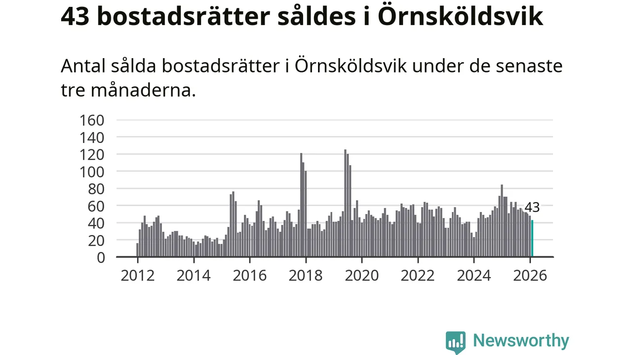 Sammanlagt såldes 43 bostadsrätter i Örnsköldsviks kommun mellan december och februari till ett genomsnittligt pris på 1,9 miljoner kronor. I fjol gjordes 70 affärer vid den här tiden på året.