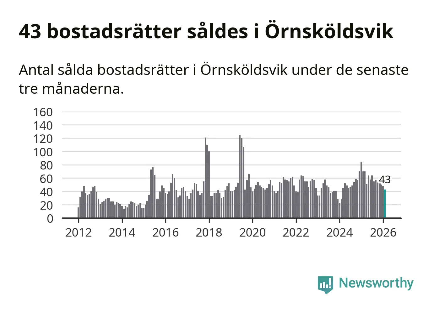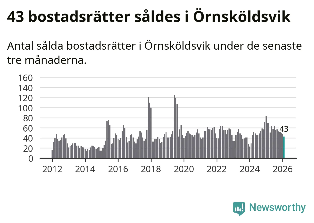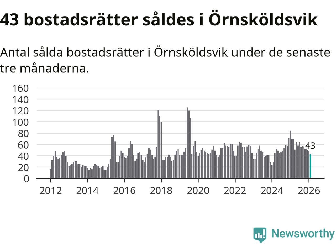 Sammanlagt såldes 43 bostadsrätter i Örnsköldsviks kommun mellan december och februari till ett genomsnittligt pris på 1,9 miljoner kronor. I fjol gjordes 70 affärer vid den här tiden på året.
