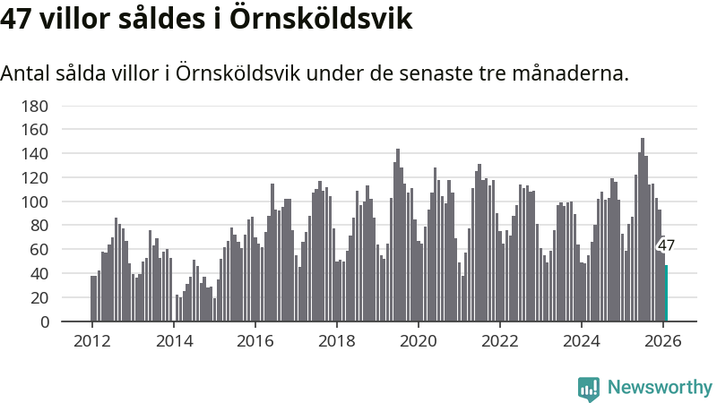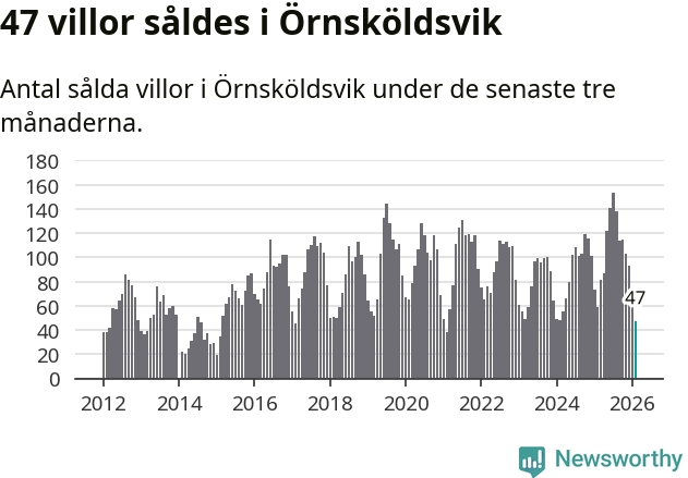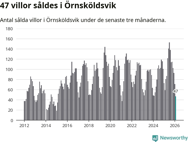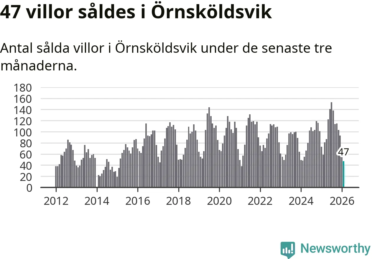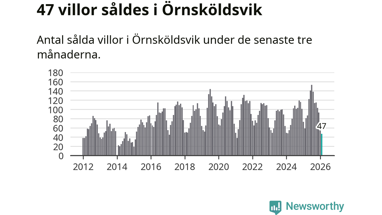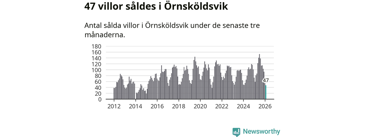 Sammanlagt såldes 47 villor i Örnsköldsviks kommun mellan december och februari till ett genomsnittligt pris på 1,8 miljoner kronor. Det är fler försäljningar än på fem år. I fjol gjordes 59 affärer vid den här tiden på året.
