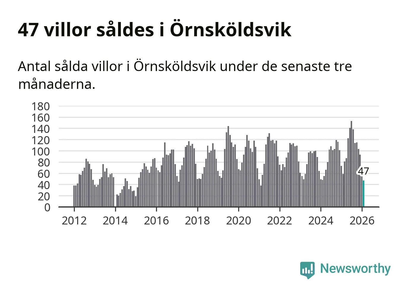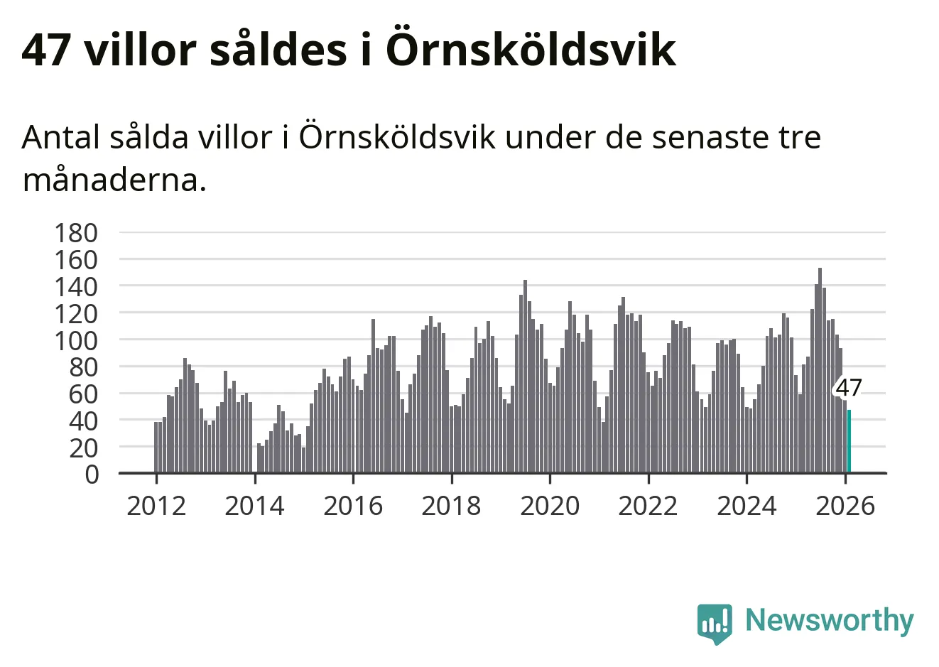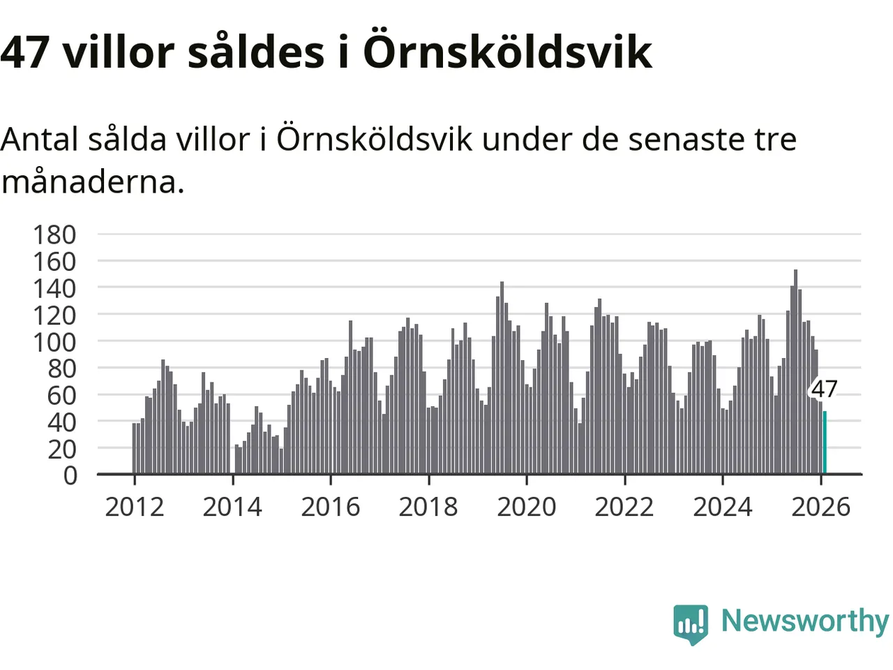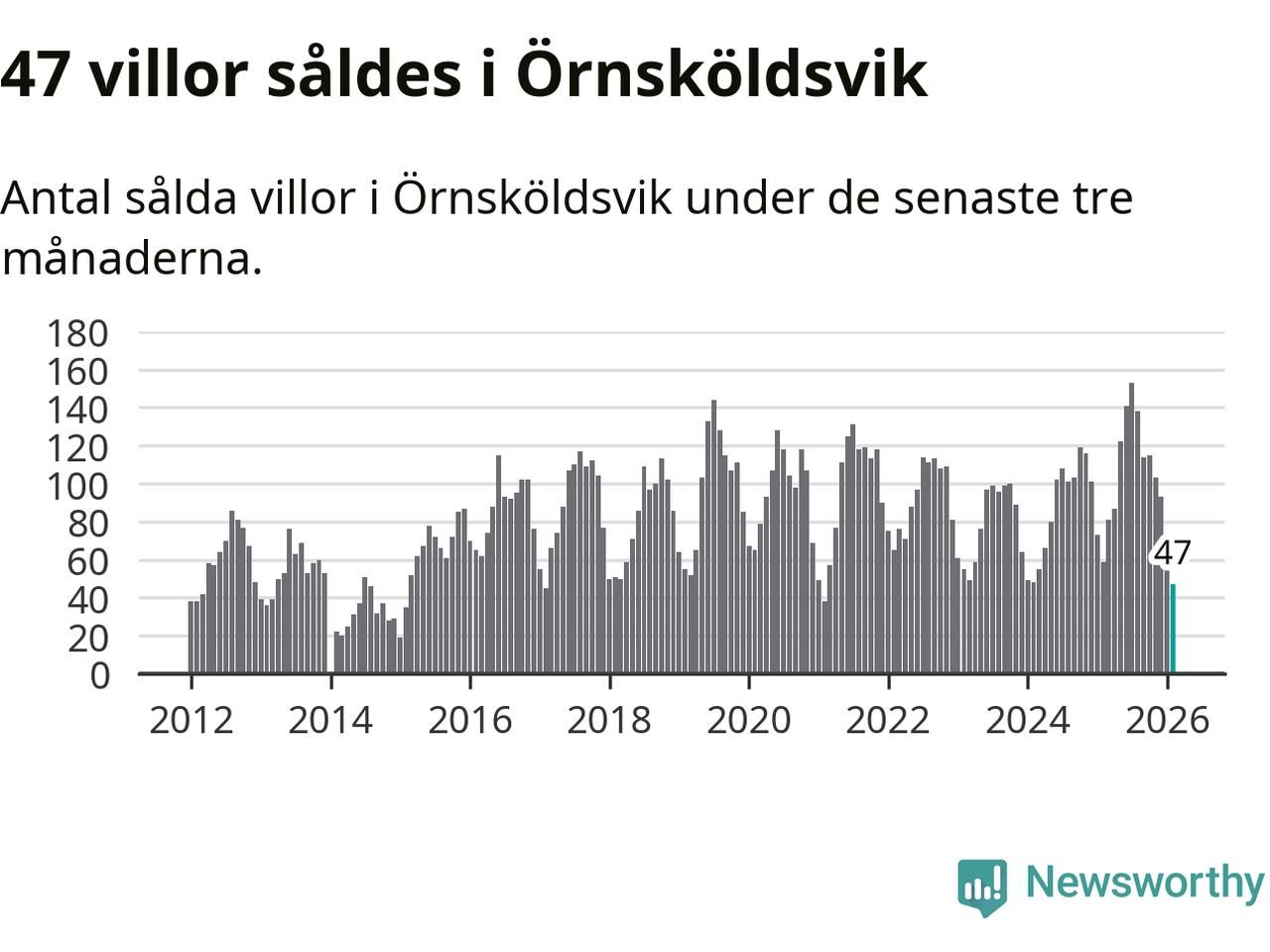 Sammanlagt såldes 47 villor i Örnsköldsviks kommun mellan december och februari till ett genomsnittligt pris på 1,8 miljoner kronor. Det är fler försäljningar än på fem år. I fjol gjordes 59 affärer vid den här tiden på året.